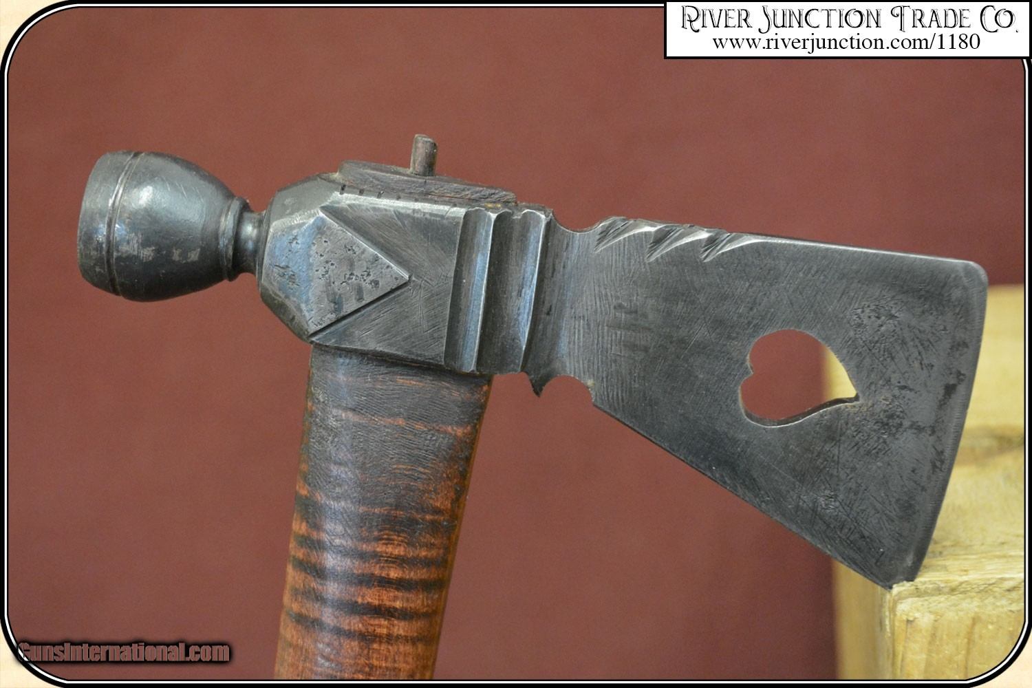 Description: The first time the term pipe tomahawk appeared in print was in 1710 when it was used to describe belt axes carried by four Iroquois Chiefs visiting Queen Anne in London.Both Indians and white men used pipe tomahawks. Indians, used tomahawks as a weapon until the end of the Indian Wars. Even after that, it remained important to the Indians as it had great symbolic and spiritual significance to them. Pipe tomahawks were produced in a variety of shapes and sizes. Most were plain but some were inlaid and engraved in a manner rivaling the best custom-made rifles of the day. This pipe tomahawk is mostly done by hand, with a file. It is authentic and is copied from a photo in one of the three major works on pipe tomahawks published in the last fifty years. The manner of attaching the head to the handle is from the late period (e.g. the head is upon from the front of the handle. This is done because the hatchet has a straight eye as opposed to a tapered eye. Payment Cash, postal money order, cashiers check, personal & business checks. Can be ordered with a credit card or paypal on our (riverjunction) just type in the number (1180) in the search box. We always answer questions and entertain offers. SOLD |