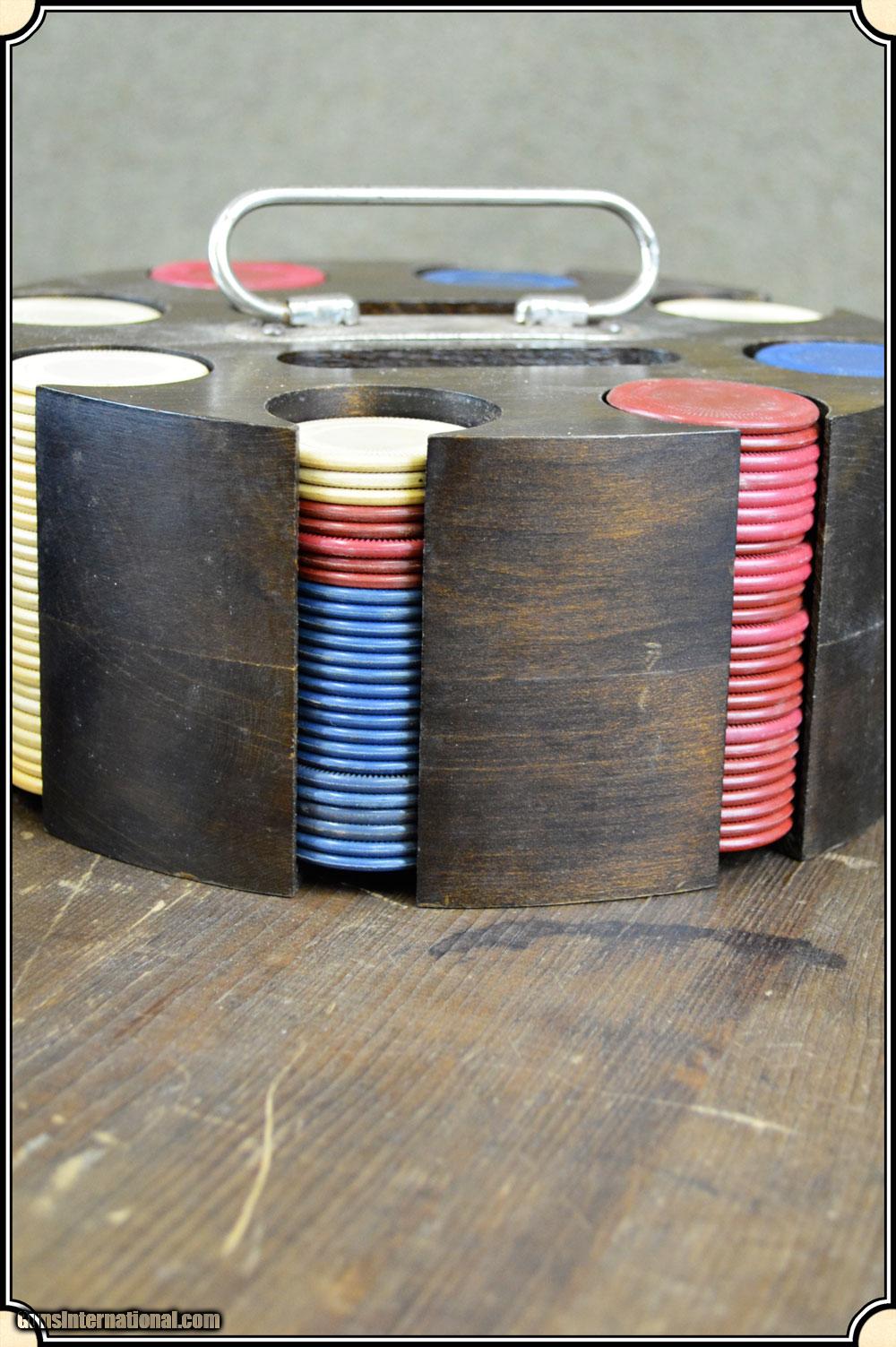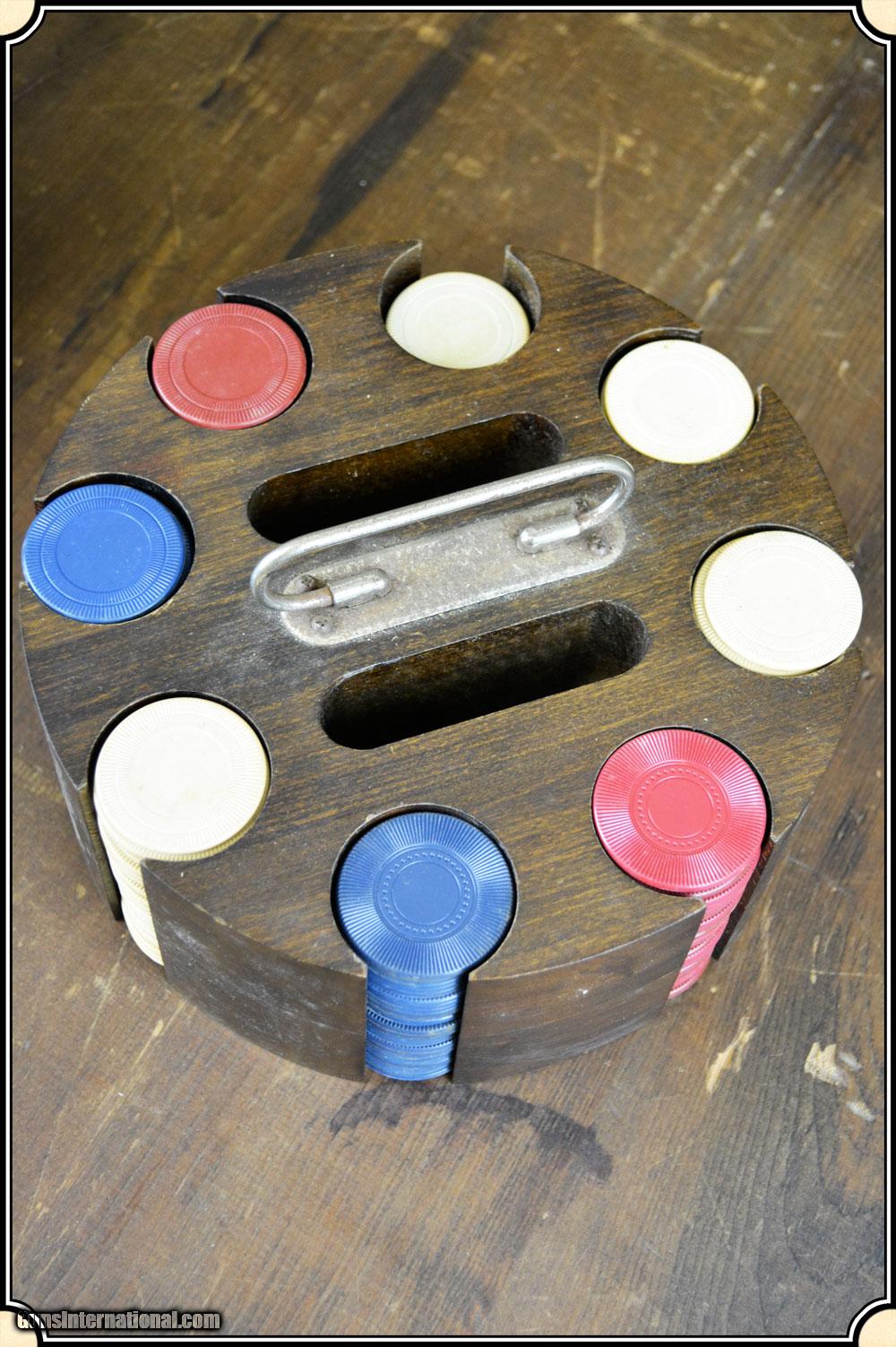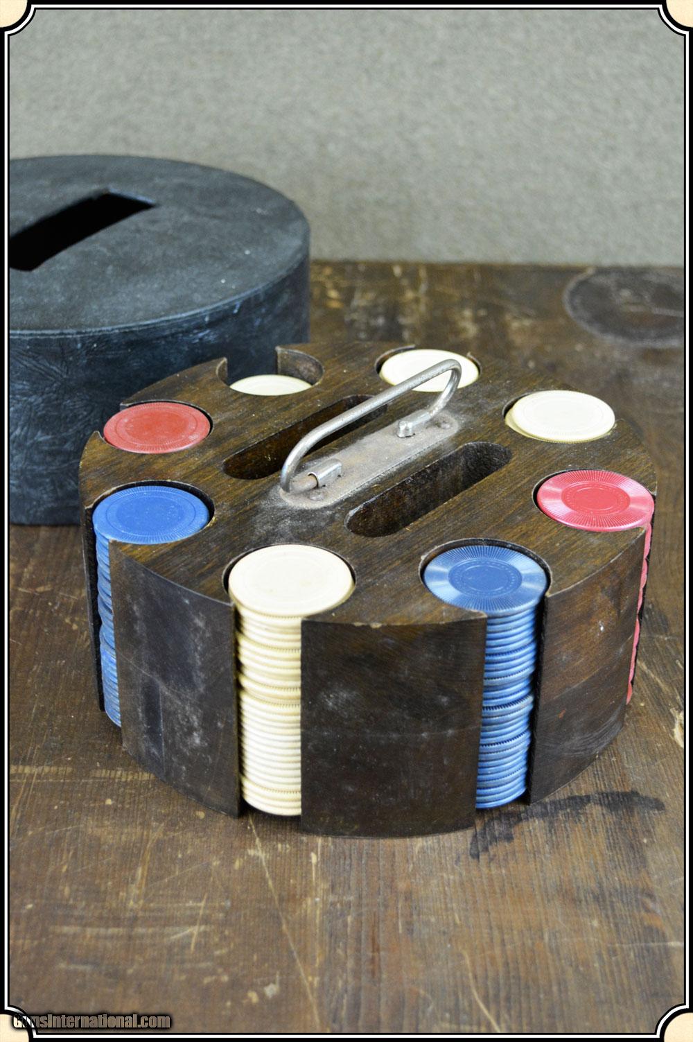 Description: Large Gambler's Poker Set. These are vintage clay poker chips that are in a fine solid walnut case that also has slots for two decks of cards as well as the chips. The case has a nickle handle and a pasteboard cover. There are a total of 200 chips that are 1.5 in. in diameter with no markings. There are 75 ivory colored, 60 blue colored, and 50 red colored. They are not chipped or cracked. It is a real nice set. The case shows some old scratches but not bad for its age. PAYMENT Cash, postal money order, cashiers check, personal & business checks. May order at riverjucntion on-line with credit card. SOLD |