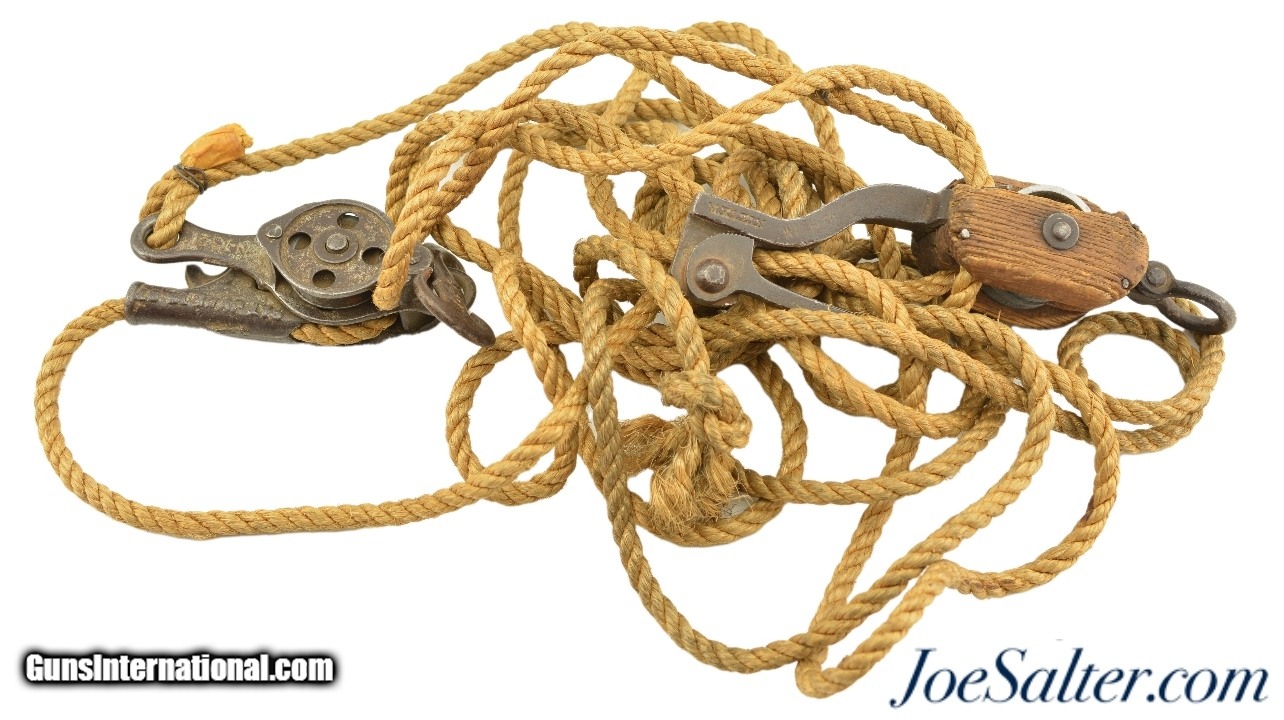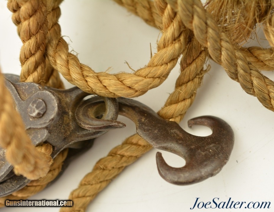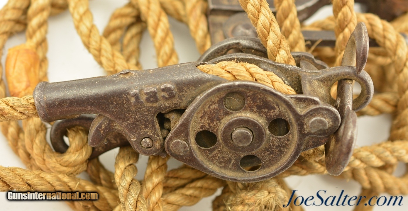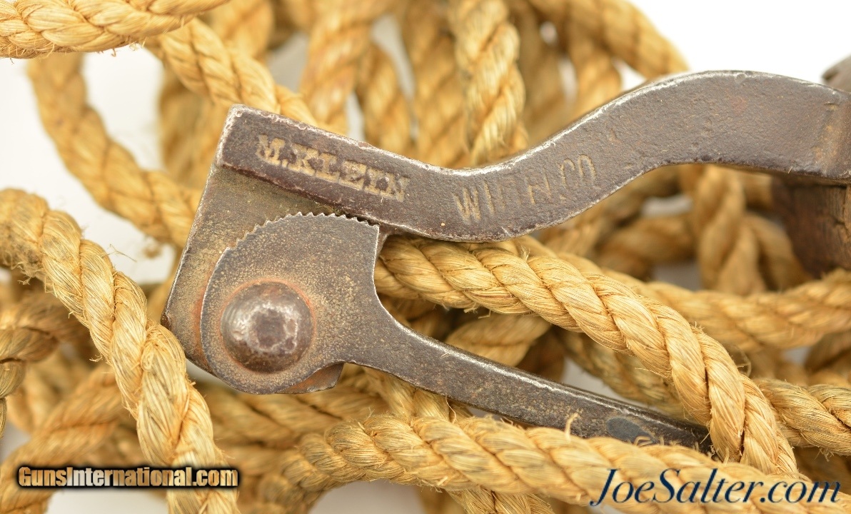 Description: This is an antique M. Klein Fence Wire Wood Block & Tackle Puller also marked WINN Co. One piece head with wood and steel construction in very good original condition with chipped end top. This is connected to another pulley of possibly another makers barbed wire pulley with a patent date of June 18 1887, this would make it a very early tool. The hemp rope is also in nice condition. Great for display in any collection. Price: $69.00 Contact Seller |