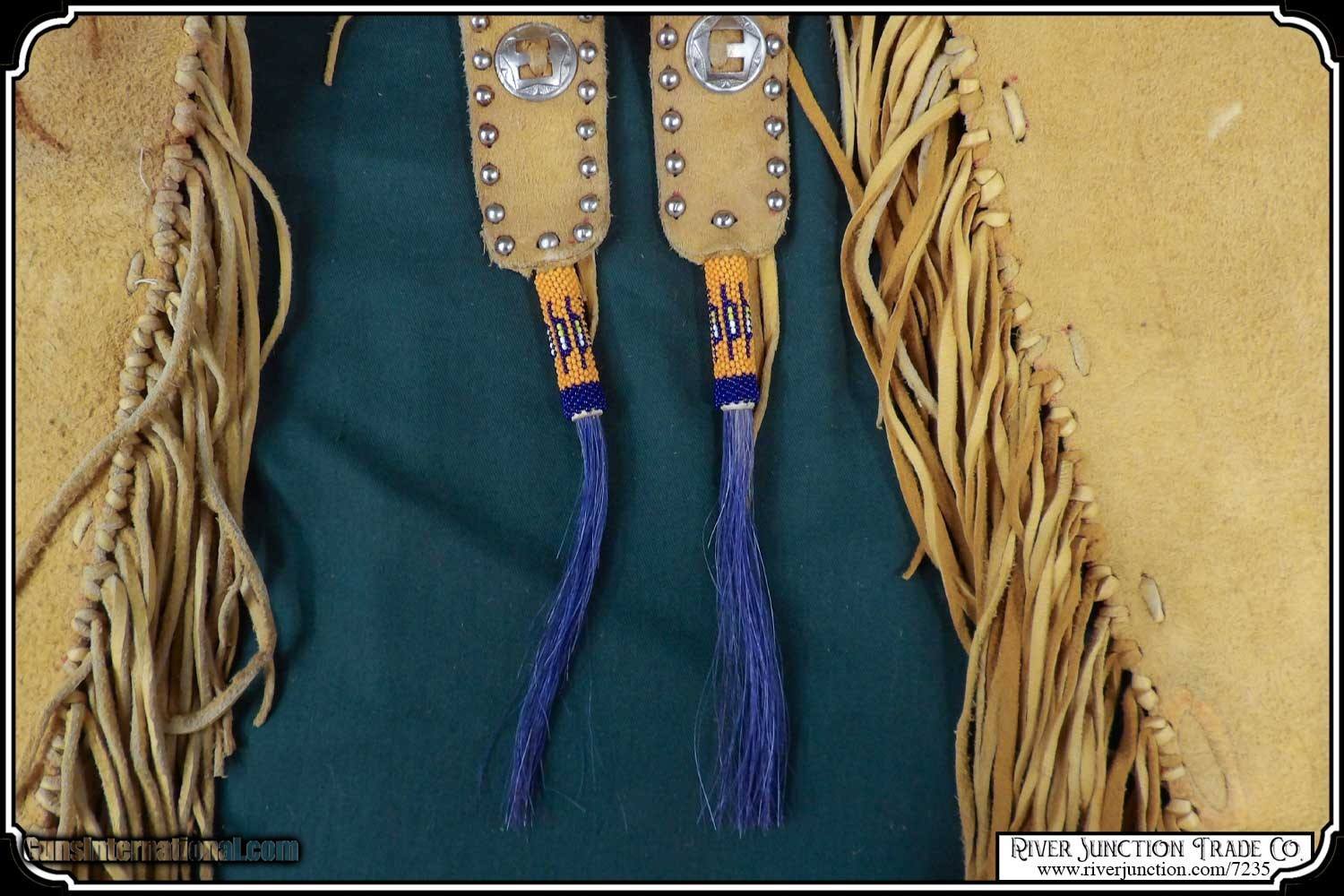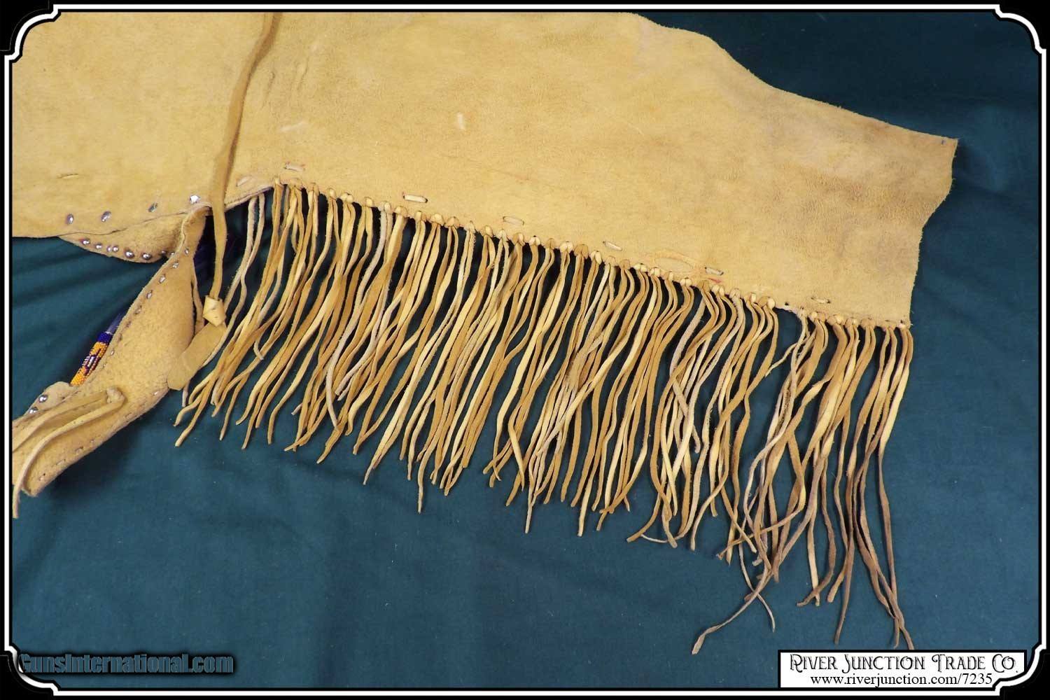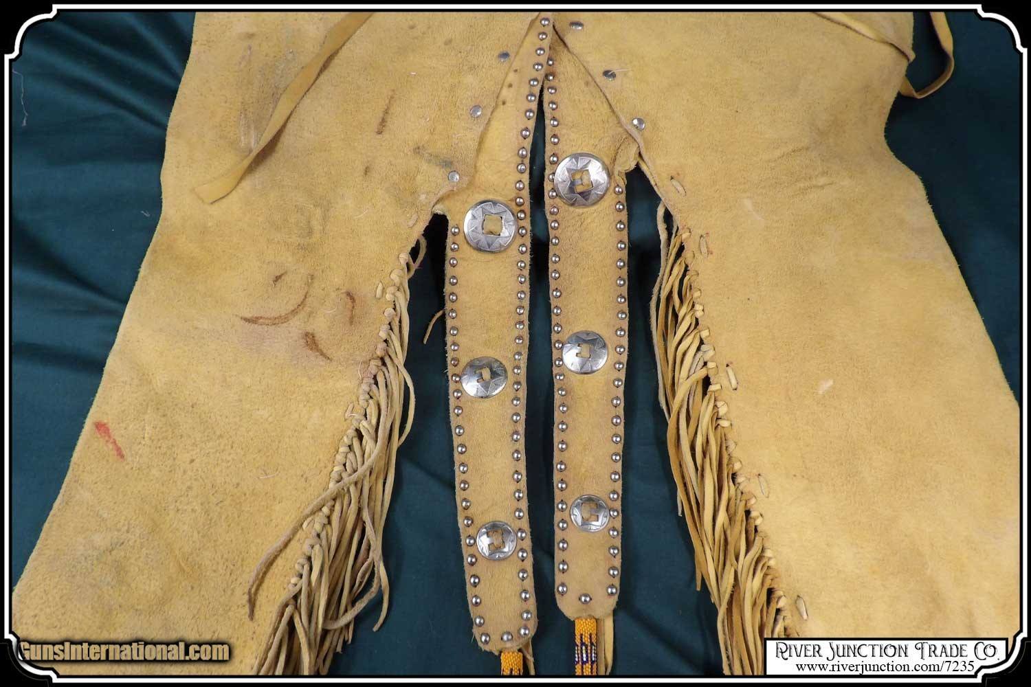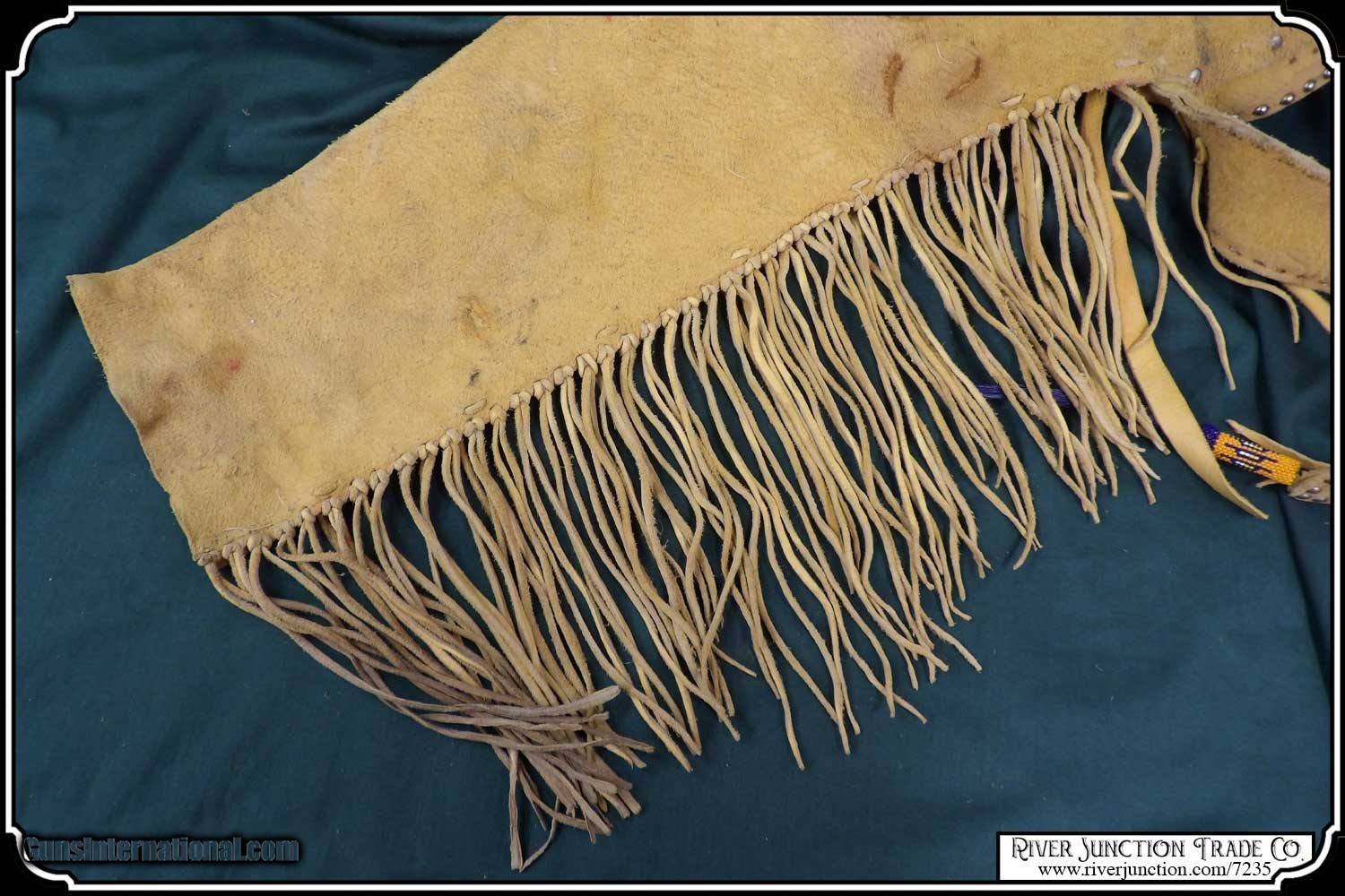 Description: Made using Elk Hide, these Leggings are done in the Sioux tradition, maybe for Pow-wow. The legs are closed with a simple running stitch with fringe up to about mid thigh. A strap decorated with silver conchos with silver spots and a Blue, Orange, White and Yellow beaded horsehair tassel at the ends. Possibly made in the 1940s. There are 2 repairs, one is missing the patch the other patch is holding strong. Rivets hold the ties on, as well as the decorative straps. One leg has some staining, both have age wear. These have been well loved but are still very usable, the leather is still strong no stiff or brittle spots. Price: $400.00 Buy Now Contact Seller |