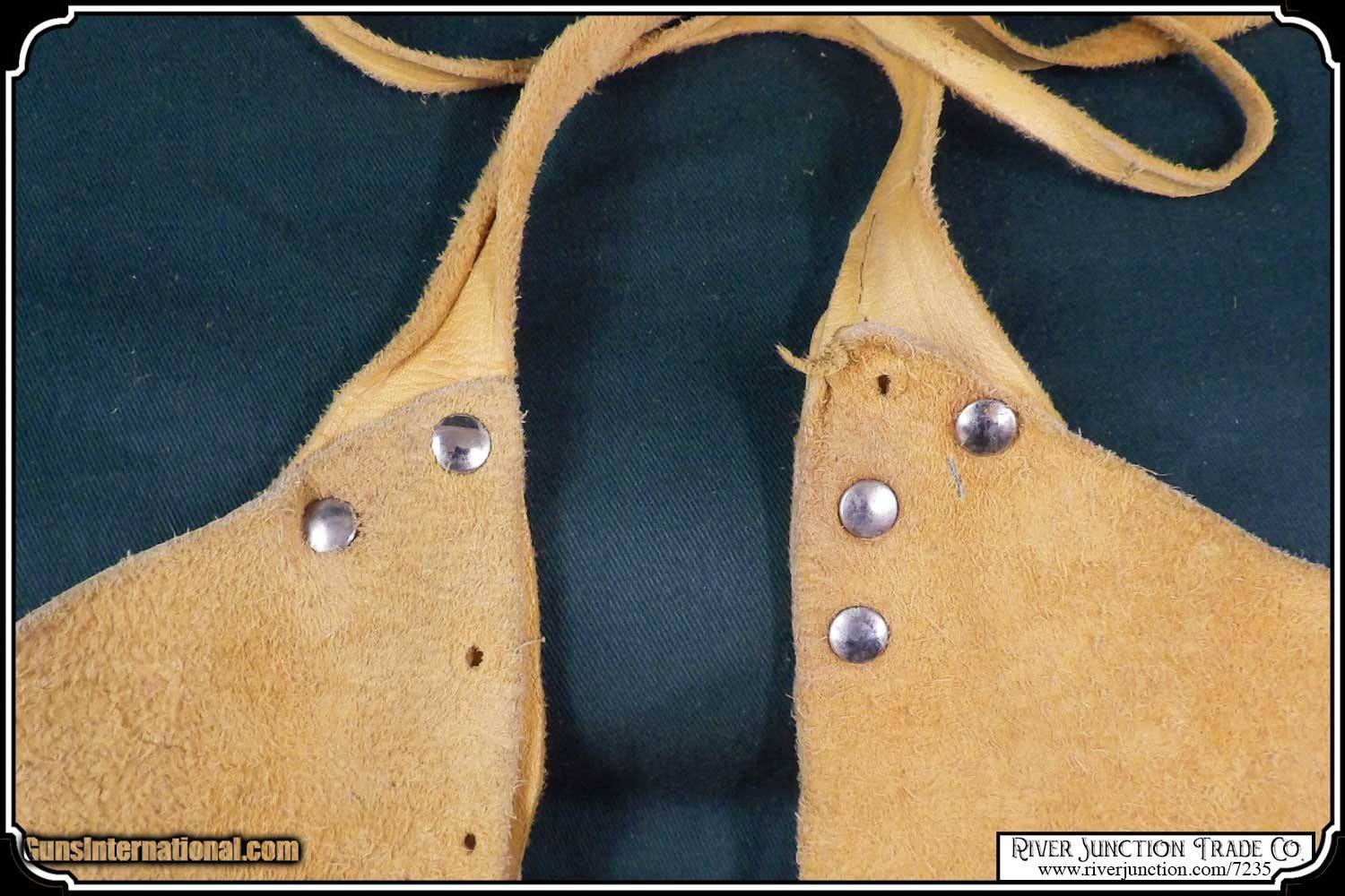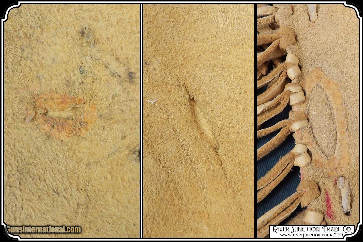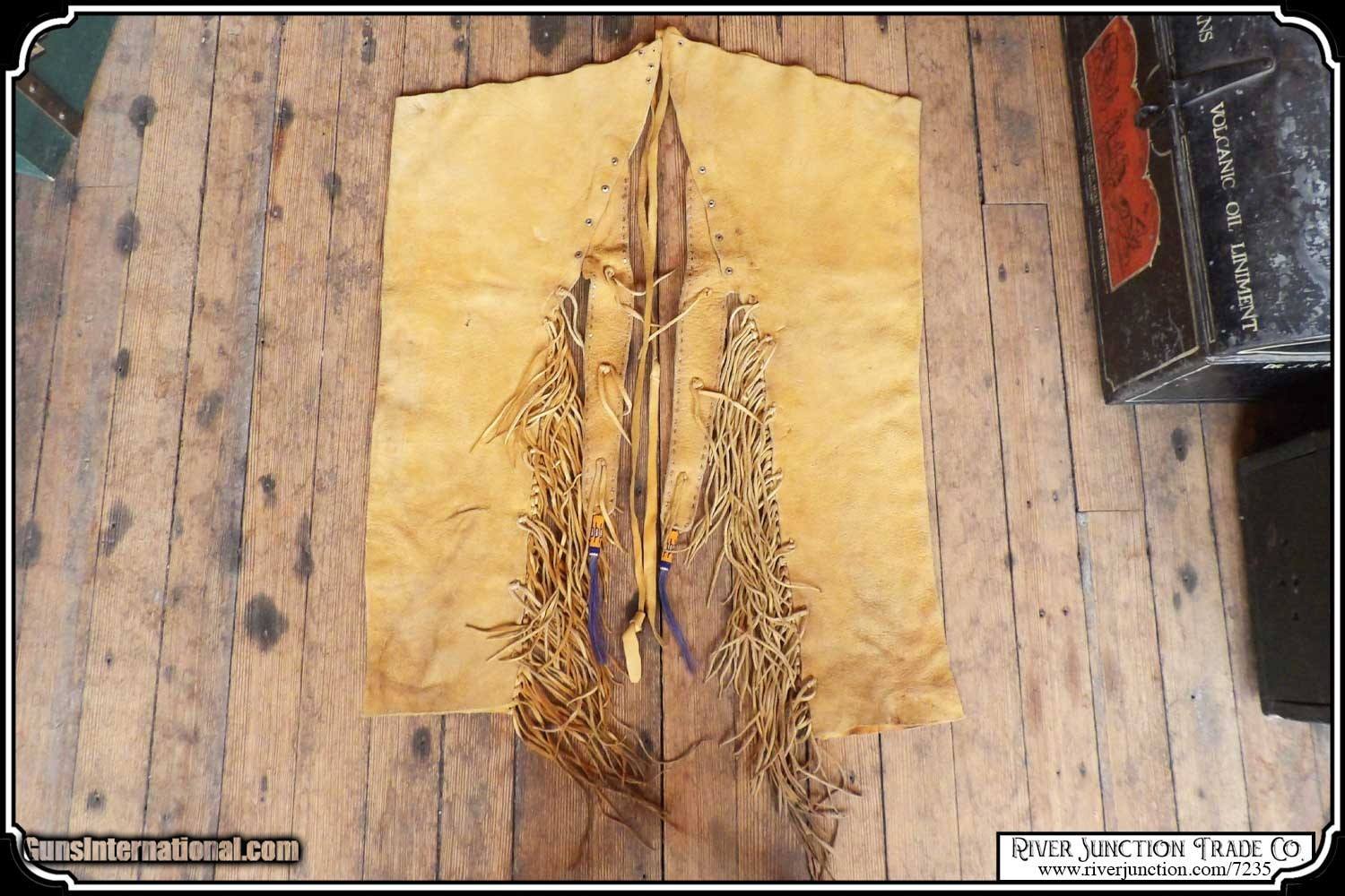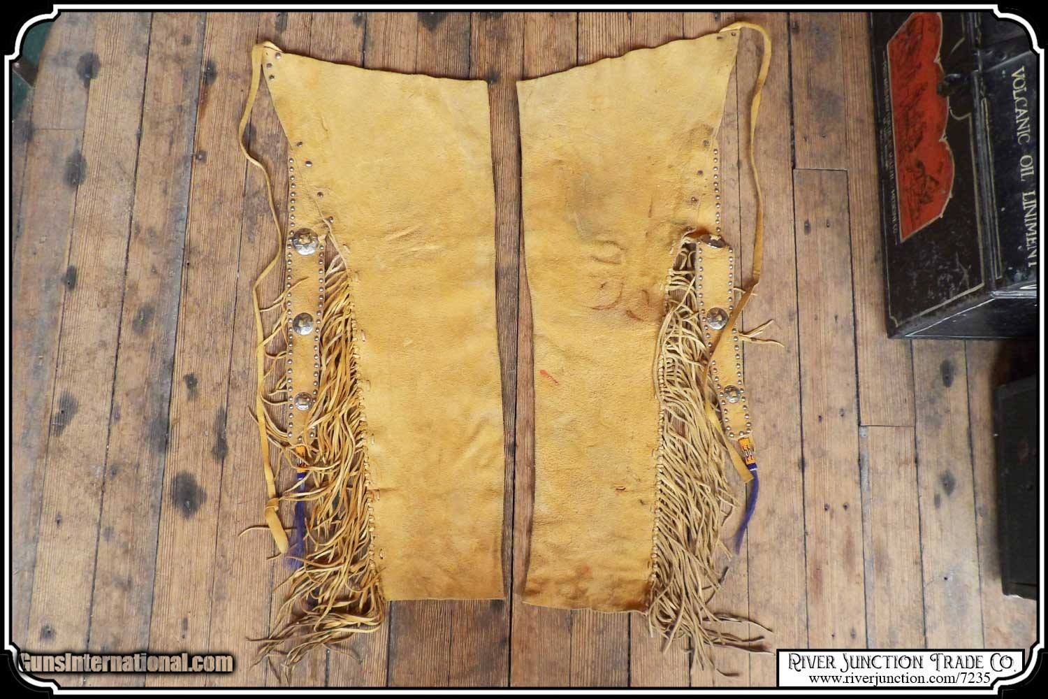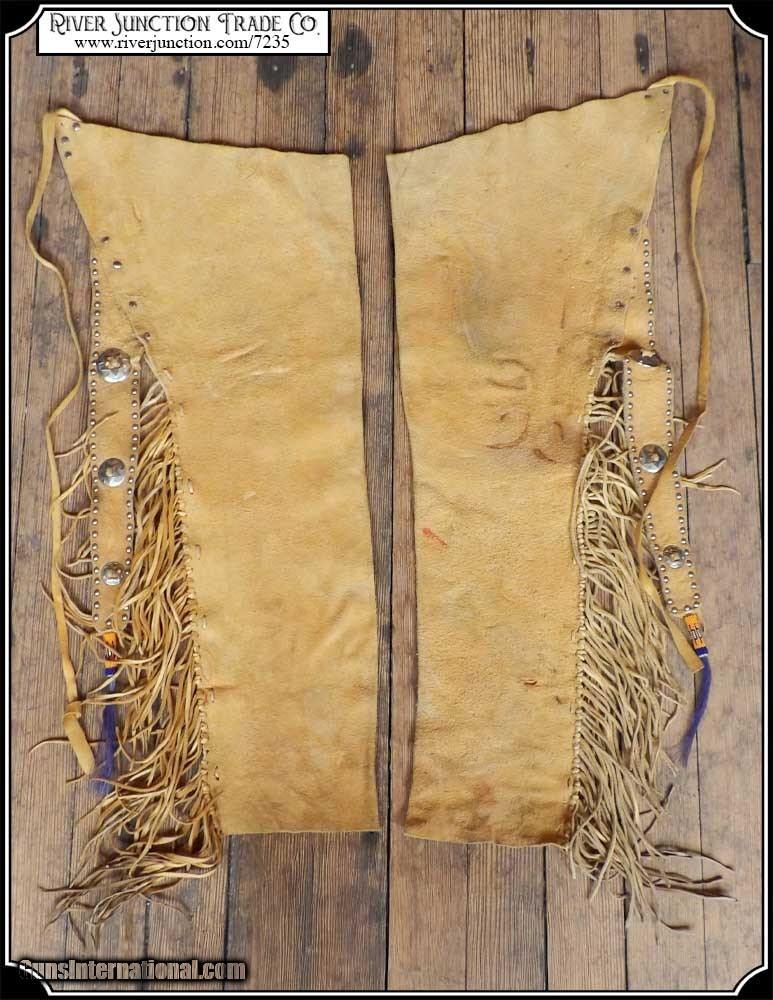 Description: Made using Elk Hide, these Leggings are done in the Sioux tradition, maybe for Pow-wow. The legs are closed with a simple running stitch with fringe up to about mid thigh. A strap decorated with silver conchos with silver spots and a Blue, Orange, White and Yellow beaded horsehair tassel at the ends. Possibly made in the 1940s. There are 2 repairs, one is missing the patch the other patch is holding strong. Rivets hold the ties on, as well as the decorative straps. One leg has some staining, both have age wear. These have been well loved but are still very usable, the leather is still strong no stiff or brittle spots. Price: $400.00 Buy Now Contact Seller |