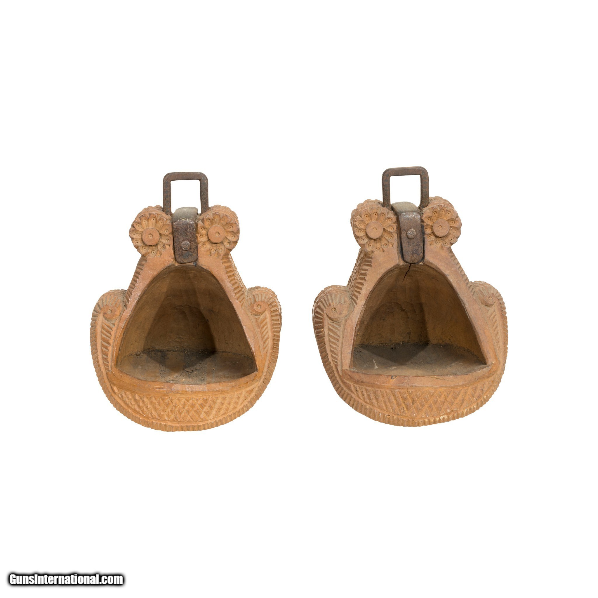 Description: South American carved wooden cowboy stirrups known as "estribos". Each stirrups is hand carved from a solid block of wood with incredible detail. This particular pair is very ornate with a floral and geometric South American design and iron straps. These stirrups are from the 18th or 19th century and are possibly Chile or Brazilian in origin. Also called Spanish Colonial. Size: 8 1/2 x 6W x 8 1/2H" Inventory: AF1806 SOLD |