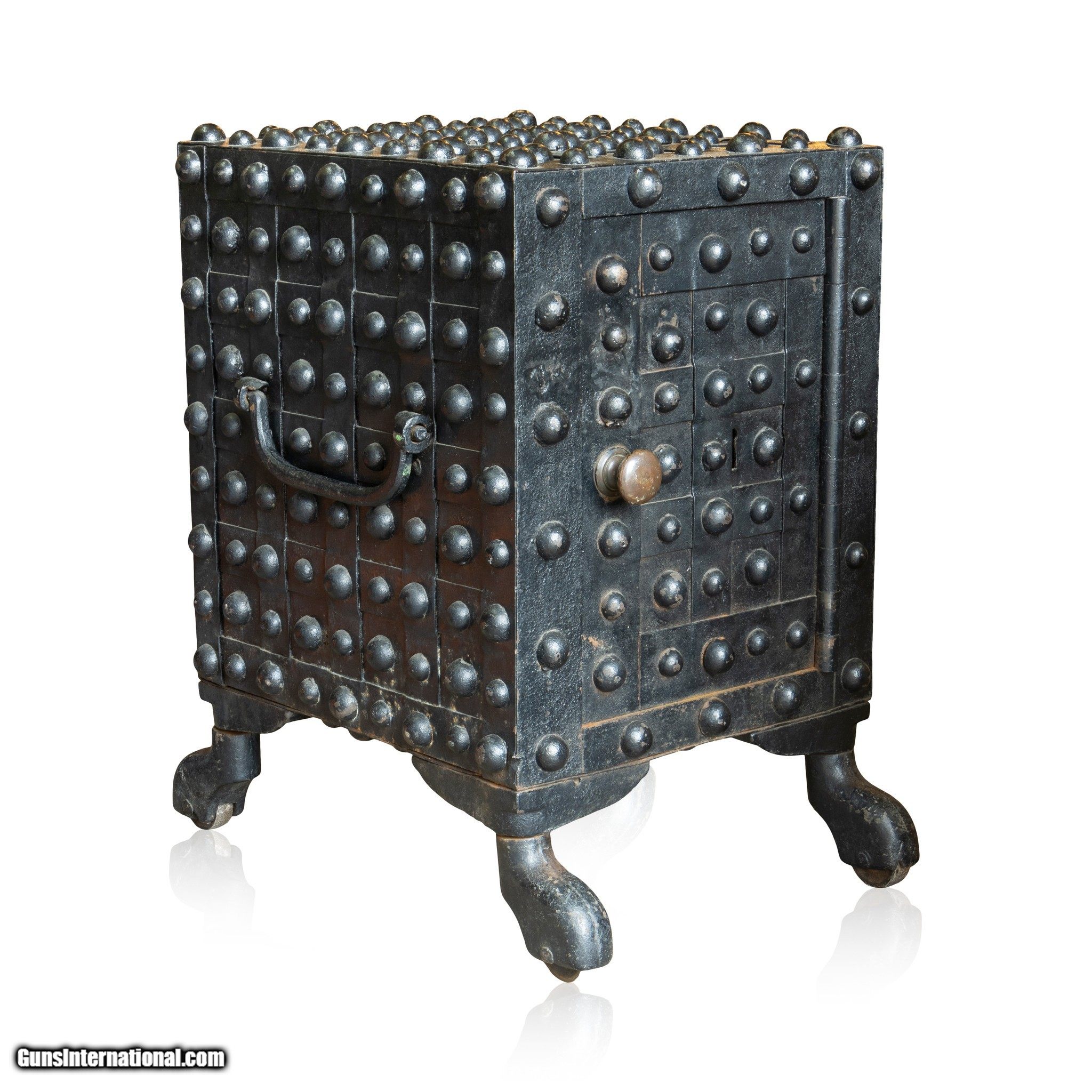 Description: Steel hobnail floor safe. American late 19th Century steel with applied hobnails painted black. Brass door knob, ball handle, on wheels. Ex. American Folk Art Museum. 30 1/2" x 22 1/2" x 20" Family Owned & Operated Cisco’s Gallery deals in the rare, exceptional, and one-of-a-kind pieces that define the history of America and the Old West. Our pieces range from American Indian to Cowboy Western and include original items of everyday life, commerce, art, and warfare that tamed America’s frontier. Our 14,000 square foot gallery opened in 1996 in beautiful Coeur d’Alene, Idaho. Personal Service Cisco’s operates on old fashioned values – honesty and integrity, and all of our items are backed by our money back guarantee. We appreciate the opportunity to earn your business. Whether you desire assistance with a jewelry purchase, choosing a gift, identification, or even selling – we hope to be your trusted source. SOLD |