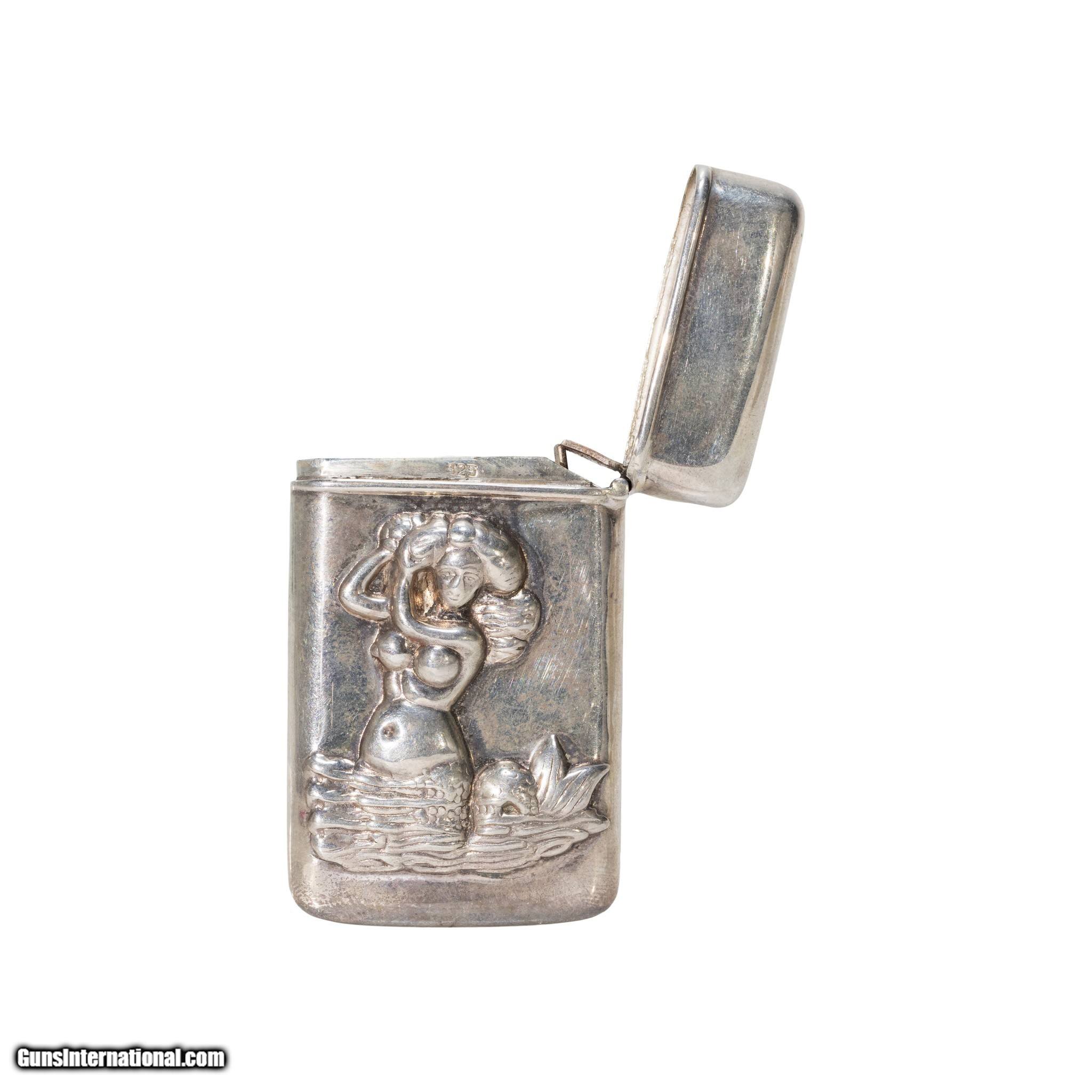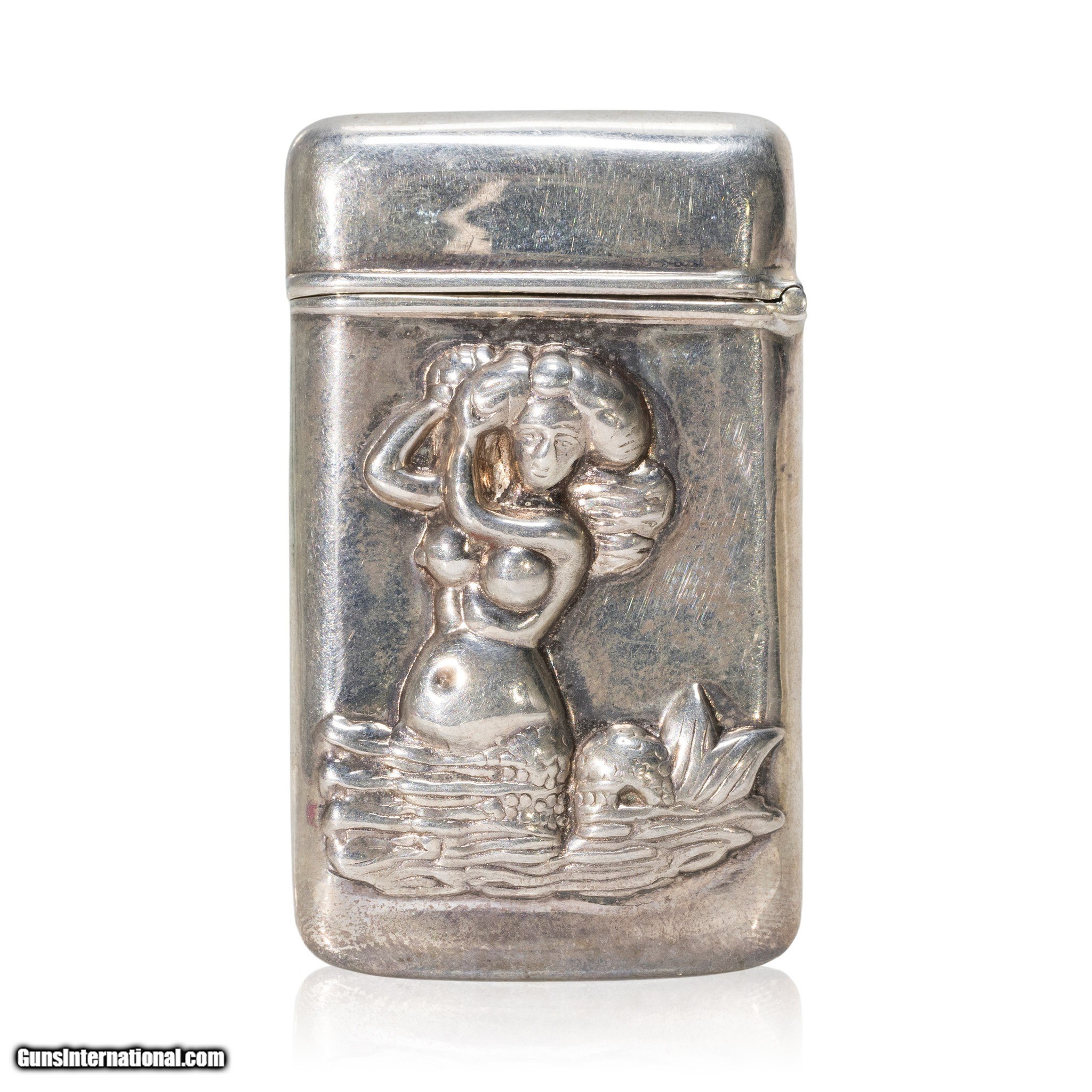Description: Novelty sterling silver match safe featuring the design of a mermaid. The mermaid is half in, half out of the water, seemingly adjusting her hair in some way. She is naked from the waist up with a shapely figure. Beautifully made and designed piece that would be great for continued use as a match safe or box, or as a piece to put on display. Size: 2 1/2" x 1 1/4 SOLD |
