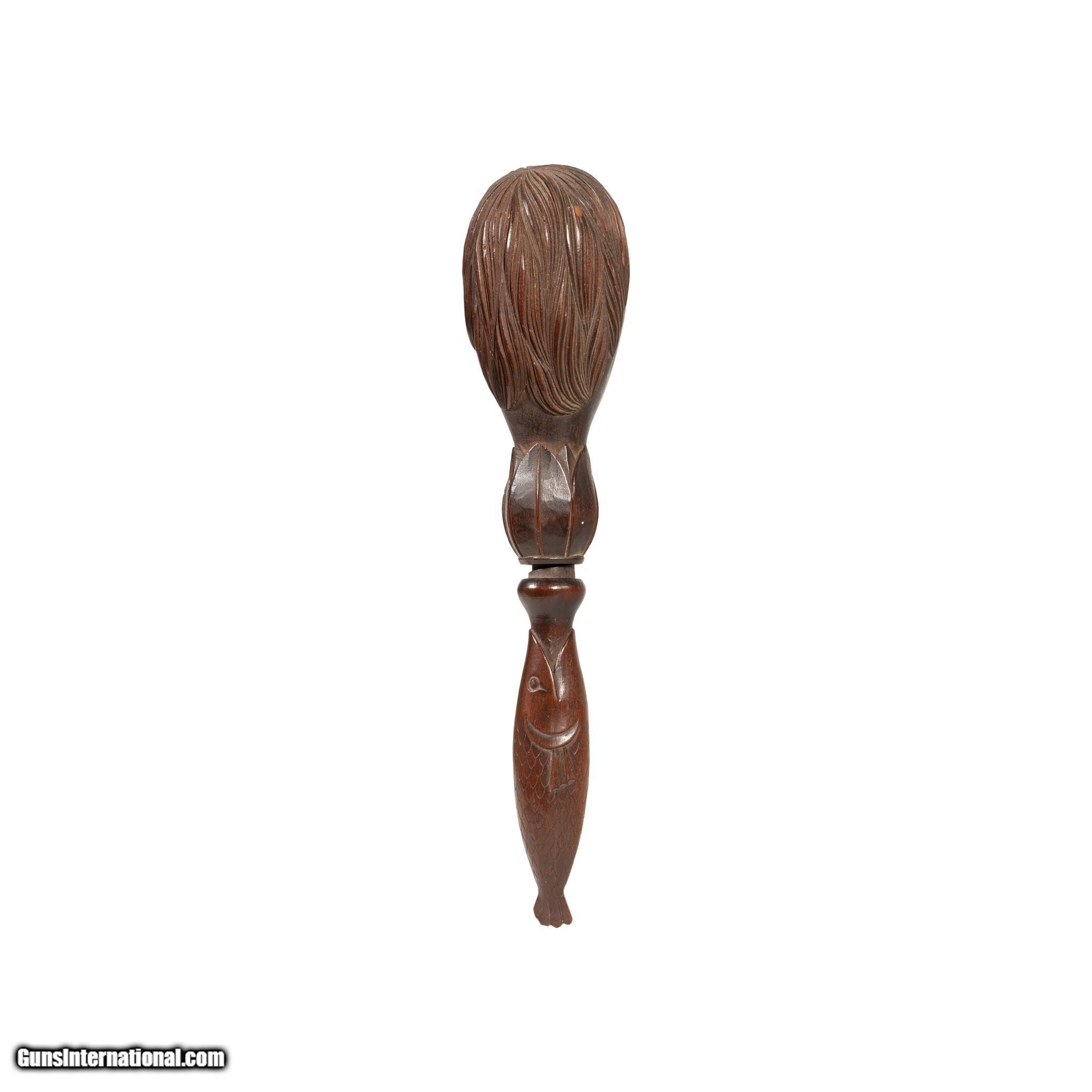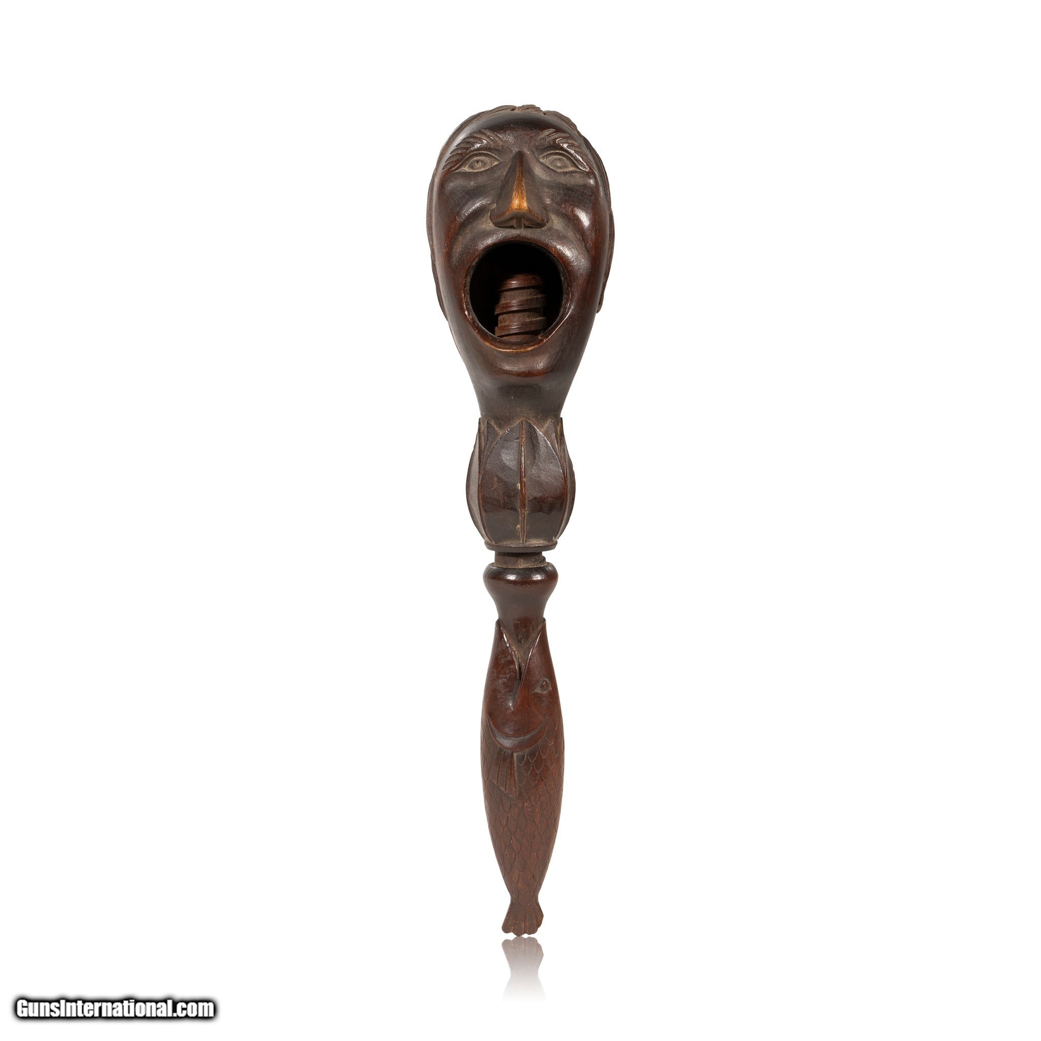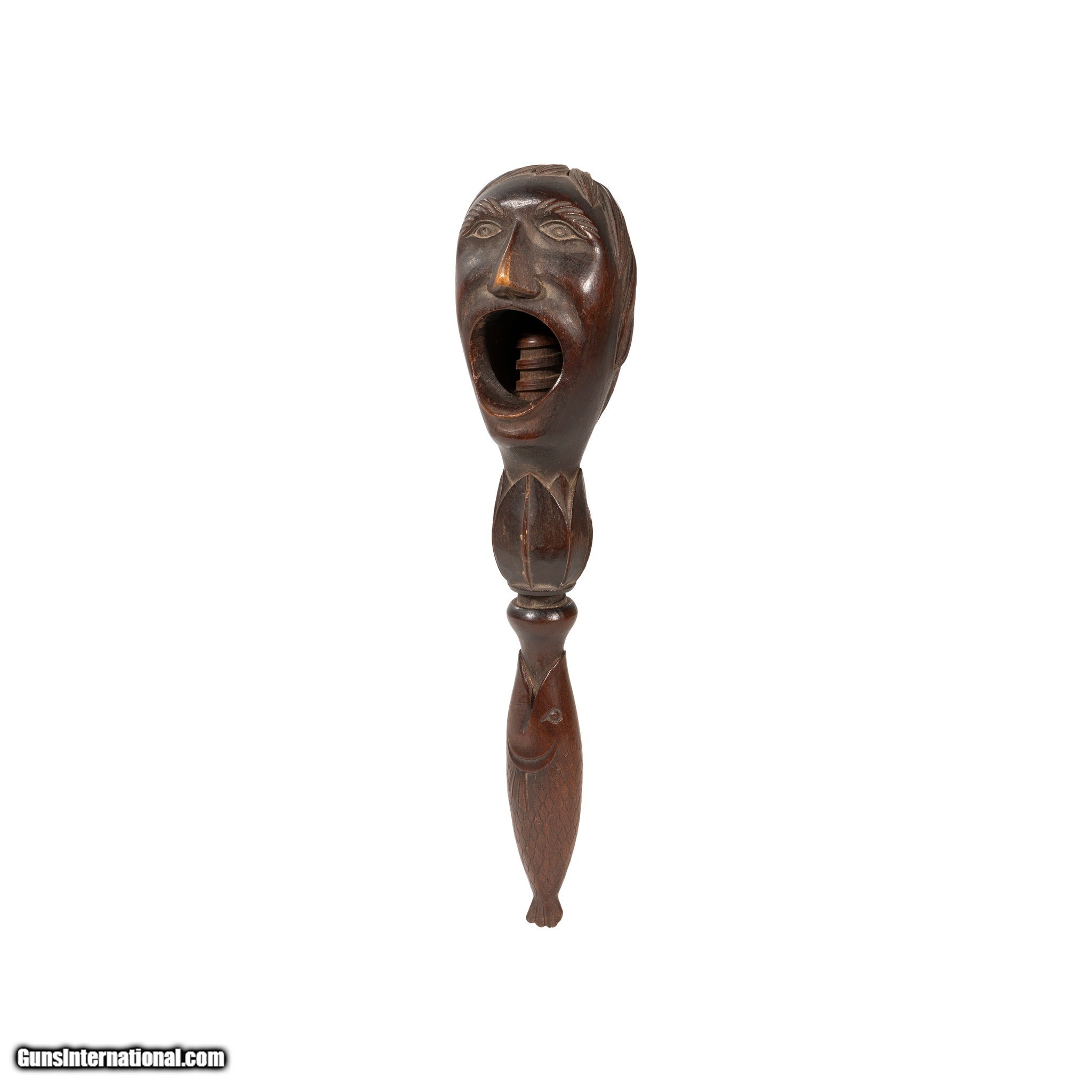 Description: Black Forest Swiss carved figural face nutcracker. Carving portrays a man with open mouth and closed eyes. Hand is fish formed. This piece is made of carved walnut, and is a screw type nutcrackers. Lovely dark carved wood that is perfect for the collector of Black Forest or of the unusual. Size: 8x2x2" SOLD |