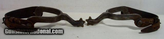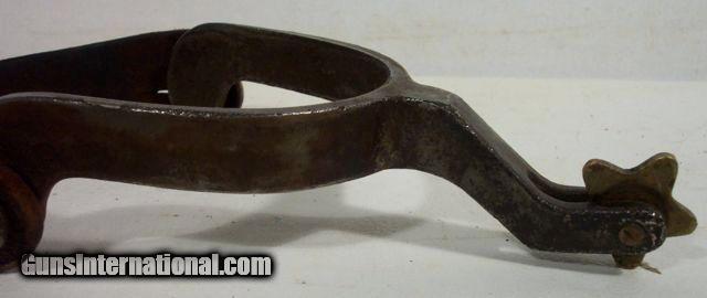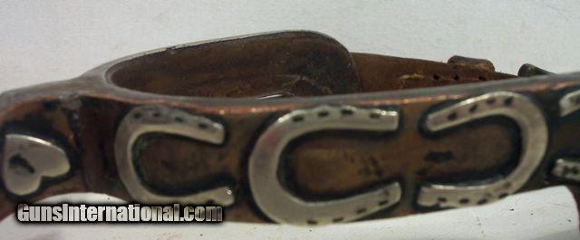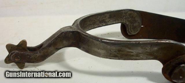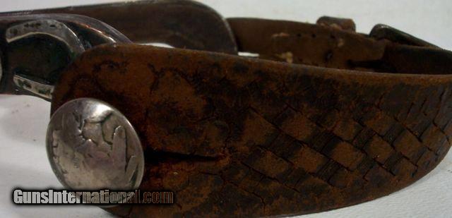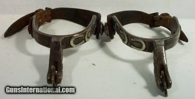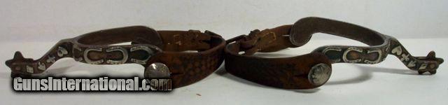 Description: Highly Decorated Spurs; Made by Willie Nathan Weast who learned from J. O. Bass, Tulia, Texas--Weast lived about 30 miles from J. O. Bass in Silverton; These spurs are marked “CW” and are believed to be made for his brother, Carl Lee Weast; Information on Weast can be found on pages 234-237 Ned & Jody Martin-Kurt House-Spurs in Texas Tradition; antique; from my own personal collection;All items shipped fully insured--Spurs $30; return policy: three days inspection from the date the item is received; full refund of shipping both ways ONLY IF THE ITEM IS MISREPRESENTED. Note: International sales only as laws permit. SOLD |