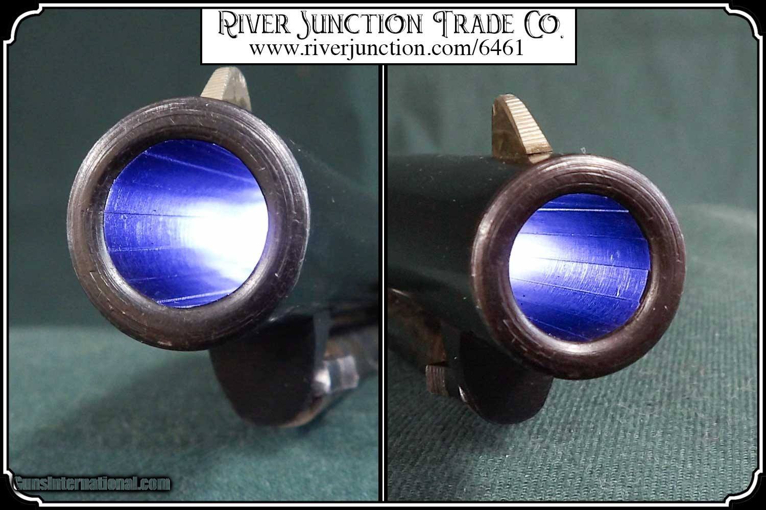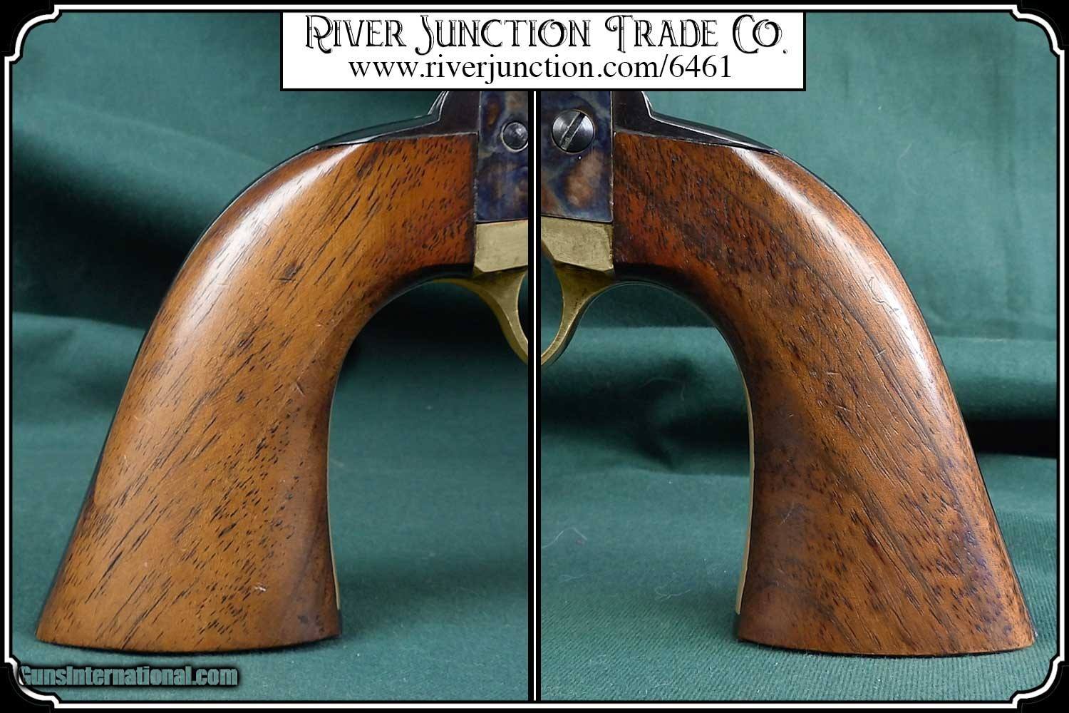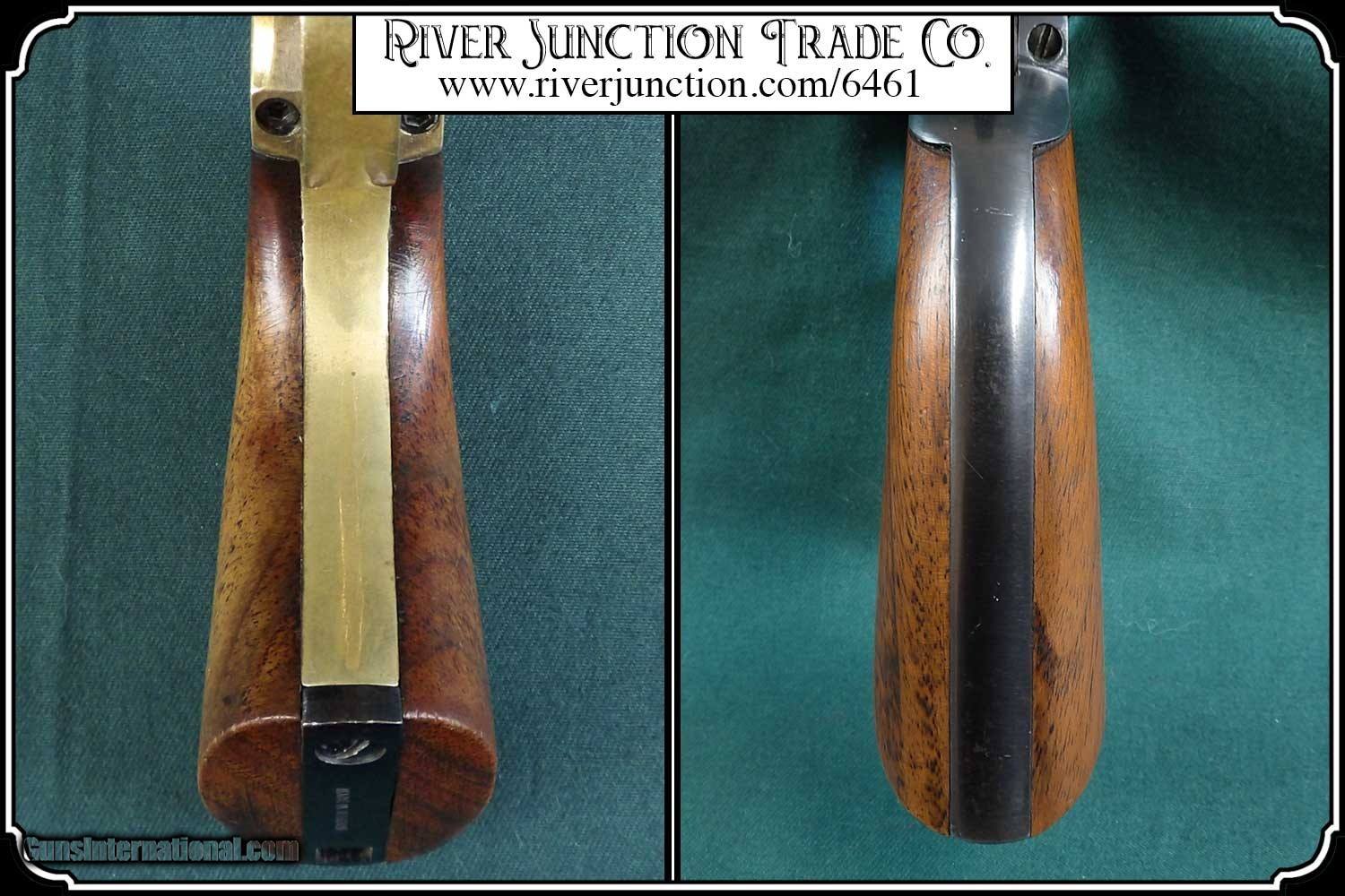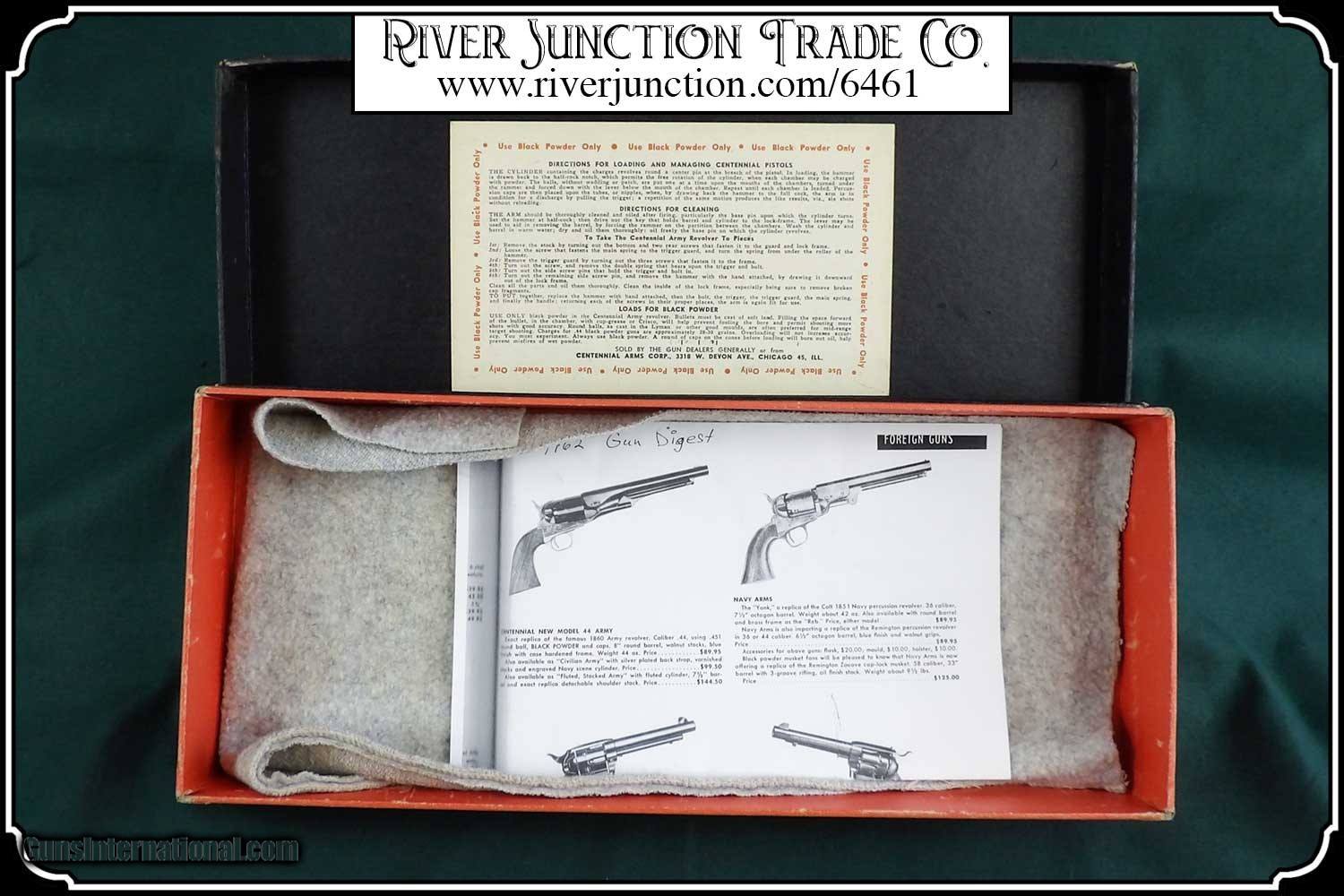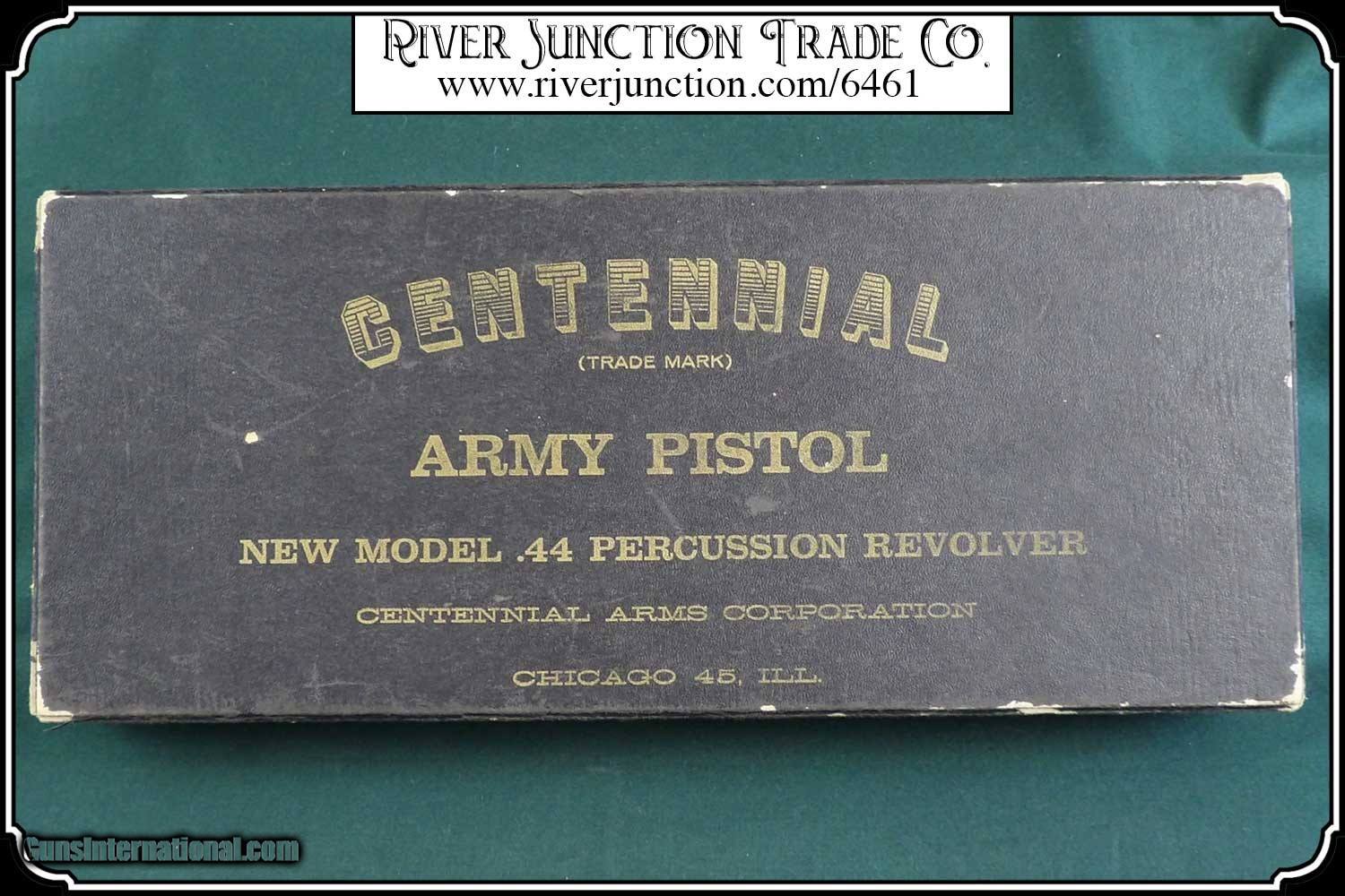 Description: Collectors consider this a direct-line descendant from the original Civil War era .44 caliber, 1860 Colt. They feel these are more authentic in that this was the 1st production of the 1860 Colt Army since the originals used in the Civil War. In 1853 Samuel Colt traveled overseas and licensed Belgian gun manufacturers to produce his revolvers. Then one hundred years later, these companies regrouped and began producing this six shooter with modern steel. Others have copied and followed since then including the so called 2nd and 3rd generation percussion 1860 Army. The new revolvers were marketed as 1960 New Model Army and were stamped Made in Belgium. At that time of the upcoming centennial of the American Civil War, and no safe usable arm was available for reenactors. That all pointed to an obvious need. There to answer that need were two important ingredients, original Colt equipment waiting silently in Belgium for nearly a century and a young man by the name of William B. Edwards. Edwards was one of the principals of Centennial Arms Corp. of Chicago. Edwards realized there was a ready market for a second issue of the Colt Army. Edwards entrusted Fabriques de Armes Unies de Li_ge in Belgium with the production of the 1860 dubbed,/ 1960 NEW MODEL ARMY. This (1860)1960 NEW MODEL ARMY is mechanically perfect. It is in near new to mint condition. The bore is BRIGHT AND SHINY. The action is the positive and it locks up tight. It features the original Colt Naval battle scene on the cylinder. This gun is serial number (5153) and so marked on the barrel lug, frame and trigger guard. The frame, hammer and loading lever are color case hardened. I believe this gun has been fired, maybe once. It shows other marks such as the CENTAUR figure on the left side of the frame, made in Belgium on the butt, and on the top of the barrel "1960 NEW MODEL ARMY” CENTENNIAL TRADE MARK. The rare bonus with this 1960 is the original box in solid condition. The black box is marked on the lid "CENTENNIAL ,TRADE MARK, ARMY PISTOL, NEW MODEL .44 PERCUSSION REVOLVER, CENTENNIAL ARMS CORPORATION, CHICAGO 45, ILL." Payment: Item, can be ordered on line with a credit card or paypal on our sight. Just Google (riverjunction) and type in the River Junction Trade Co. item number (6461) in the search box. Before you checkout you will see shipping cost and total. OR If you prefer: Pay by cash, postal money order, cashiers check, personal & business checks. We wait for checks to clear. We always answer questions and entertain offers. Have questions? Call me 563-880-4588. Jim SOLD |