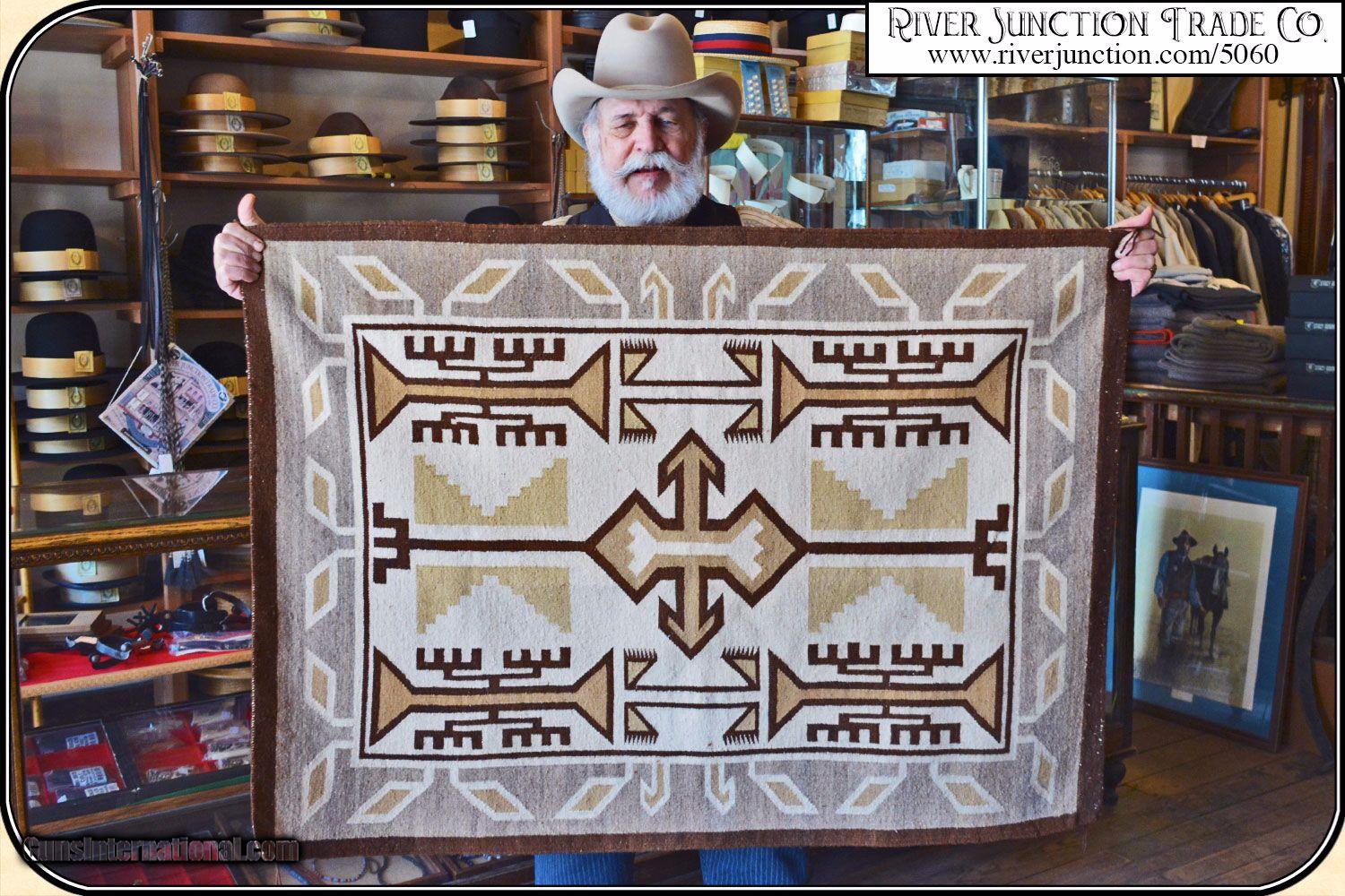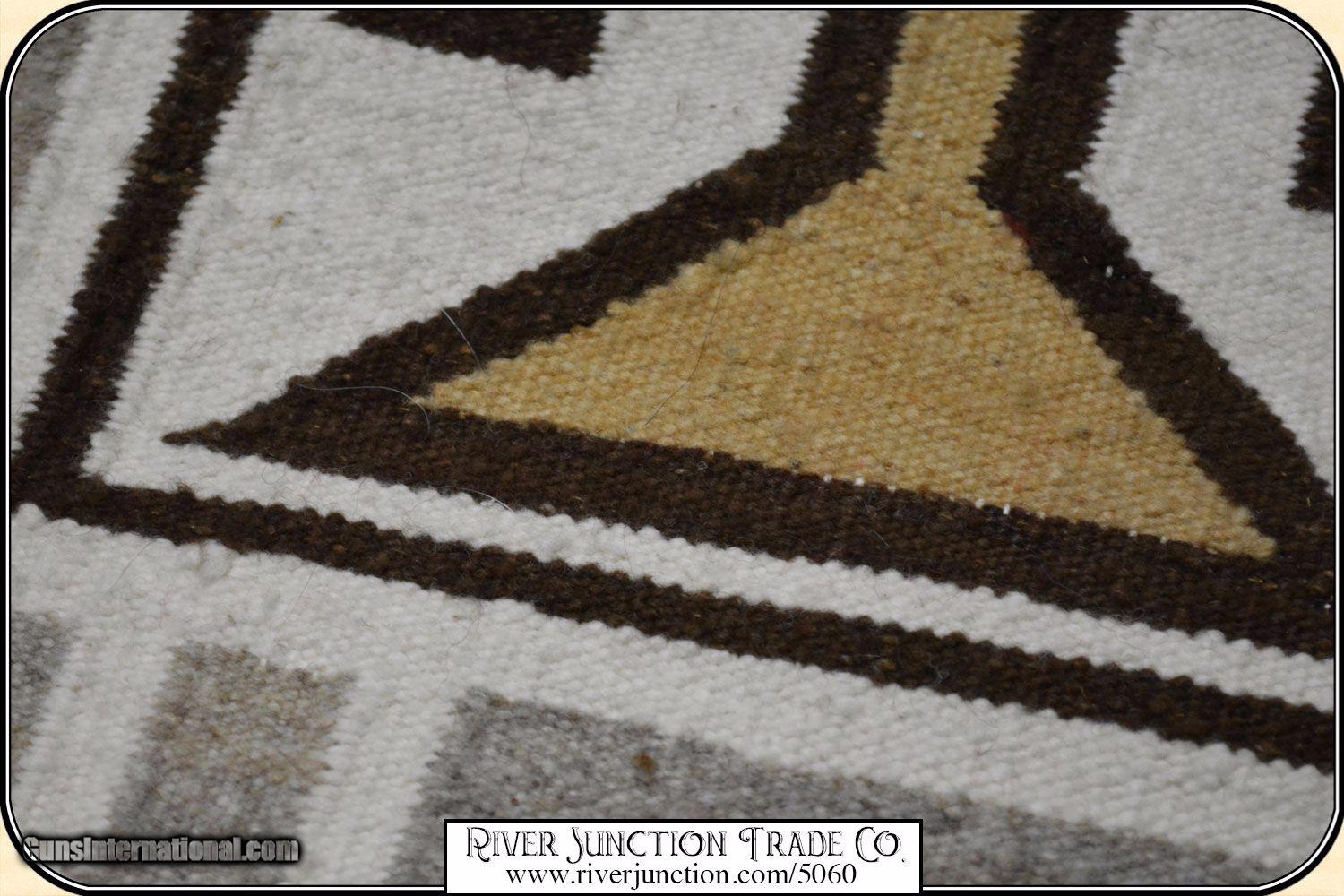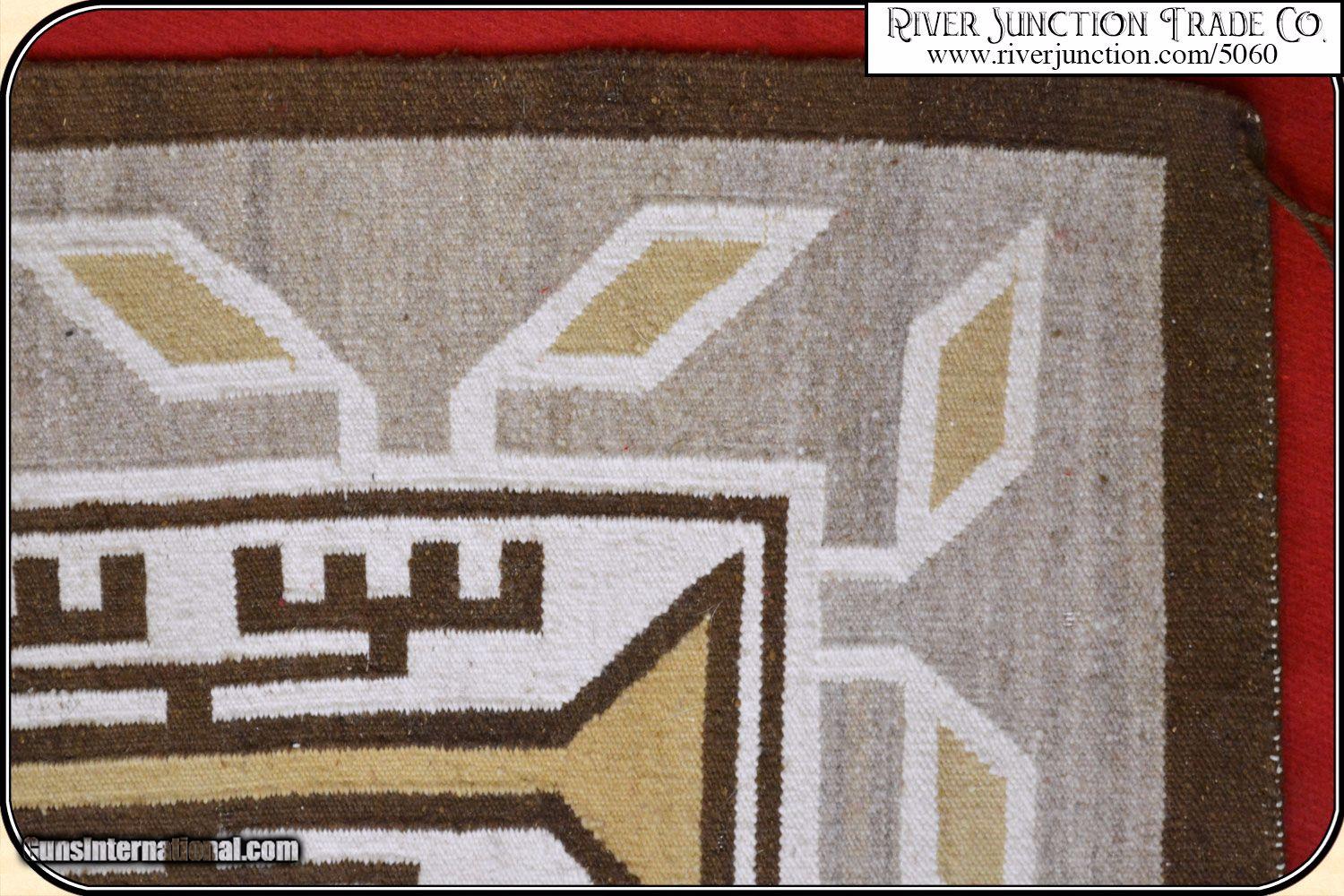 Description: Two Grey Hills rugs are the finest Navajo weavings with a great interesting history for those that prize these fine rugs. They feature unique designs woven with natural sheep wool. Two Grey Hills weavers tend to use natural un-dyed wools. Colors are created by carding the wool to blend the desired shades. These rugs are know to have the highest thread count per inch as compared to their contemporaries. Stair step and geometric designs are typical. Two Grey Hills is located south of Shiprock New Mexico. This rug is 4' 4" X 3'9". Exquisite 1970 vintage hand-woven American Indian wool rug with an interesting designs. Constructed with natural wool colors , this rug is an absolute showpiece. The natural neutral colors of this gorgeous rug would coordinate well with most any decor. This is an extraordinary rug with calm colors, that will warm your senses. The rug is perfect with absolutely no flaws. (see the photos). As these rug go this is a very good price at $2095. most of this quality and size would sell at $3000. and up. We alway answer questions and entertain offers. Payment Cash, postal money order, cashiers check, personal & business checks. Can be ordered with a credit card or paypal at wxx.riverjunction,cxx just type in the number 5060 in the search box. SOLD |