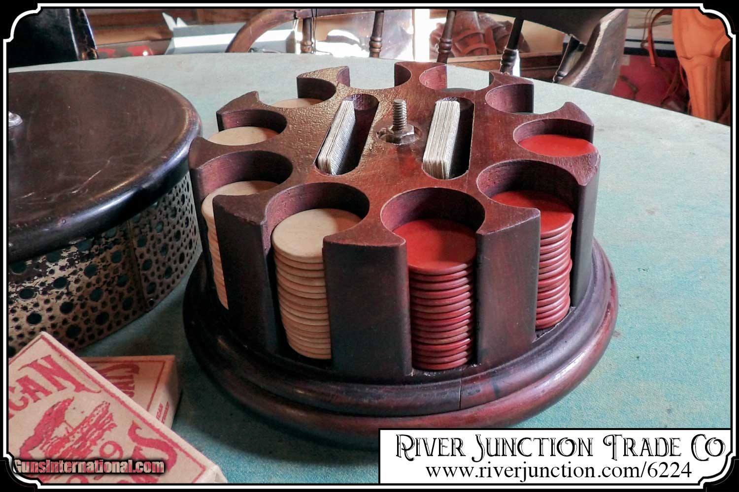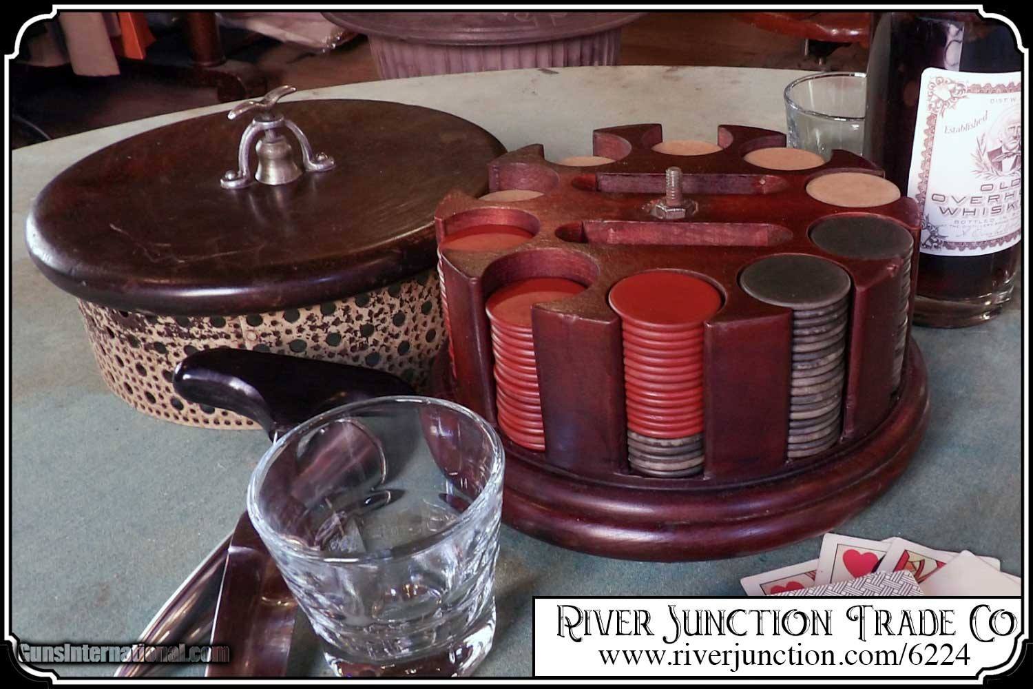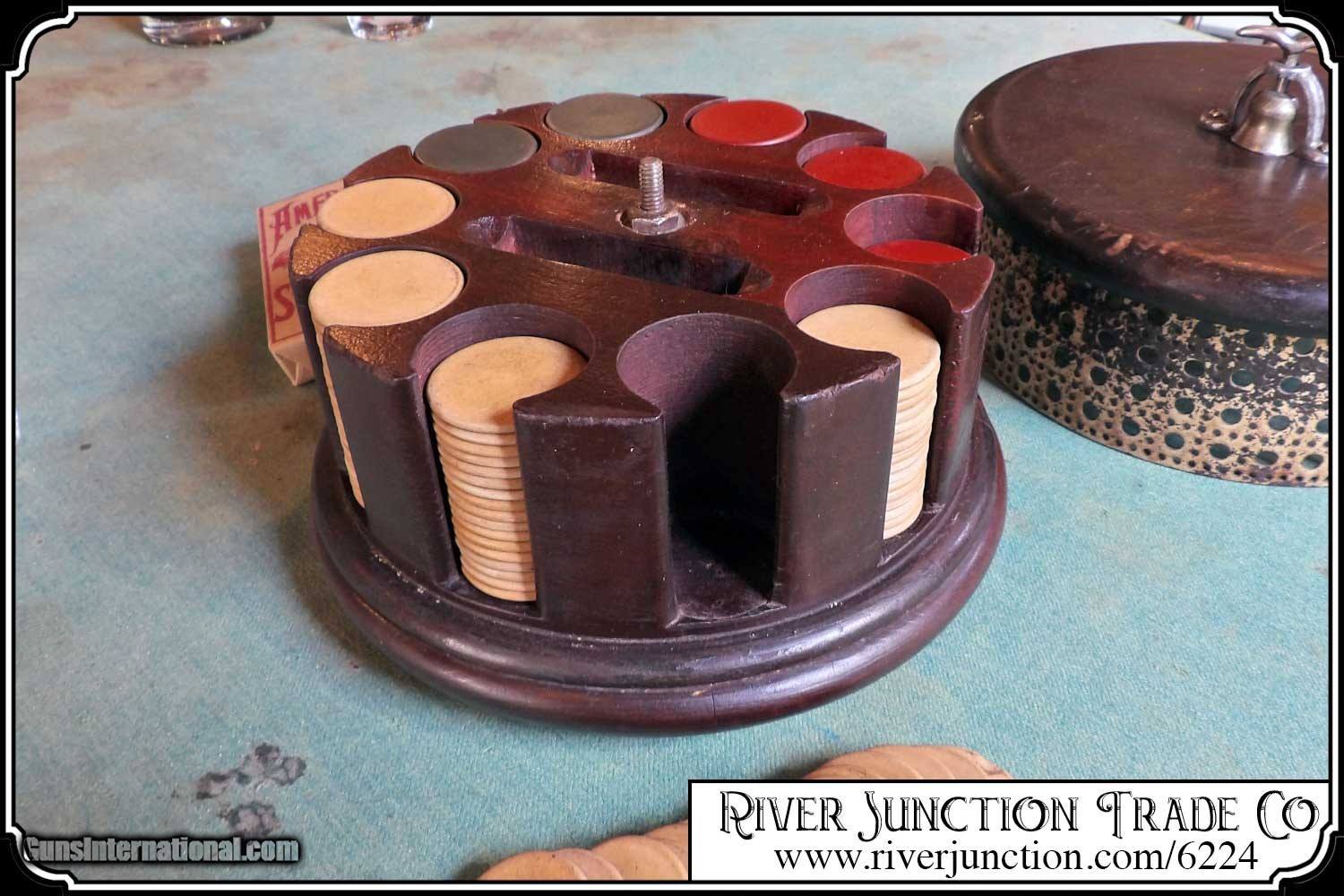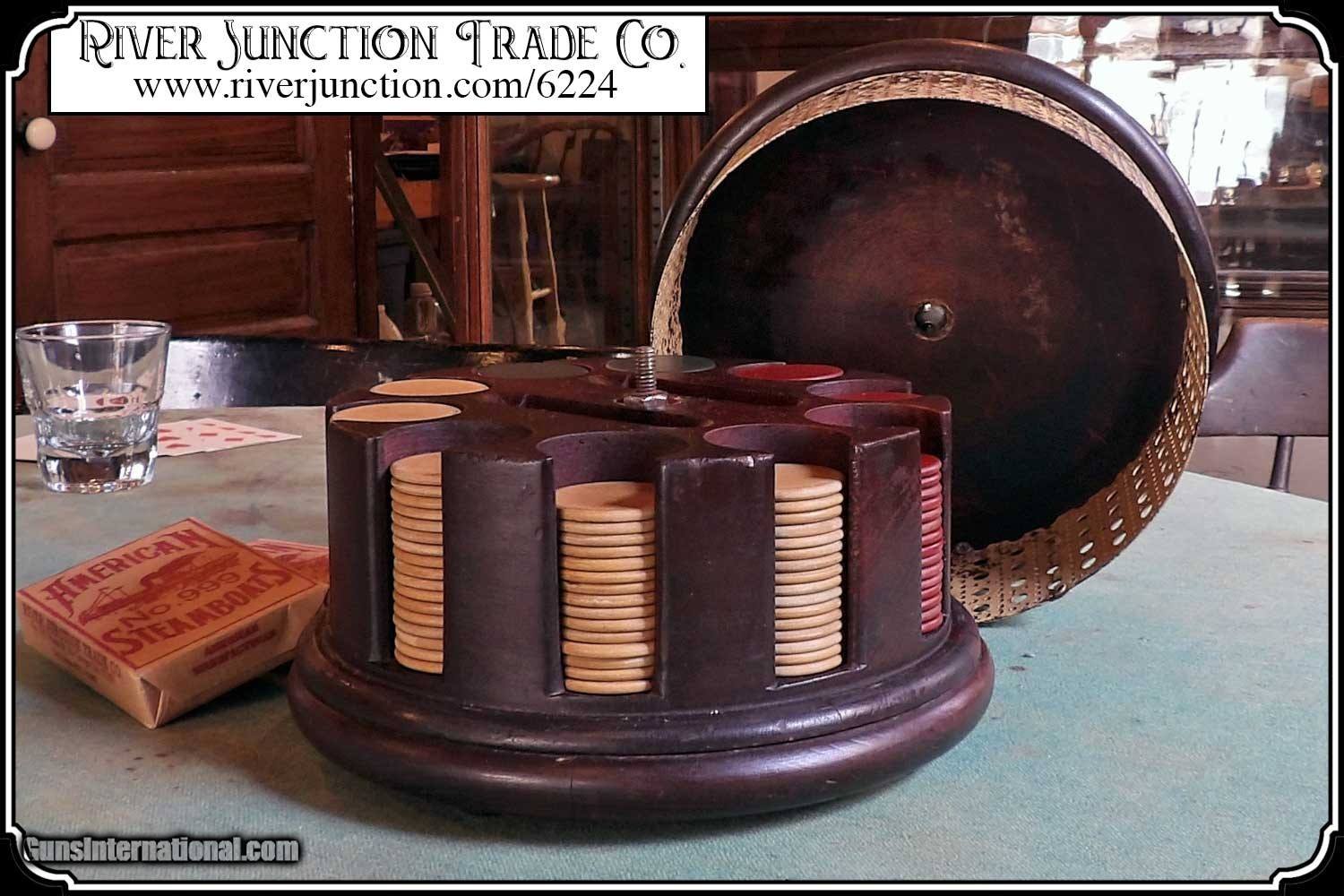 Description: Unique and truly one of a kind Gambling Hall, Poker Chip Rack circa 1890-1910. The chips are Victorian era clay chips. Housed in wooden rack with slots for two decks of cards in the center. The cover is a combination of wood and metal. The Metal has been punched and painted to look like Wicker to dress it up a bit The Round case is 8 1/2 inches in diameter, and 4 1/2 inches tall without the carry handle. The wood shows no breaks or chips though there is some wear. There are 10 slots for chips. It is currently holding 176 chips in 3 colors, but could hold up to 190 chips. The colors are 86 cream, 43 blue, and 47 red. The chips are 1 1/4 in. in diameter, I did come across a few with chips but all are in great condition and usable with no cracking. This Chip Rack is a wonderful parlor type set. This great set shows a some age, but is ready for the big game of 5 Card Stud.. I have included 2 sets of old time cards. See photo for more details. Payment: Item, can be ordered on line with a credit card or paypal on our sight. Just Google (riverjunction) and type in the River Junction Trade Co. item number (6224) in the search box. Before you checkout you will see shipping cost and total. OR If you prefer: Pay by cash, postal money order, cashiers check, personal & business checks. We wait for checks to clear. We always answer questions and entertain offers. Have questions? Call me 563-880-4588. Jim SOLD |