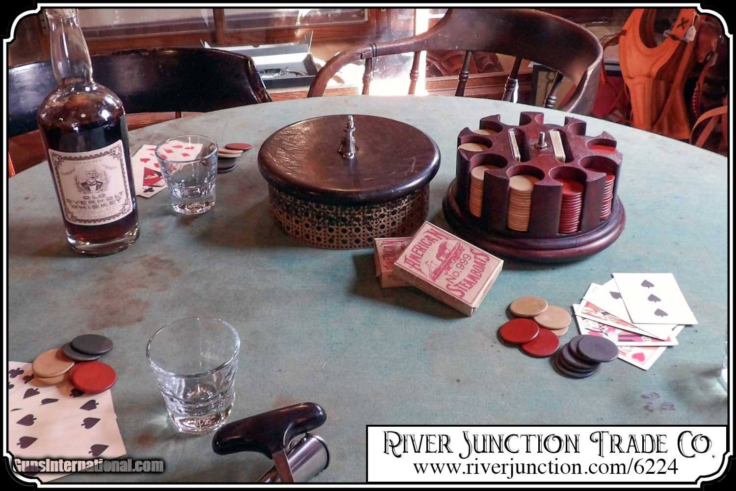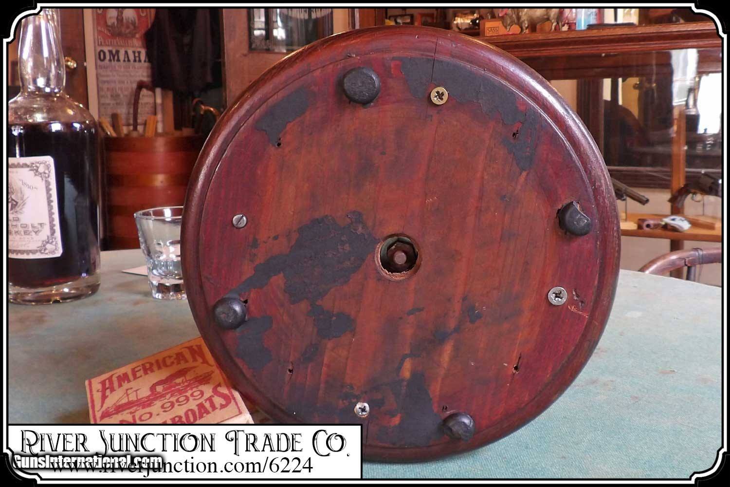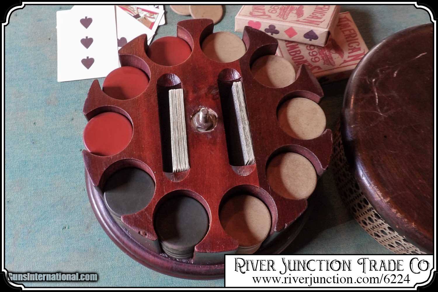 Description: Unique and truly one of a kind Gambling Hall, Poker Chip Rack circa 1890-1910. The chips are Victorian era clay chips. Housed in wooden rack with slots for two decks of cards in the center. The cover is a combination of wood and metal. The Metal has been punched and painted to look like Wicker to dress it up a bit The Round case is 8 1/2 inches in diameter, and 4 1/2 inches tall without the carry handle. The wood shows no breaks or chips though there is some wear. There are 10 slots for chips. It is currently holding 176 chips in 3 colors, but could hold up to 190 chips. The colors are 86 cream, 43 blue, and 47 red. The chips are 1 1/4 in. in diameter, I did come across a few with chips but all are in great condition and usable with no cracking. This Chip Rack is a wonderful parlor type set. This great set shows a some age, but is ready for the big game of 5 Card Stud.. I have included 2 sets of old time cards. See photo for more details. Payment: Item, can be ordered on line with a credit card or paypal on our sight. Just Google (riverjunction) and type in the River Junction Trade Co. item number (6224) in the search box. Before you checkout you will see shipping cost and total. OR If you prefer: Pay by cash, postal money order, cashiers check, personal & business checks. We wait for checks to clear. We always answer questions and entertain offers. Have questions? Call me 563-880-4588. Jim SOLD |