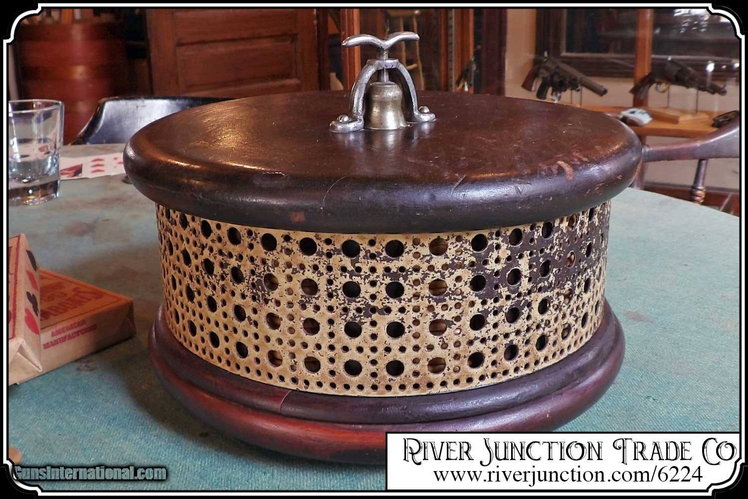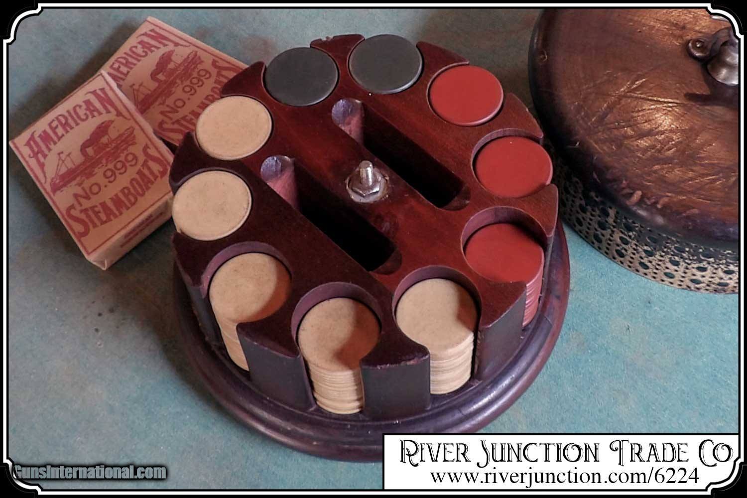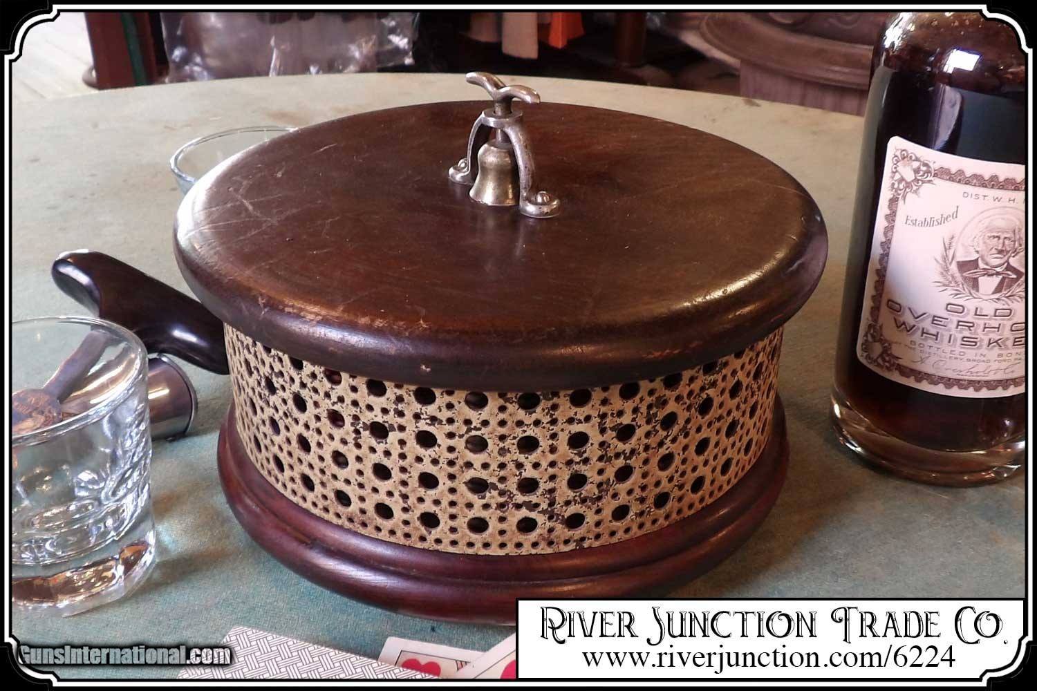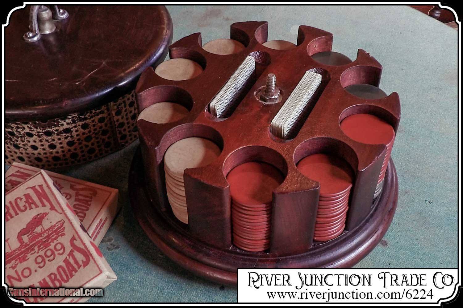 Description: Unique and truly one of a kind Gambling Hall, Poker Chip Rack circa 1890-1910. The chips are Victorian era clay chips. Housed in wooden rack with slots for two decks of cards in the center. The cover is a combination of wood and metal. The Metal has been punched and painted to look like Wicker to dress it up a bit The Round case is 8 1/2 inches in diameter, and 4 1/2 inches tall without the carry handle. The wood shows no breaks or chips though there is some wear. There are 10 slots for chips. It is currently holding 176 chips in 3 colors, but could hold up to 190 chips. The colors are 86 cream, 43 blue, and 47 red. The chips are 1 1/4 in. in diameter, I did come across a few with chips but all are in great condition and usable with no cracking. This Chip Rack is a wonderful parlor type set. This great set shows a some age, but is ready for the big game of 5 Card Stud.. I have included 2 sets of old time cards. See photo for more details. Payment: Item, can be ordered on line with a credit card or paypal on our sight. Just Google (riverjunction) and type in the River Junction Trade Co. item number (6224) in the search box. Before you checkout you will see shipping cost and total. OR If you prefer: Pay by cash, postal money order, cashiers check, personal & business checks. We wait for checks to clear. We always answer questions and entertain offers. Have questions? Call me 563-880-4588. Jim SOLD |