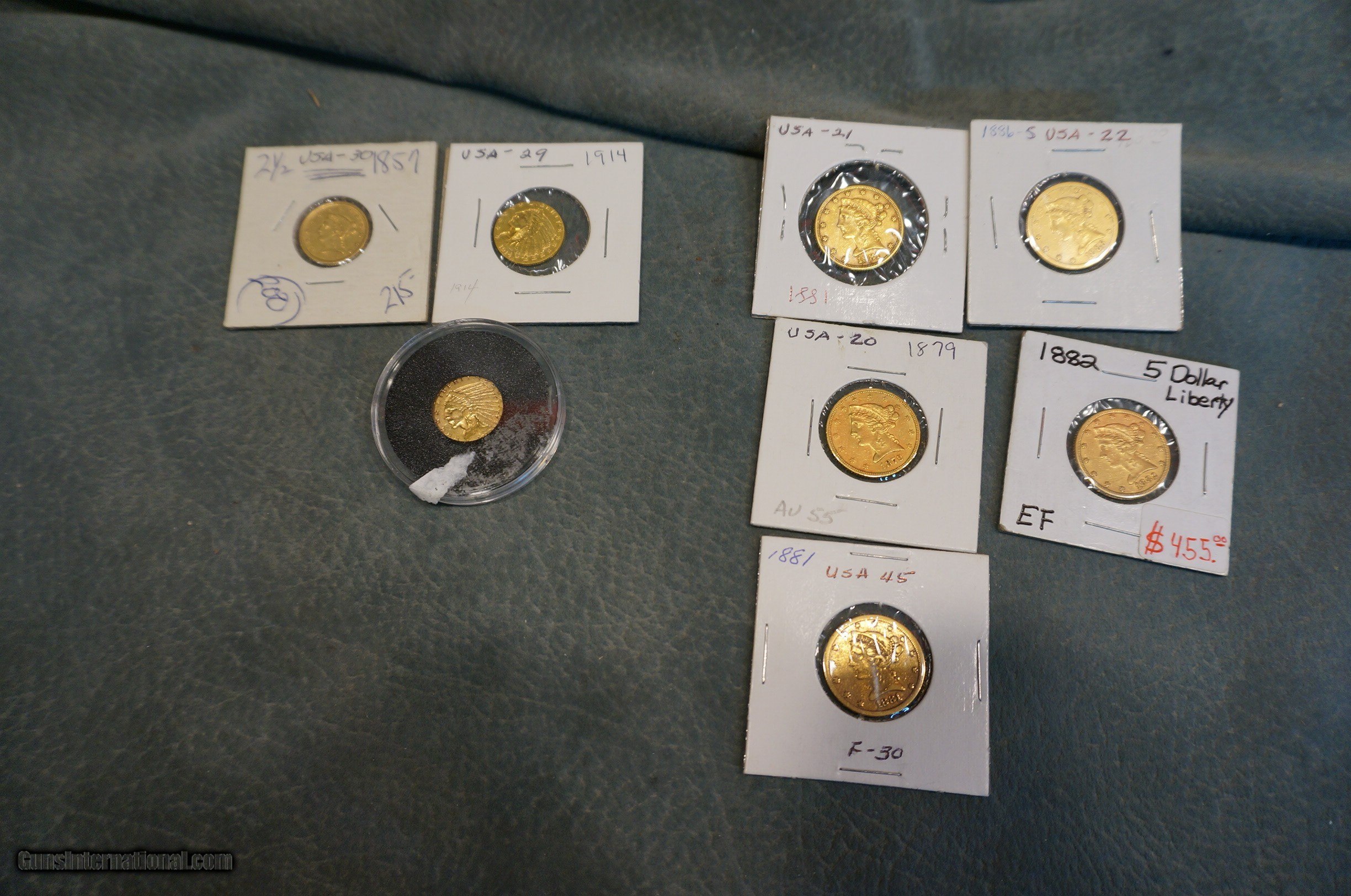 Description: US Gold Coins,1857,1913 and 1914 $2 1/2 quarter eagles $220 each($200 melt value at $1670 gold)1879,2-1881,1882,1886-S $5 half eagles .24oz pure gold ($400 melt value) $430 each.Still legal tender,great old west collectables! GUN COLLECTIONS WANTED FOR CASH! We buy, sell, consign and trade new and used firearms. This is our 44th year in business. We offer 90 day layaways with 20% down. No return on layaways. Firearms will need to be transferred through a FFL dealer. Prices reflect a cash discount. There will be 3% added to credit card sales. We trade for gold and silver. THANK YOU! SOLD |