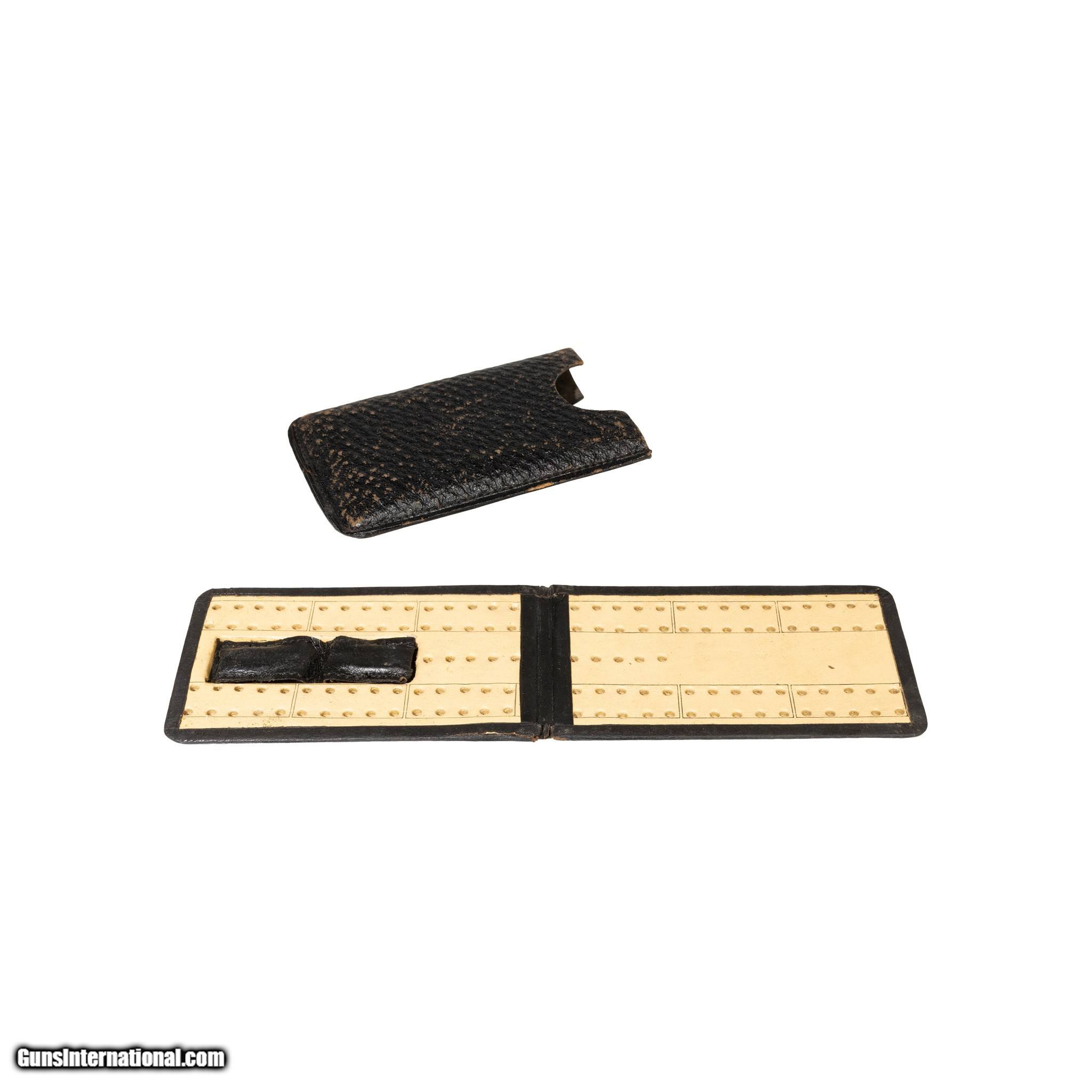 Description: Vintage vest pocket cribbage board made of faux ivory. Folds in and out for carrying in a vest pocket, and comes with small case. Piece is in great condition and is perfect for continued use or display in a western gaming collection. Rare and desirable. Size: Open 7" x 2" with pins Family Owned & Operated Cisco’s Gallery deals in the rare, exceptional, and one-of-a-kind pieces that define the history of America and the Old West. Our pieces range from American Indian to Cowboy Western and include original items of everyday life, commerce, art, and warfare that tamed America’s frontier. Our 14,000 square foot gallery opened in 1996 in beautiful Coeur d’Alene, Idaho. Personal Service Cisco’s operates on old fashioned values – honesty and integrity, and all of our items are backed by our money back guarantee. We appreciate the opportunity to earn your business. Whether you desire assistance with a jewelry purchase, choosing a gift, identification, or even selling – we hope to be your trusted source. SOLD |