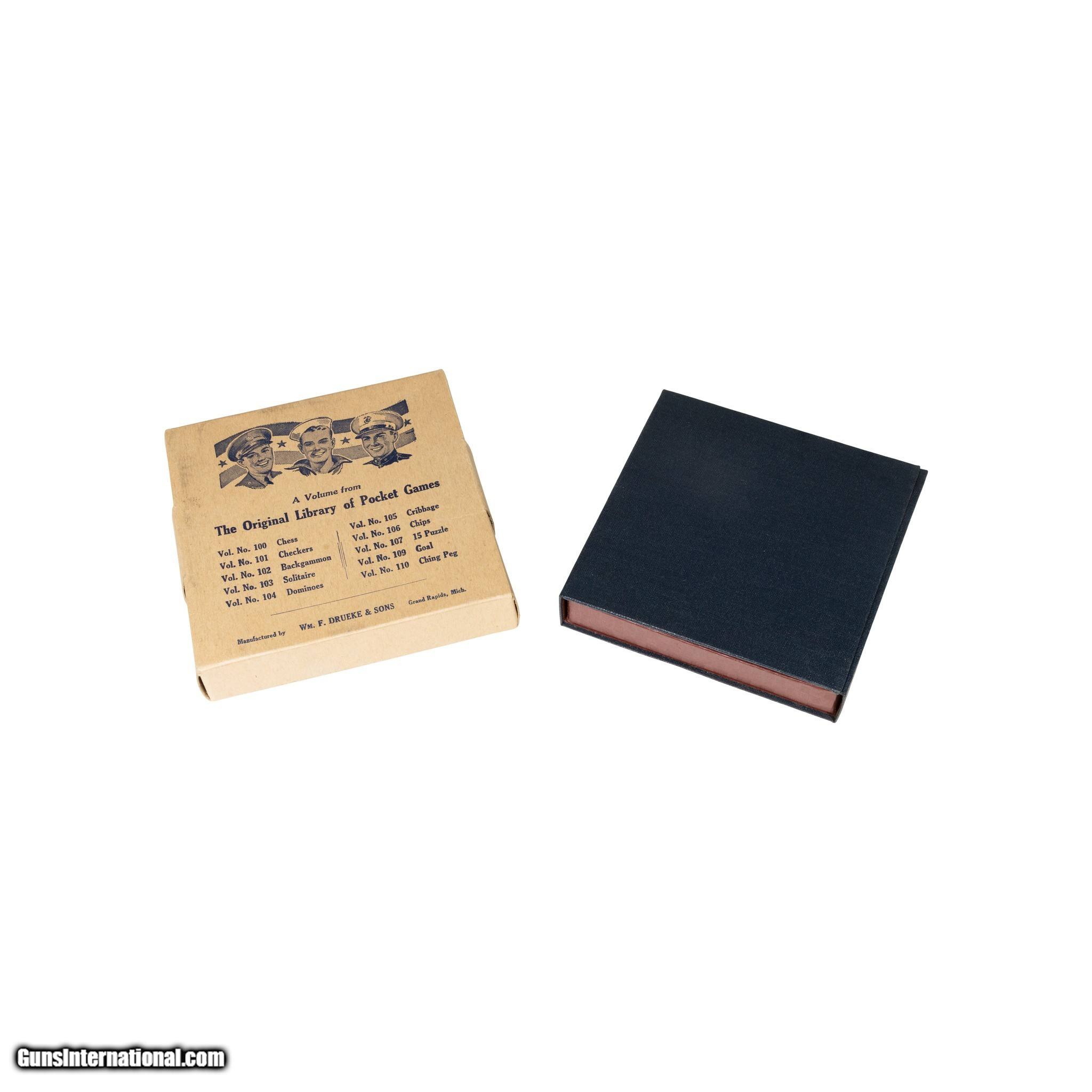 Description: W.F. Drueke & Sons pocket cribbage board. New in original case and box. These were made to send to soldiers during wartime. All pieces included and in great condition. Would be a great addition to a vintage game collection, or could even be sent to a member of the armed forces of your own. Size: 5" x 5" Family Owned & Operated Cisco’s Gallery deals in the rare, exceptional, and one-of-a-kind pieces that define the history of America and the Old West. Our pieces range from American Indian to Cowboy Western and include original items of everyday life, commerce, art, and warfare that tamed America’s frontier. Our 14,000 square foot gallery opened in 1996 in beautiful Coeur d’Alene, Idaho. Personal Service Cisco’s operates on old fashioned values – honesty and integrity, and all of our items are backed by our money back guarantee. We appreciate the opportunity to earn your business. Whether you desire assistance with a jewelry purchase, choosing a gift, identification, or even selling – we hope to be your trusted source. SOLD |