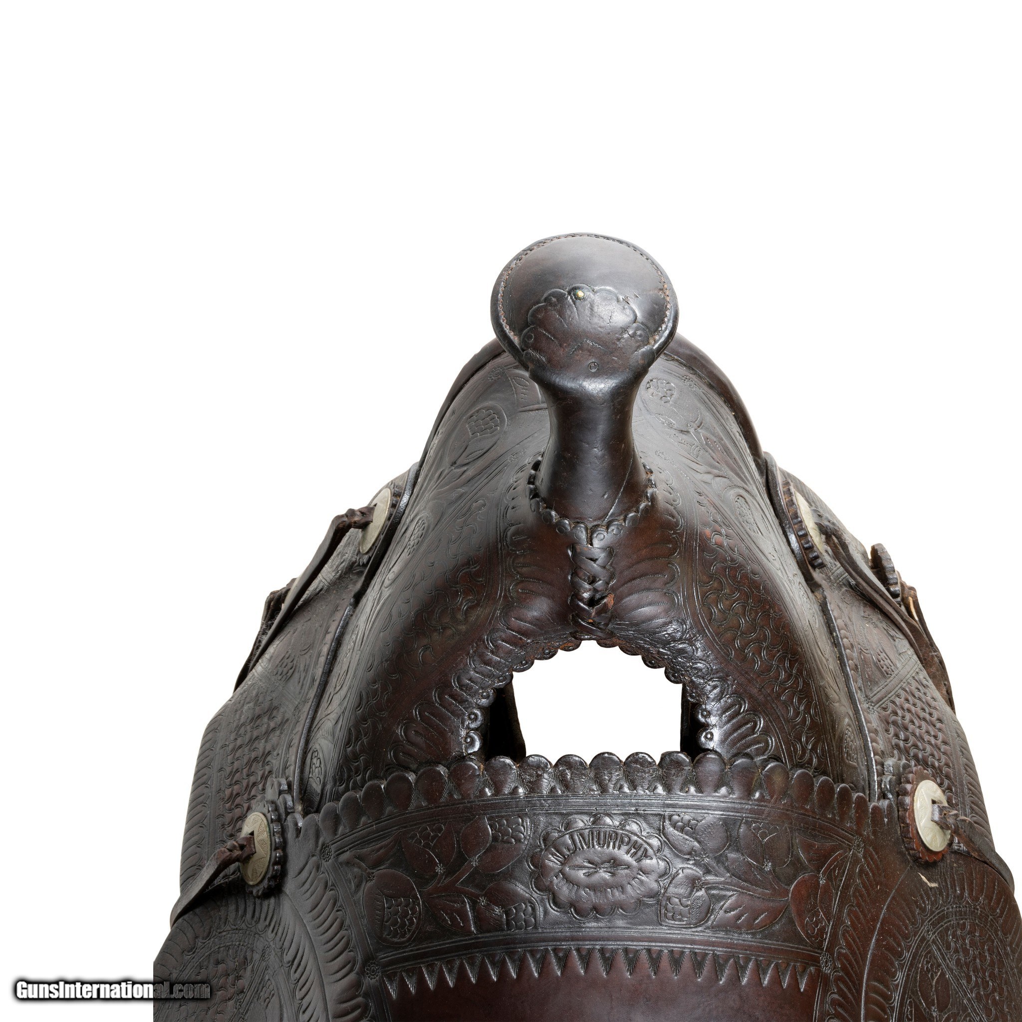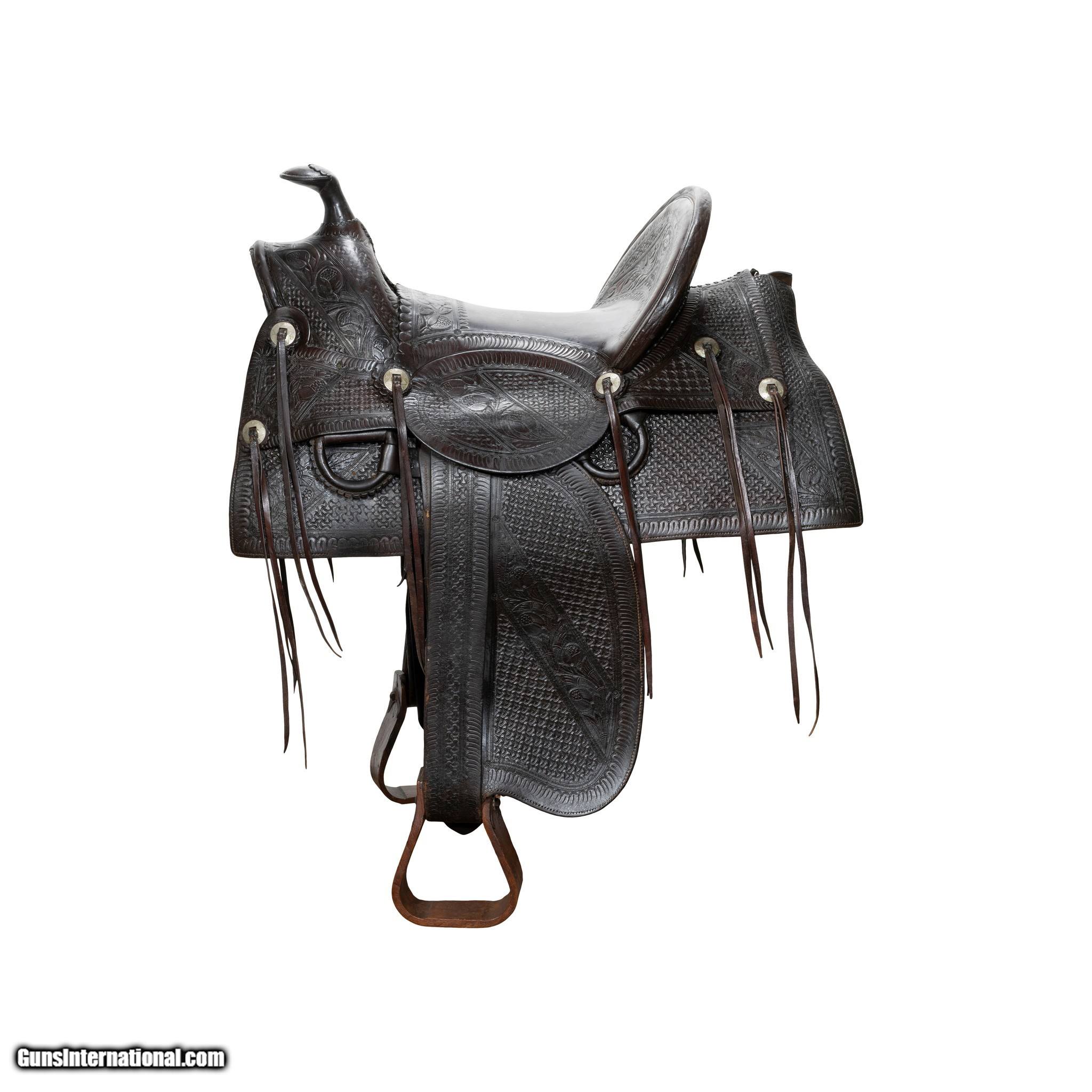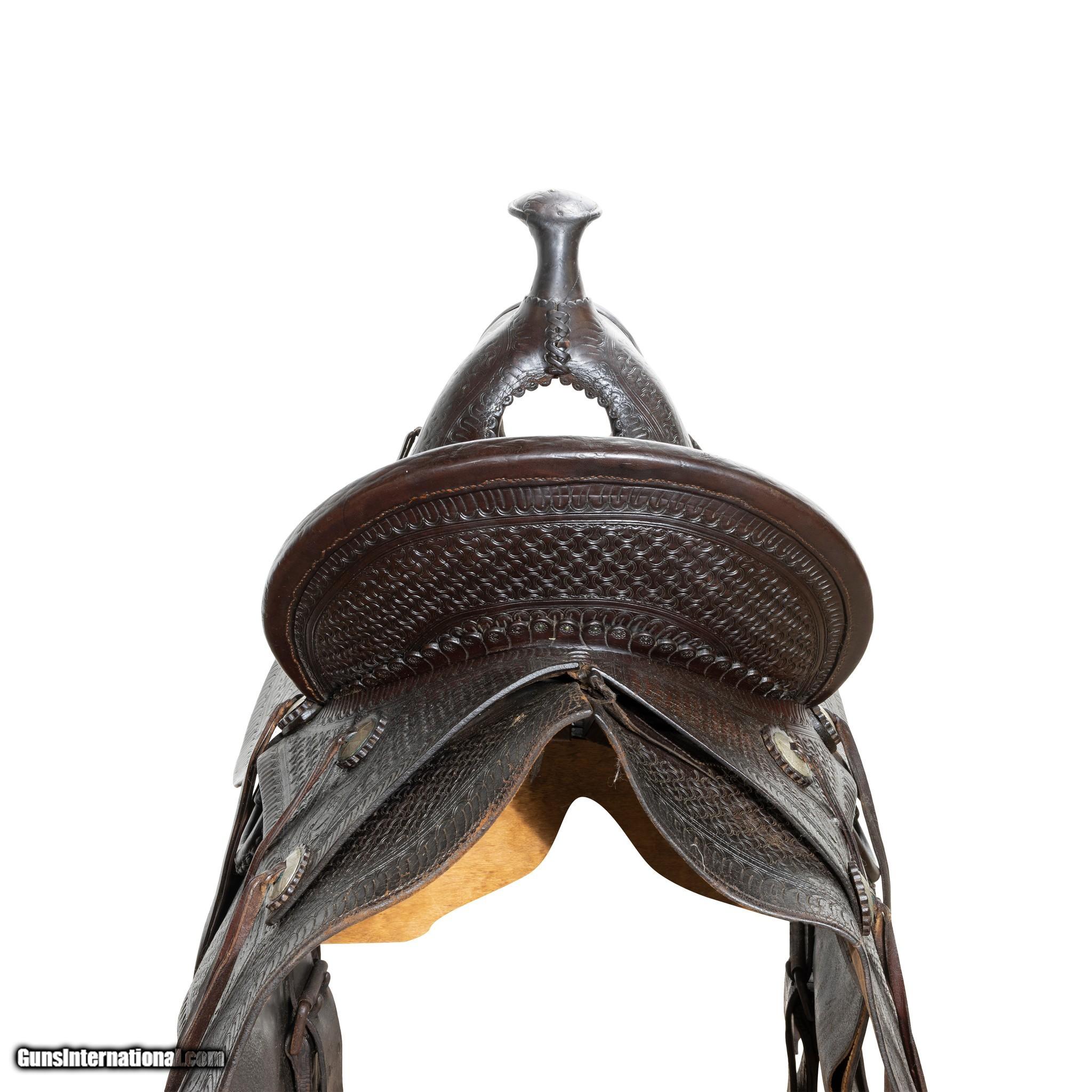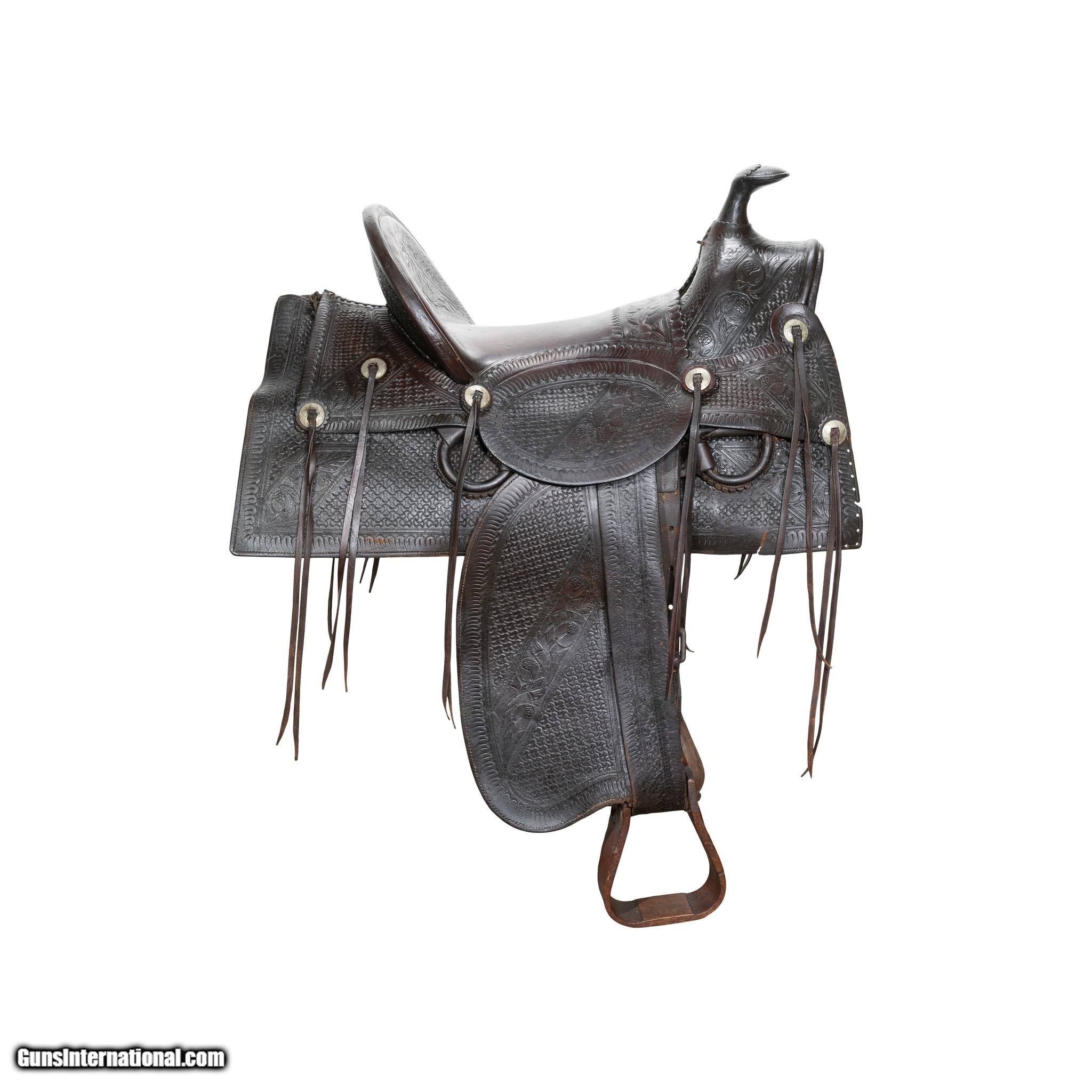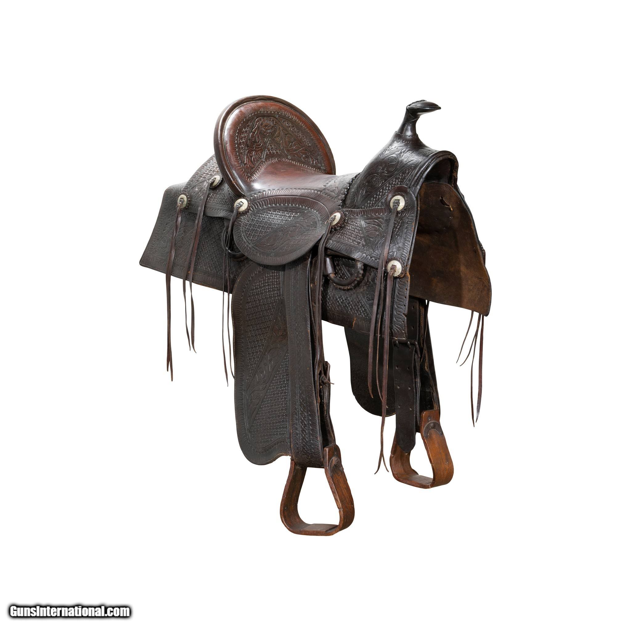 Description: Nice early high back floral tooled saddle marked "W.J. Murphy Fort Smith Ark.". Very desirable A fork with 16" seat and square skirt. 5" cantle. Leather supple. Saddle is in good condition. This is the type of saddle used to decorate your cowboy rooms. W. J. Murphy Saddlery and Harness business owner. Fleece removed at some point. 16" seat. Family Owned & Operated Cisco’s Gallery deals in the rare, exceptional, and one-of-a-kind pieces that define the history of America and the Old West. Our pieces range from American Indian to Cowboy Western and include original items of everyday life, commerce, art, and warfare that tamed America’s frontier. Our 14,000 square foot gallery opened in 1996 in beautiful Coeur d’Alene, Idaho. Personal Service Cisco’s operates on old fashioned values – honesty and integrity, and all of our items are backed by our money back guarantee. We appreciate the opportunity to earn your business. Whether you desire assistance with a jewelry purchase, choosing a gift, identification, or even selling – we hope to be your trusted source. SOLD |