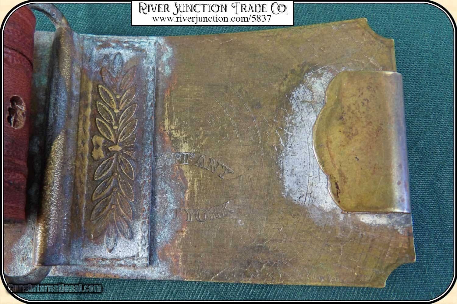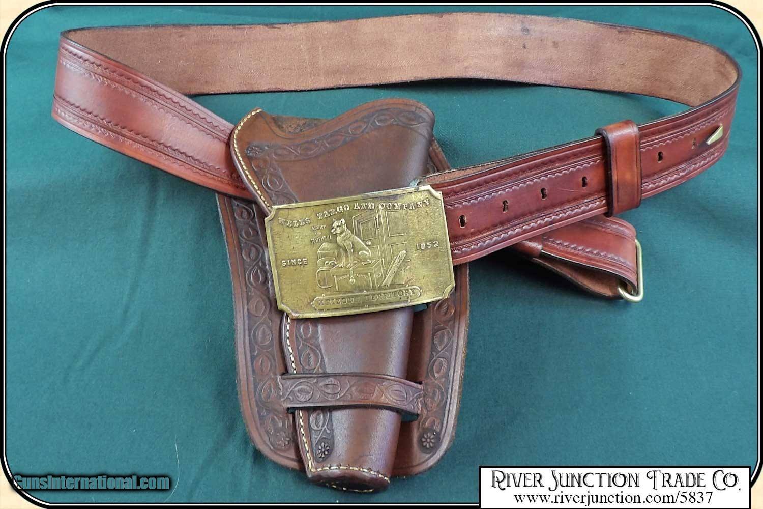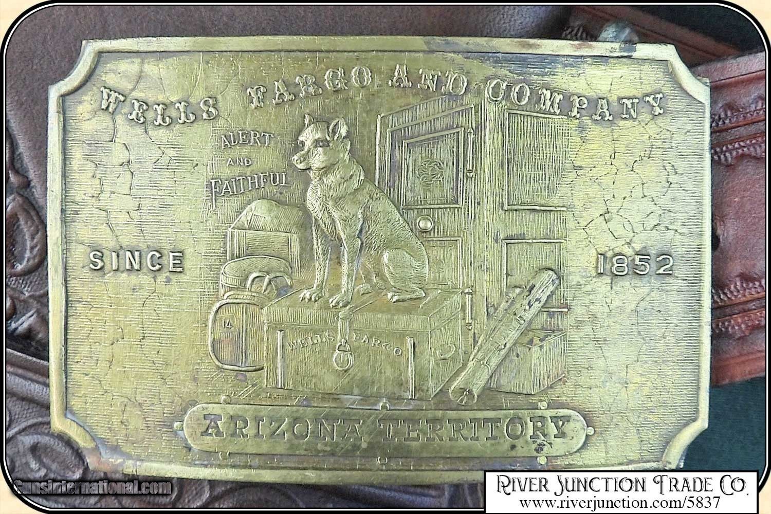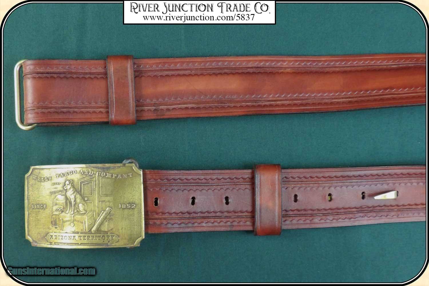 Description: WELLS FARGO EXPRESS AGENTS BELT FOR CARRYING KEYS, GUN AND HOLSTER.: Perfect for your Wells Fargo agent or Inspectors outfit. The agent provided secure shipping of goods over the nation’s railroads through the early years of Wells Fargo. The belt is a one size fits all and has an overall smooth, bright finish and an even brown color. The Cast Bronze buckle has a relief of “Wells, Fargo & Company” above a guard dog sitting on top of a Wells Fargo Chest with "Alert and Faithful Since 1852". Below the scene is "Arizona Territory". These buckles are in very limited supply. When they are gone there will be no more. The holster pictured is not included. Payment: Item, can be ordered on line with a credit card or paypal on our sight. Just Google (riverjunction) and type in the River Junction Trade Co. item number (5837) in the search box. Before you checkout you will see shipping cost and total. OR If you prefer: Pay by cash, postal money order, cashiers check, personal & business checks. We wait for checks to clear. We always answer questions and entertain offers. Have questions? Call me 563-880-4588. Jim SOLD |