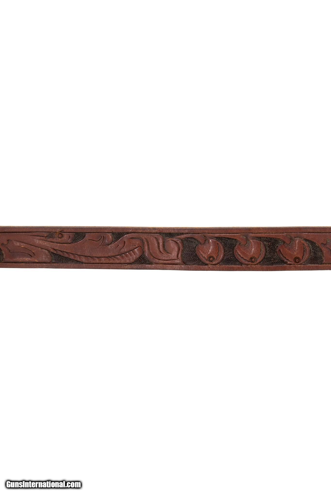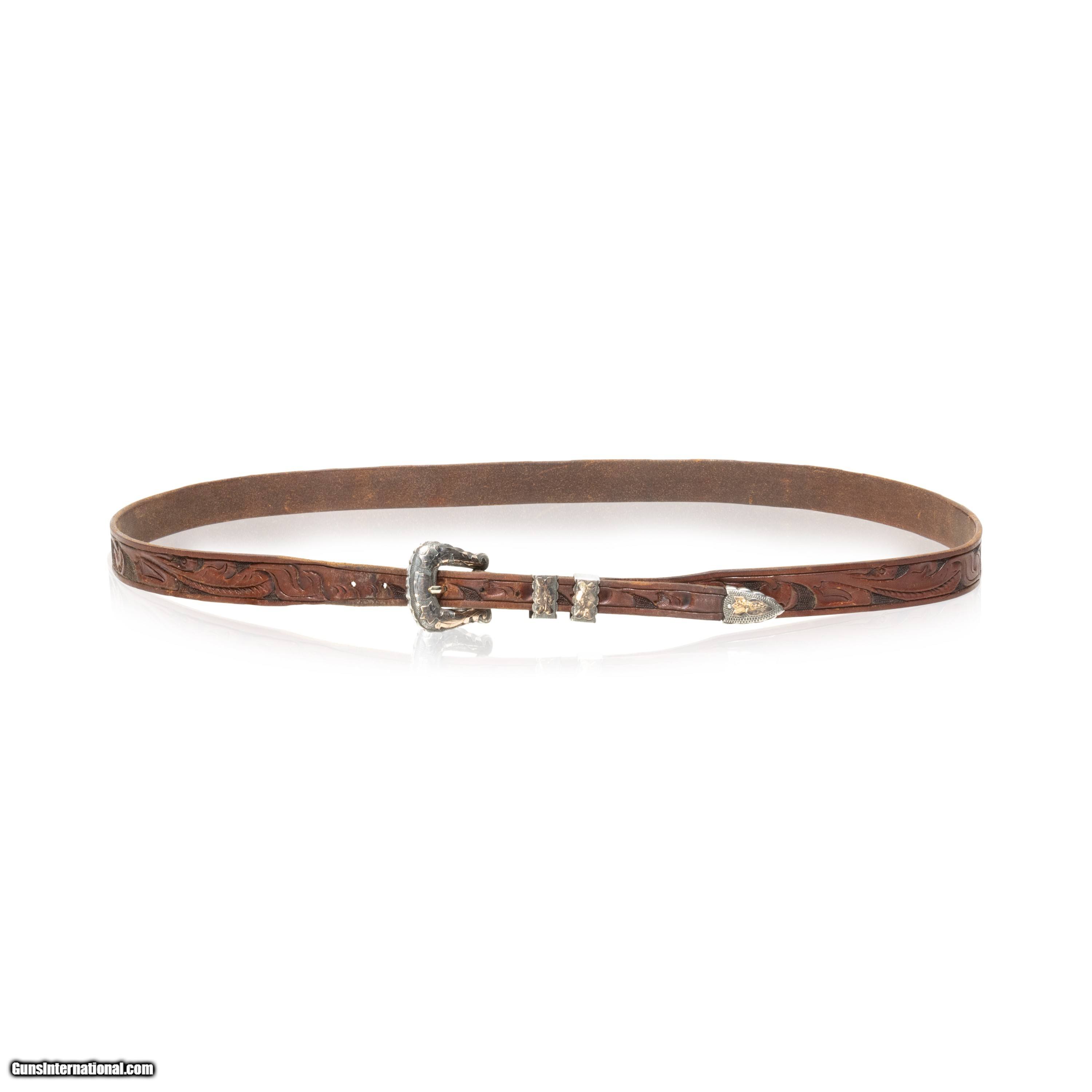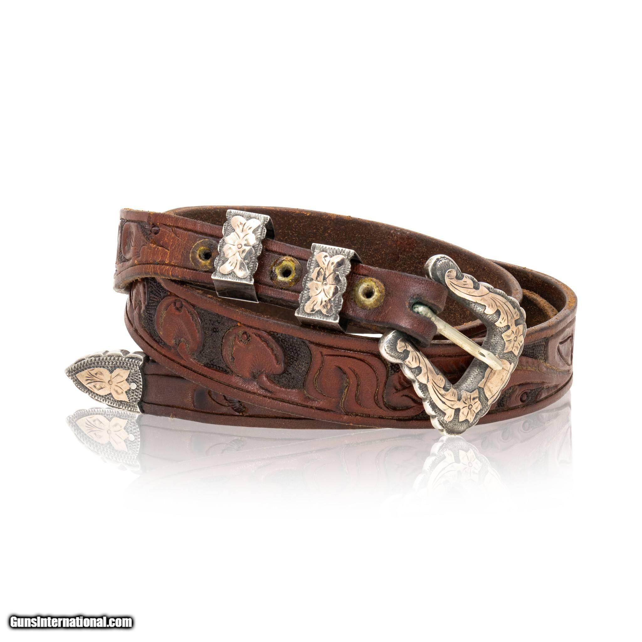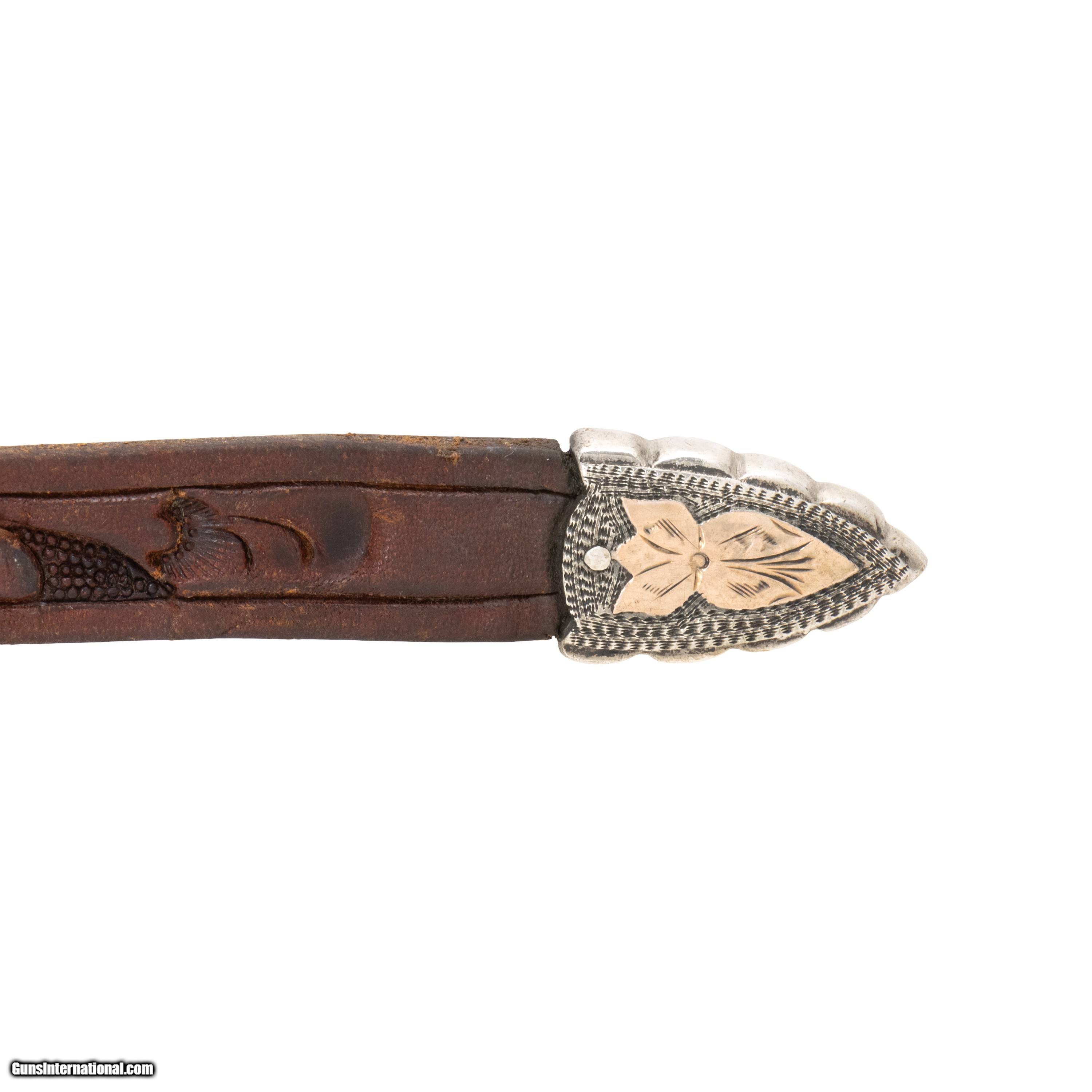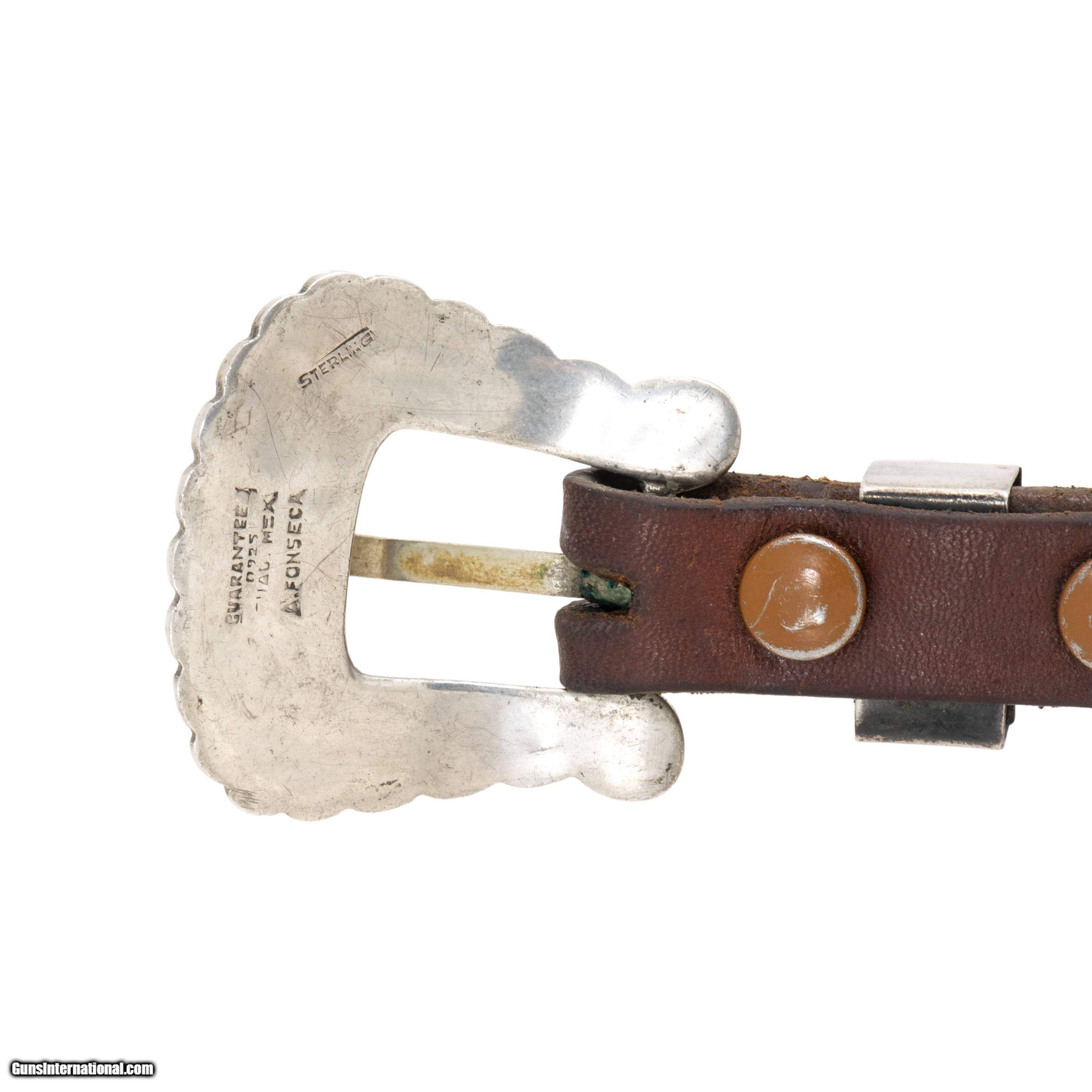 Description: Western leather and sterling silver ranger belt and buckle. Marked .925 with maker's mark A. Fonseca. Buckle featuring floral overlay designs in a soft golden color. Minimal patina. Belt has tooled leather design featuring small leaves across. In good condition, would complement a casual or formal Western style nicely. Size: 48"L, 1"W Family Owned & Operated Cisco’s Gallery deals in the rare, exceptional, and one-of-a-kind pieces that define the history of America and the Old West. Our pieces range from American Indian to Cowboy Western and include original items of everyday life, commerce, art, and warfare that tamed America’s frontier. Our 14,000 square foot gallery opened in 1996 in beautiful Coeur d’Alene, Idaho. Personal Service Cisco’s operates on old fashioned values – honesty and integrity, and all of our items are backed by our money back guarantee. We appreciate the opportunity to earn your business. Whether you desire assistance with a jewelry purchase, choosing a gift, identification, or even selling – we hope to be your trusted source. SOLD |