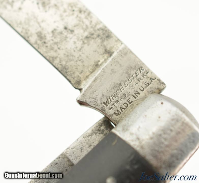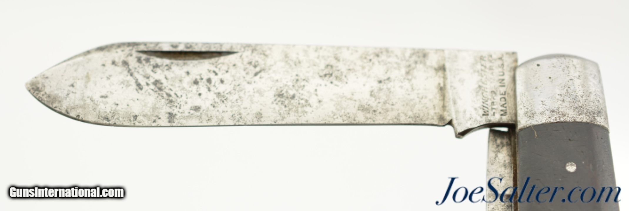 Description: This is a vintage Winchester 3 1/2" Cocobolo Jack knife with 2 blades. The Cocobolo wood handles show signs of long use, deep patina. Nickel Silver Bolster with some pitting. Snaps Open and Shut nicely with a slight wobble on the main blade. The main blade shows some light pitting, nice markers mark with the smaller blade about the same. Please see photo's for finer detail. Price: $99.00 Contact Seller |
