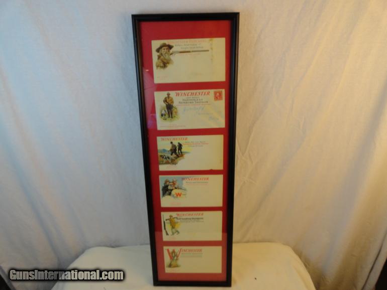 Wonderful framed set of six full color circa 1900 Winchester Advertising Covers. Each one has the private dealer name stamped under the full color artwork. Includes the poplar cowboys with rifles on the rock, four different shotgun hunting scenes and the Model 1886 (scarce in color version)