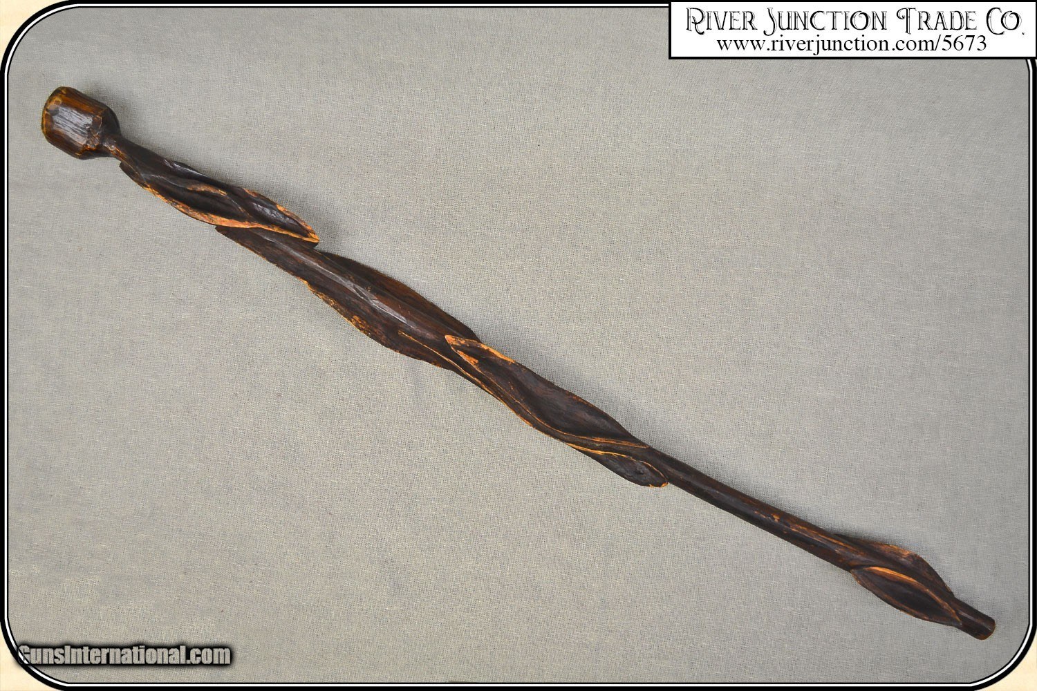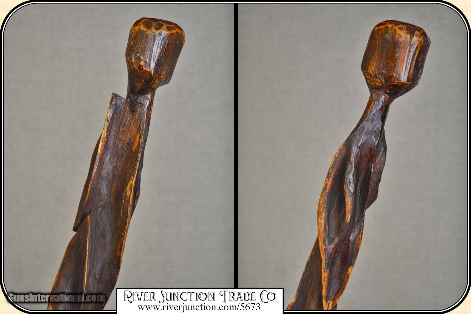 Description: A great antique diamond willow cane. Created from a single piece of diamond willow, it has a carved bulbous handle on top that is about 2 inches in diameter. There are thirteen diamonds running down the shaft with some inside another. The piece was made without a ferrule. (The unusual diamond pattern in this type of willow is caused by a naturally occurring fungus. The raw diamonds are then enhanced by shaping and staining. American Indians have been making these canes for hundreds of years. The particular Diamond Willow trees are indigenous primarily to the Missouri Valley of America. The overall length is 34 1/2 inches it has a few cracks in the diamond but is in good stable using condition. It was made in the last quarter of the 19th Century, and it is a great example fashioned by Sioux Indians at the Crow Creek Reservation. Payment: Item, can be ordered on line with a credit card or paypal on our sight. Just Google (riverjunction) and type in the River Junction Trade Co. item number (5673) in the search box. Before you checkout you will see shipping cost and total. OR If you prefer: Pay by cash, postal money order, cashiers check, personal & business checks. We wait for checks to clear. We always answer questions and entertain offers. Have questions? Call me 563-880-4588. Jim SOLD |