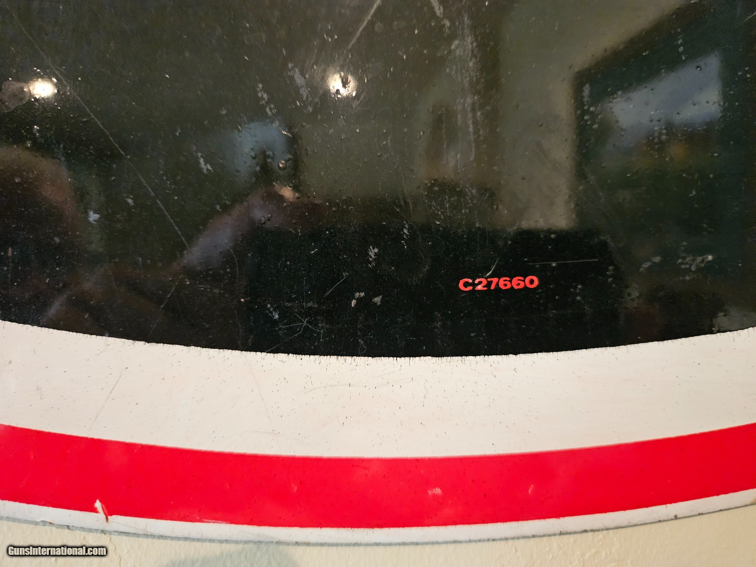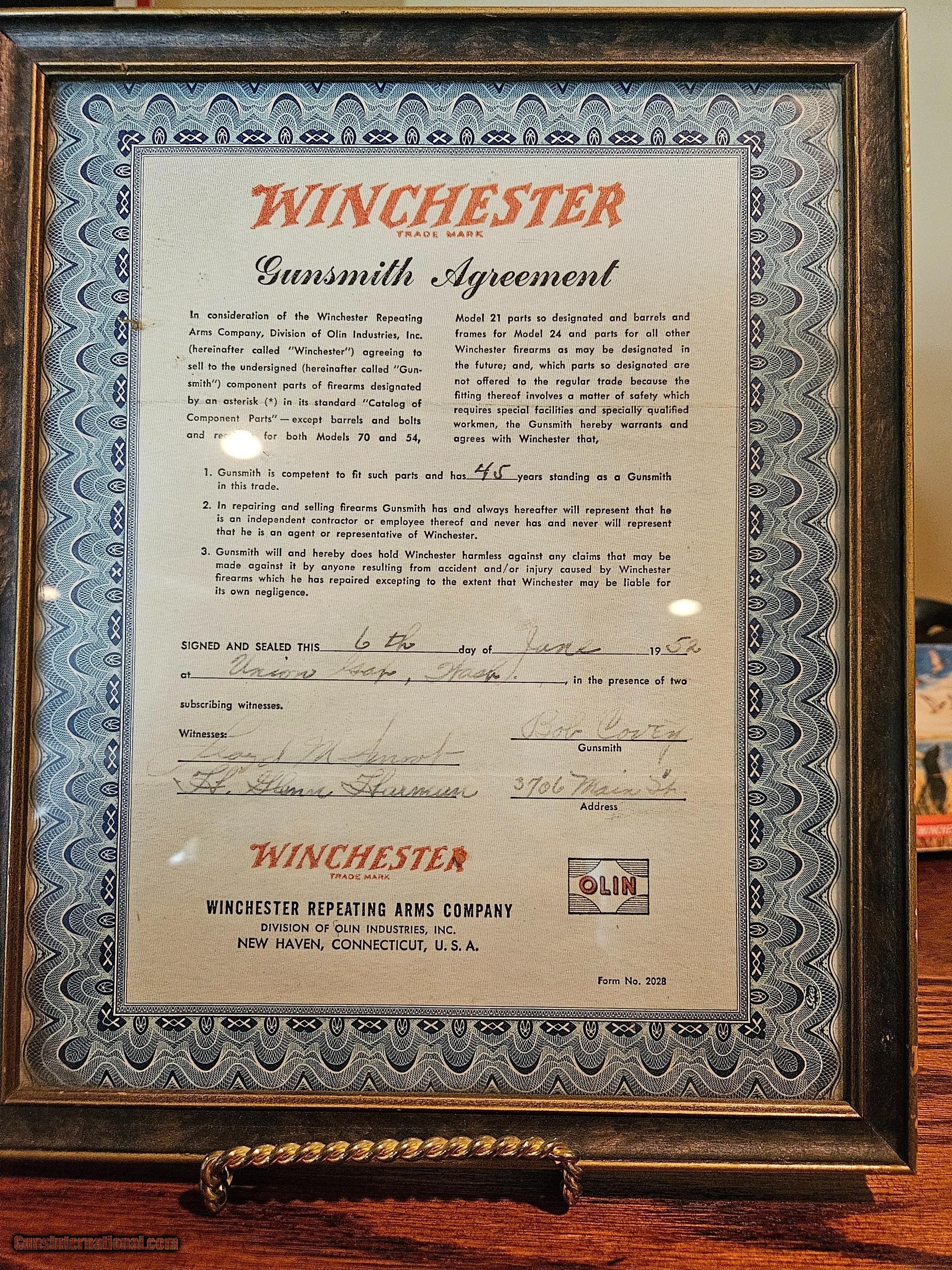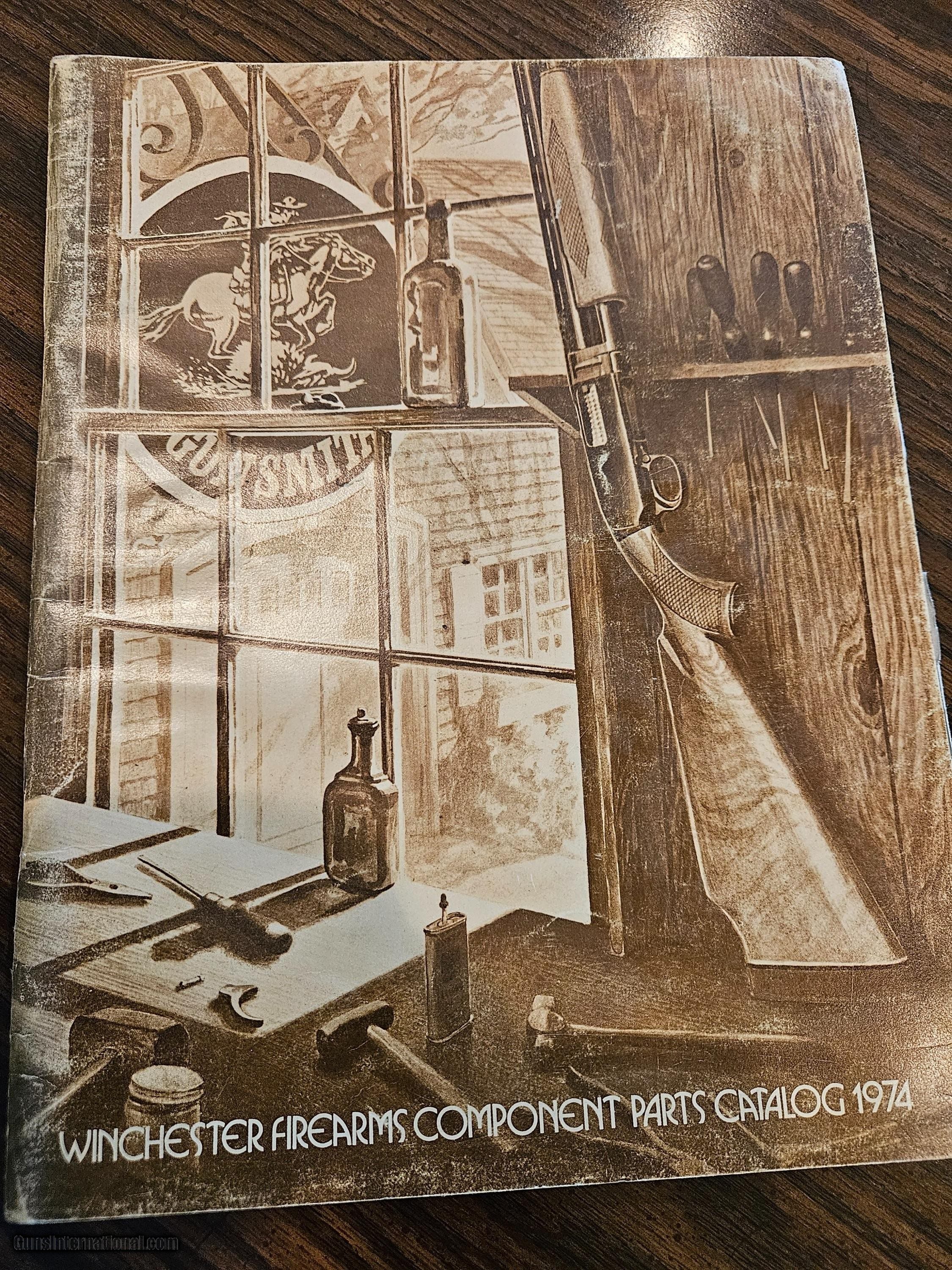 Description: This is a 38 inch double sided advertising sign. Has Winchester catalog number in small print at bottom. Has a few rub marks and light edge dings but remains in very nice condition. Est 1950's ca. Included is a framed Winchester gunsmith certificate and a 1974 parts catalog that cover shows similiar sign outside a store. Shipping extra SOLD |
