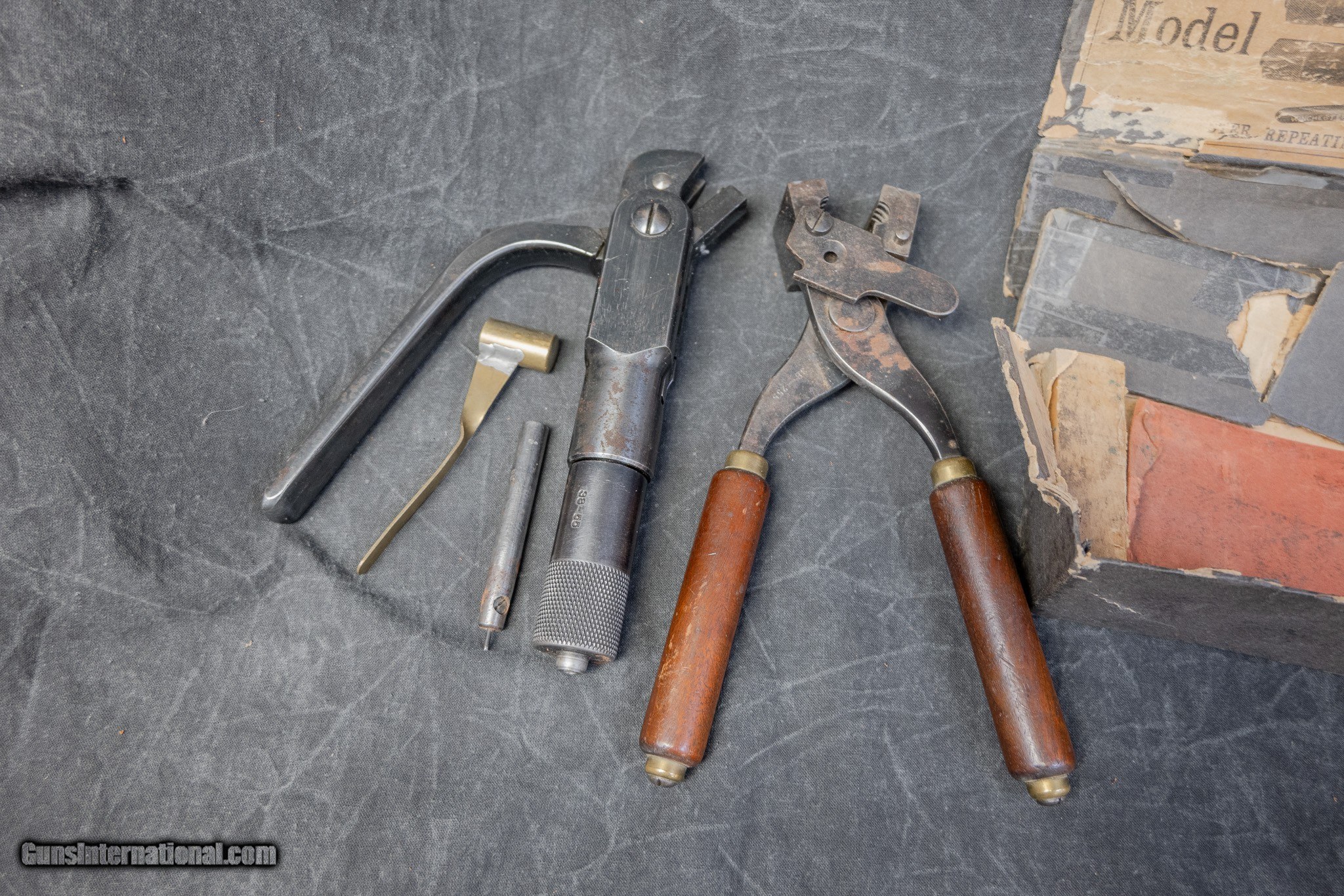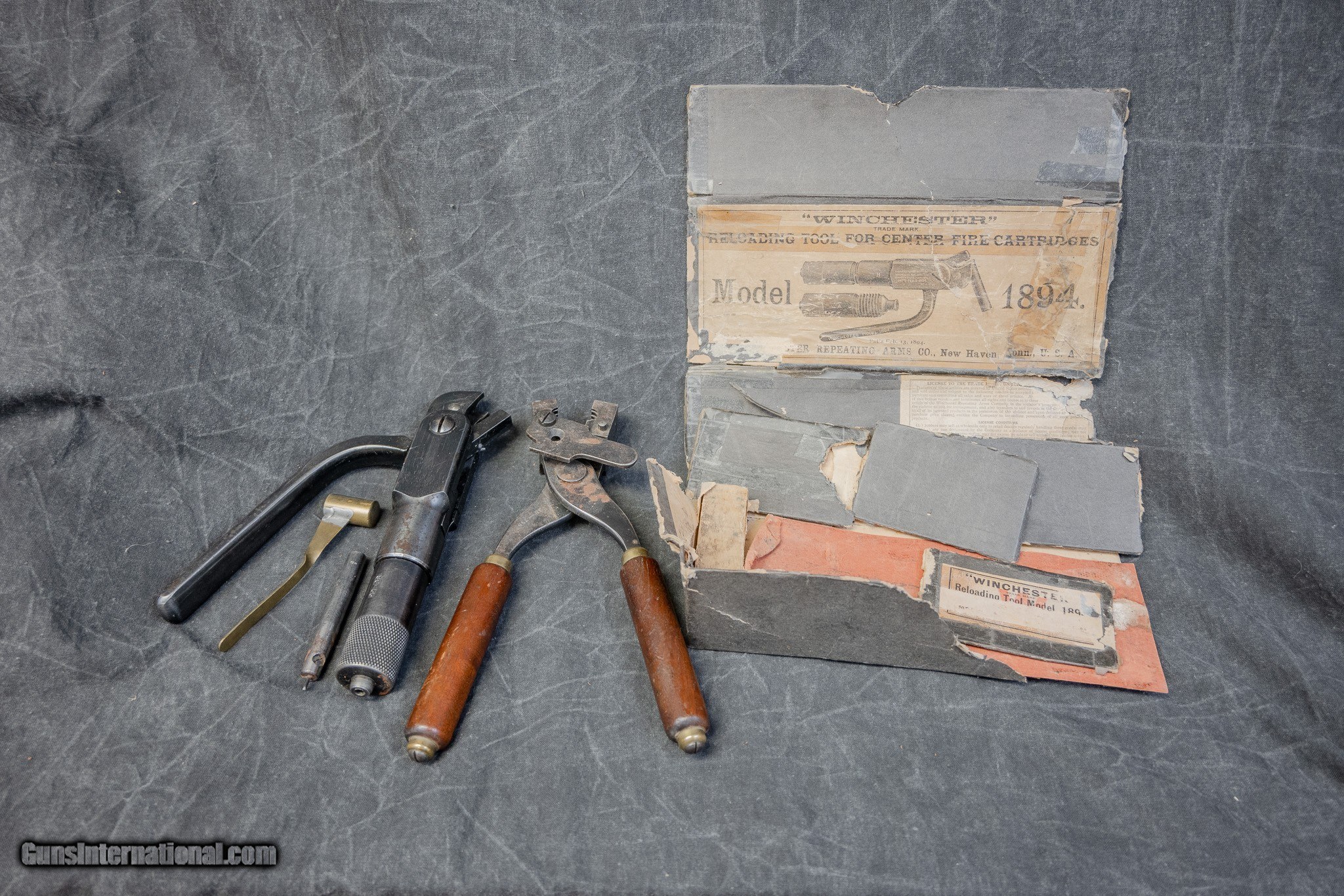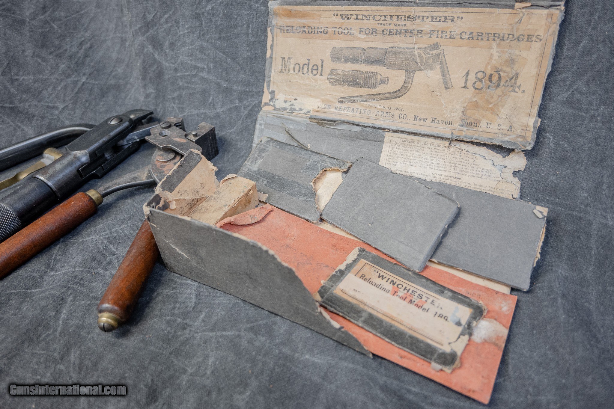 Description: WINCHESTER MODEL 1894 HAND LOADER & BULLET MOLD W/ BOX AND ACCESSORIES. FOR WINCHESTER 38-55 CALIBER ROUND CAN BE USED FOR BLACK & SMOKELESS POWDER BOTH WINCHESTER PRODUCTS. LOADER COMES WITH BOX(IN PIECES) BUT VERY LEGIBLE PRINTING ON BOX DE-PRIMING TOOL & BRASS POWDER LADLE CONDITION: VERY GOOD OVERALL SOLD |