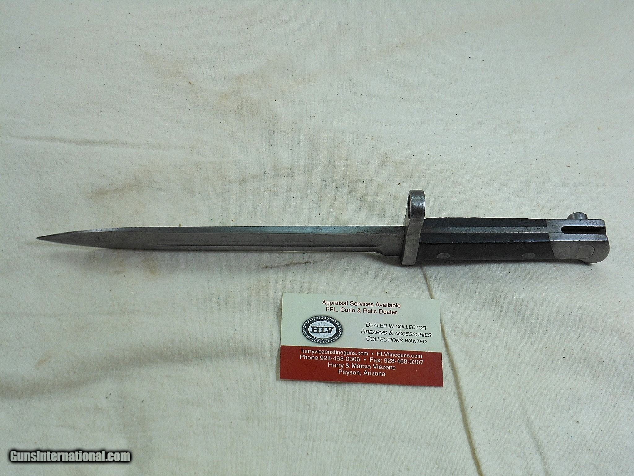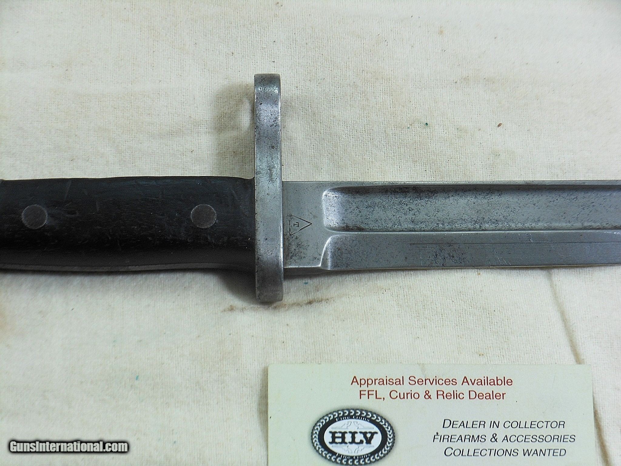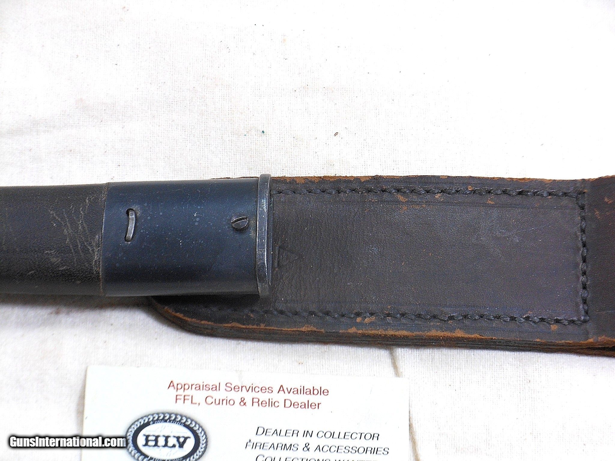 Description: SOLD This is an original Winchester Lee Navy bayonet and scabbard. This bayonet is properly marked with a Triangle and a T in the center of the Triangle. The "T" stands for Navy Inspector Ensign Nathan C. Twinning. He was the first Navy inspector of the Winchester Lee Navy Rifles and Accessories. The scabbard is also Triangle T Inspected. The blade has no nicks or damage to the blade. The blade has the original polished finish. The blade handle is in fine condition showing some service use and wear. The scabbard is also in very fine condition. The leather is in very fine condition with no loose stiching or damage. The leather and metal parts retain their original finish. These Winchester Lee Bayonets are rare today. This bayonet would certainly enchance the looks of a Winchester Lee rifle to display! CKE (3) F. No. 596 -22 SOLD Rifle Caliber: 6mm Lee Navy |