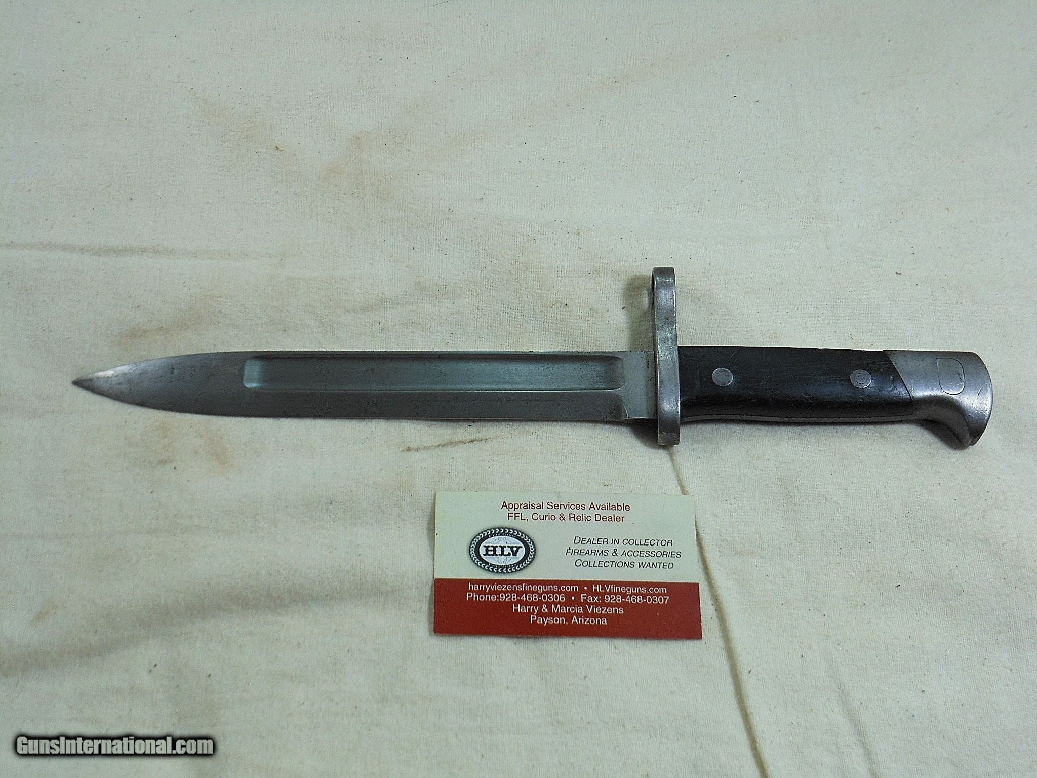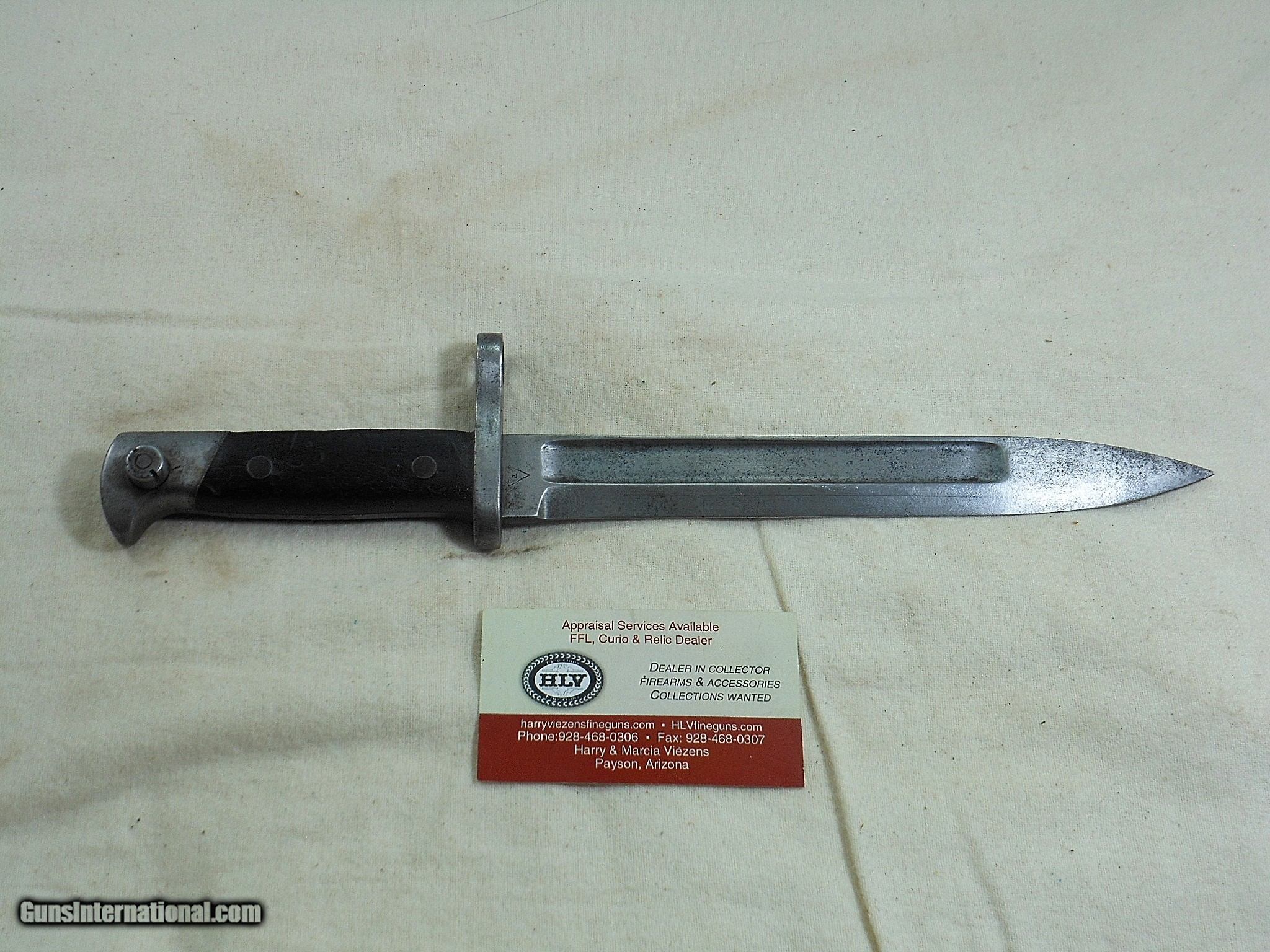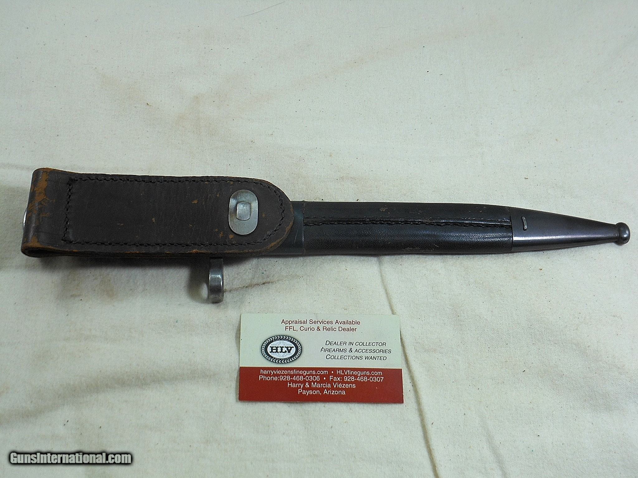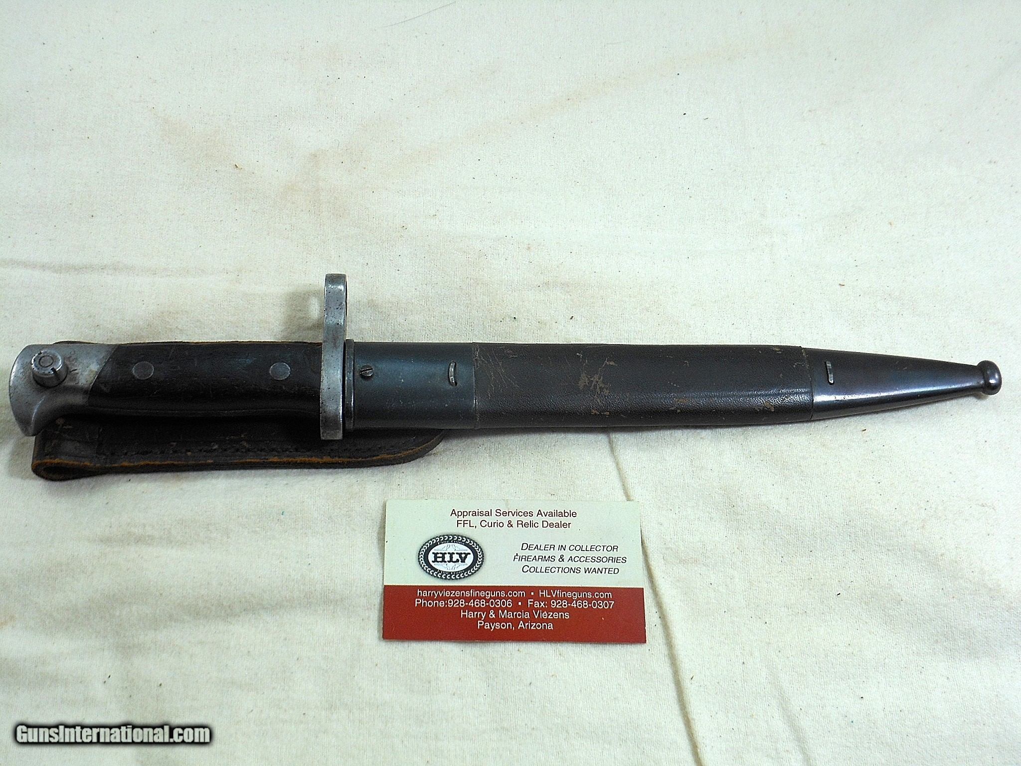 Description: SOLD This is an original Winchester Lee Navy bayonet and scabbard. This bayonet is properly marked with a Triangle and a T in the center of the Triangle. The "T" stands for Navy Inspector Ensign Nathan C. Twinning. He was the first Navy inspector of the Winchester Lee Navy Rifles and Accessories. The scabbard is also Triangle T Inspected. The blade has no nicks or damage to the blade. The blade has the original polished finish. The blade handle is in fine condition showing some service use and wear. The scabbard is also in very fine condition. The leather is in very fine condition with no loose stiching or damage. The leather and metal parts retain their original finish. These Winchester Lee Bayonets are rare today. This bayonet would certainly enchance the looks of a Winchester Lee rifle to display! CKE (3) F. No. 596 -22 SOLD Rifle Caliber: 6mm Lee Navy |