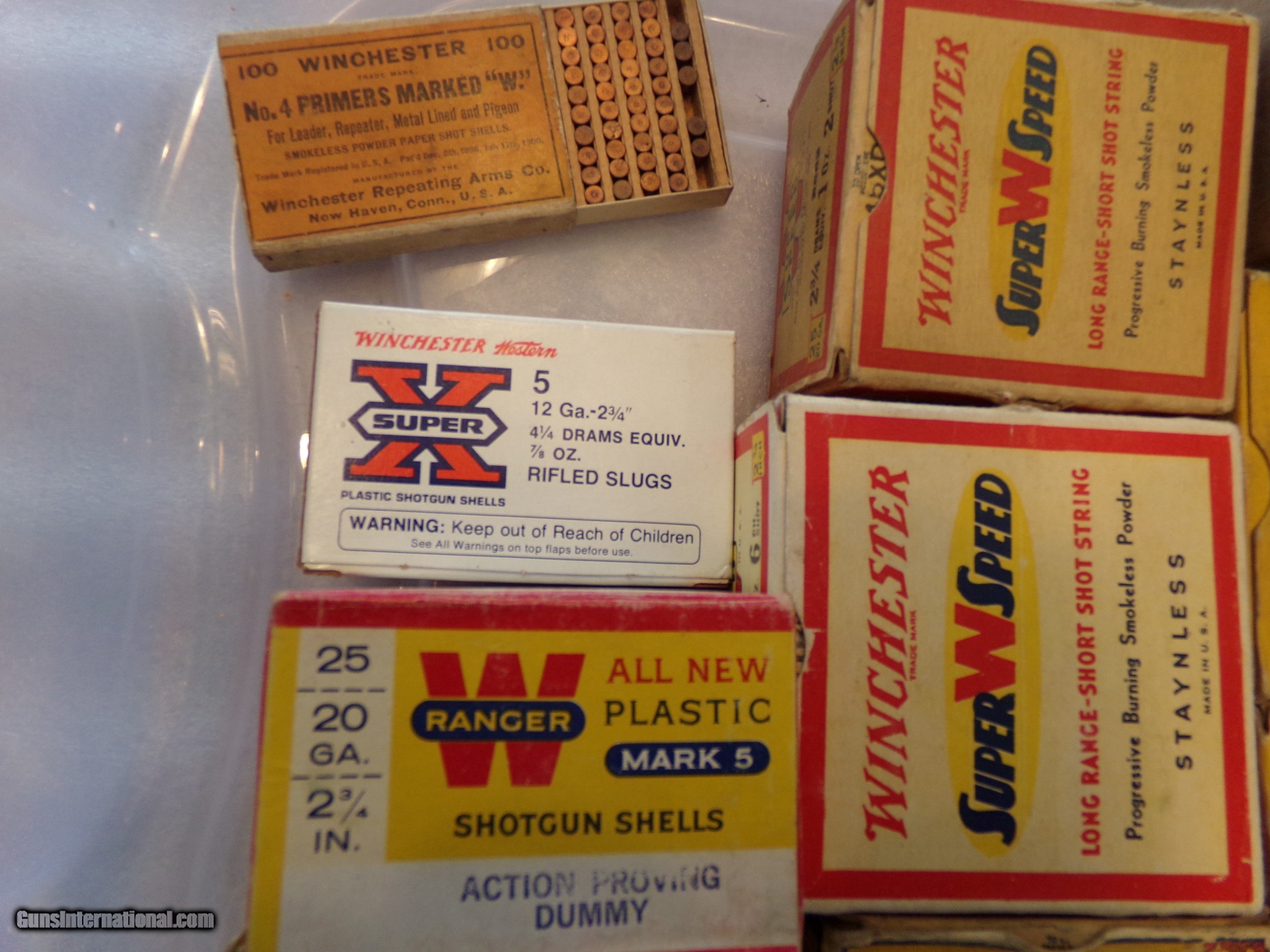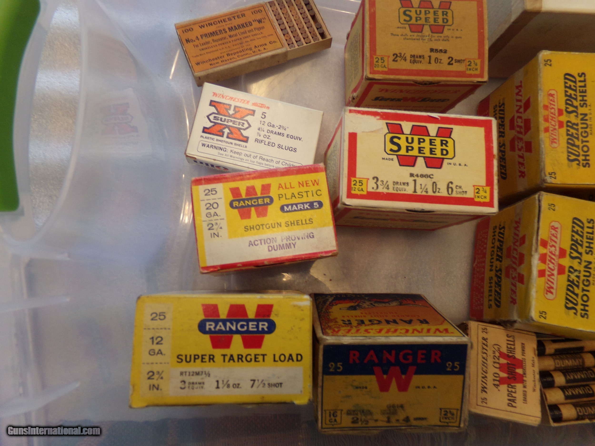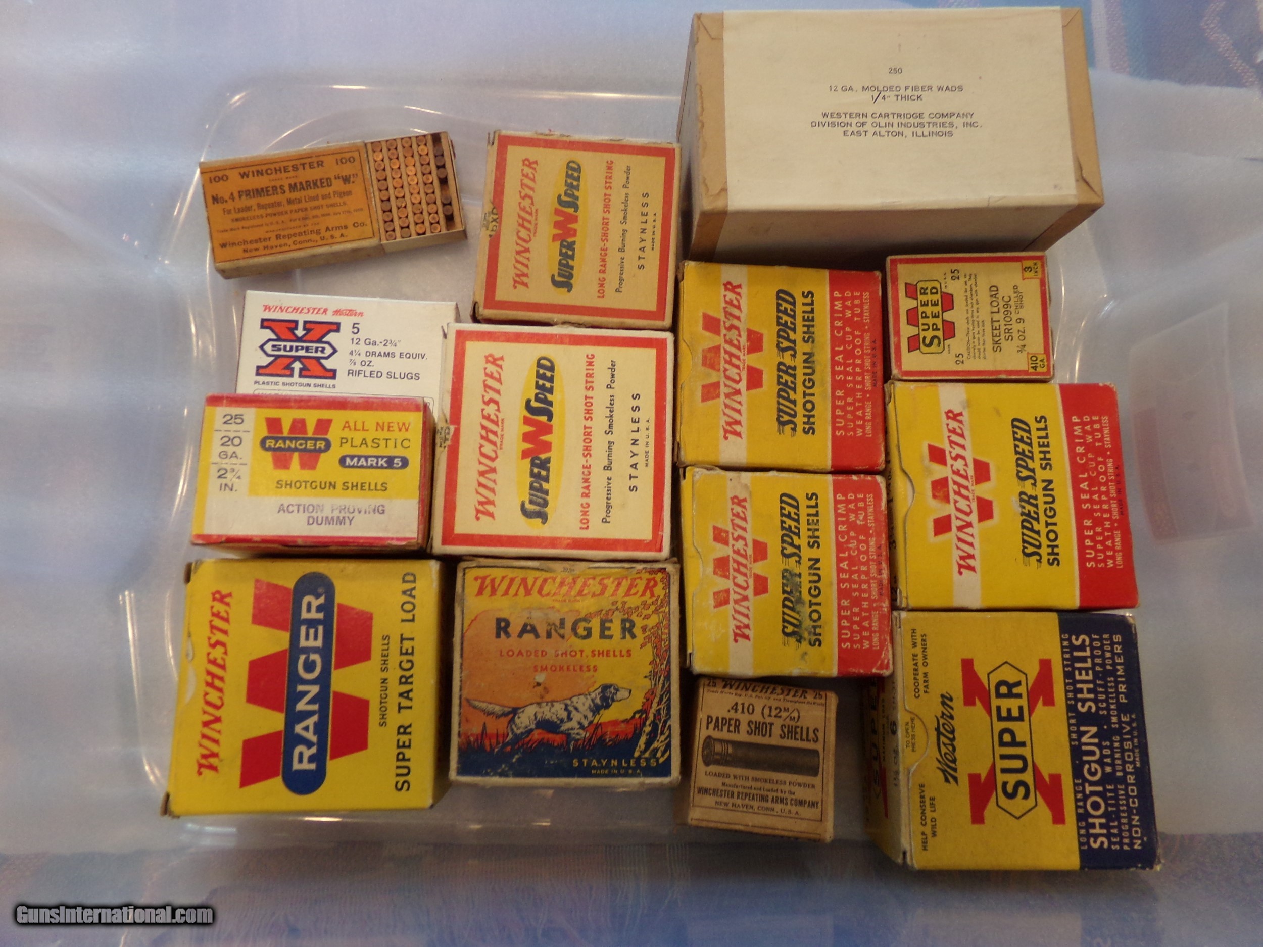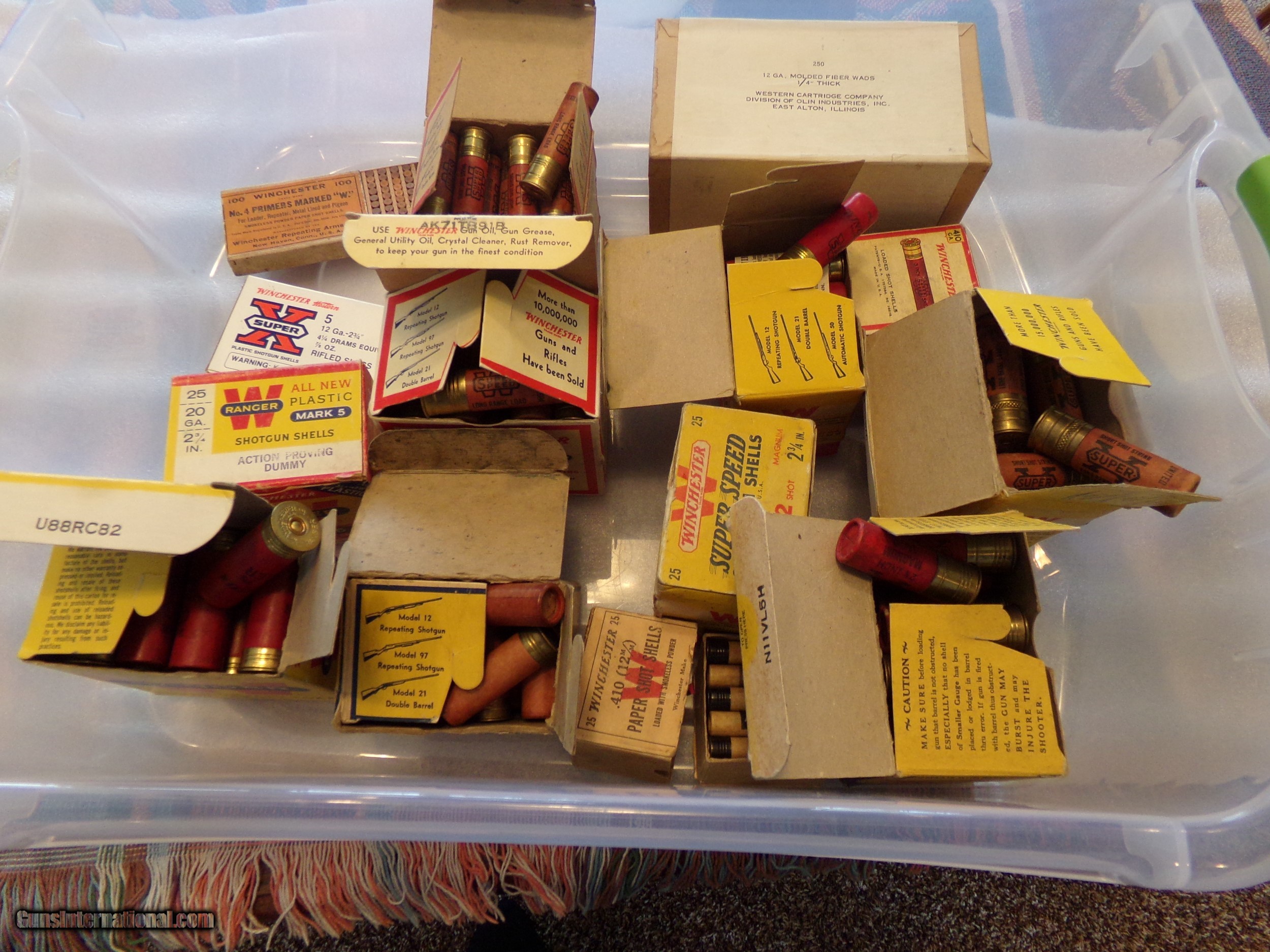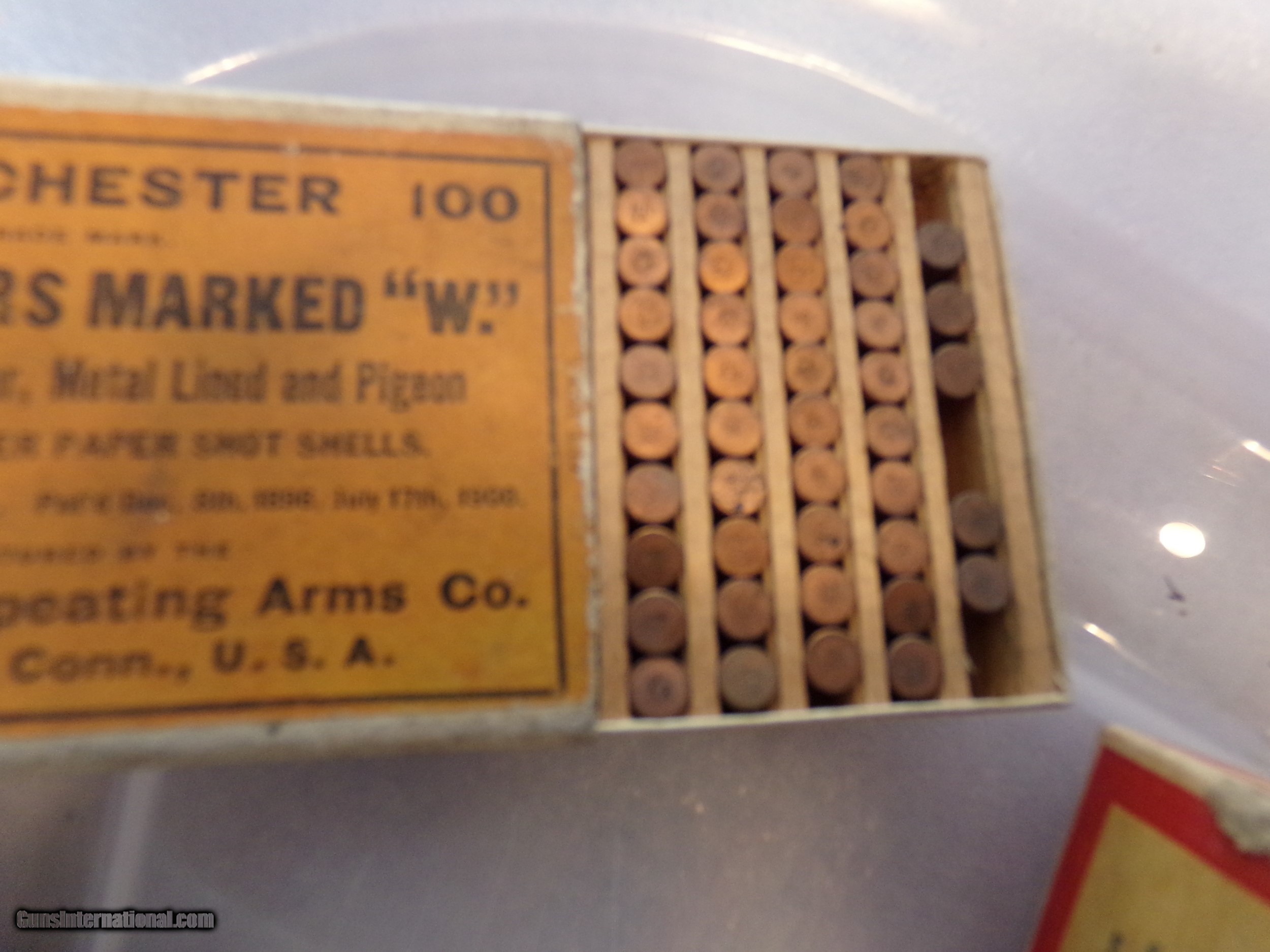Description: Hi from wintery Idaho. A year ago I listed dozens of old winchester shotshells and cartridges. You response was overwhelming. Most sold in just a few short weeks. These 14 remaining shotshell boxes, according to my wife, must go. She is reclaiming her house. The boxes are some full original, some part and original and some have some strays mixed in. The old primer "W" wooden tray box is missing a few but is a very collectable guy. Wish to sell all as 1 but call me if you prefer something different. I want to ship these next Friday, Jan.11 so please call or email any offers to me soon. And Thanks again. SOLD |