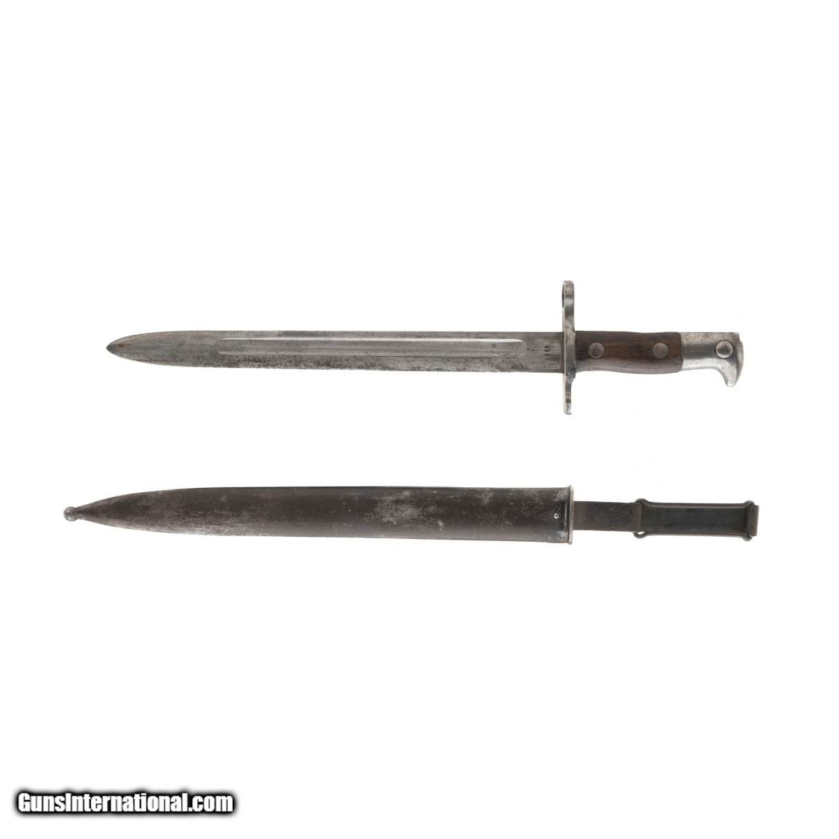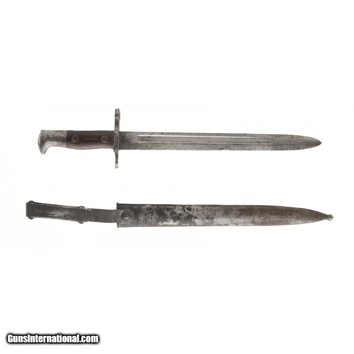 Description: " 1899 dated U.S. Springfield Krag rifle 11.5-inch bayonet & sheath/scabbard. Both items are in good condition with natural patina on metal parts. SOLD |