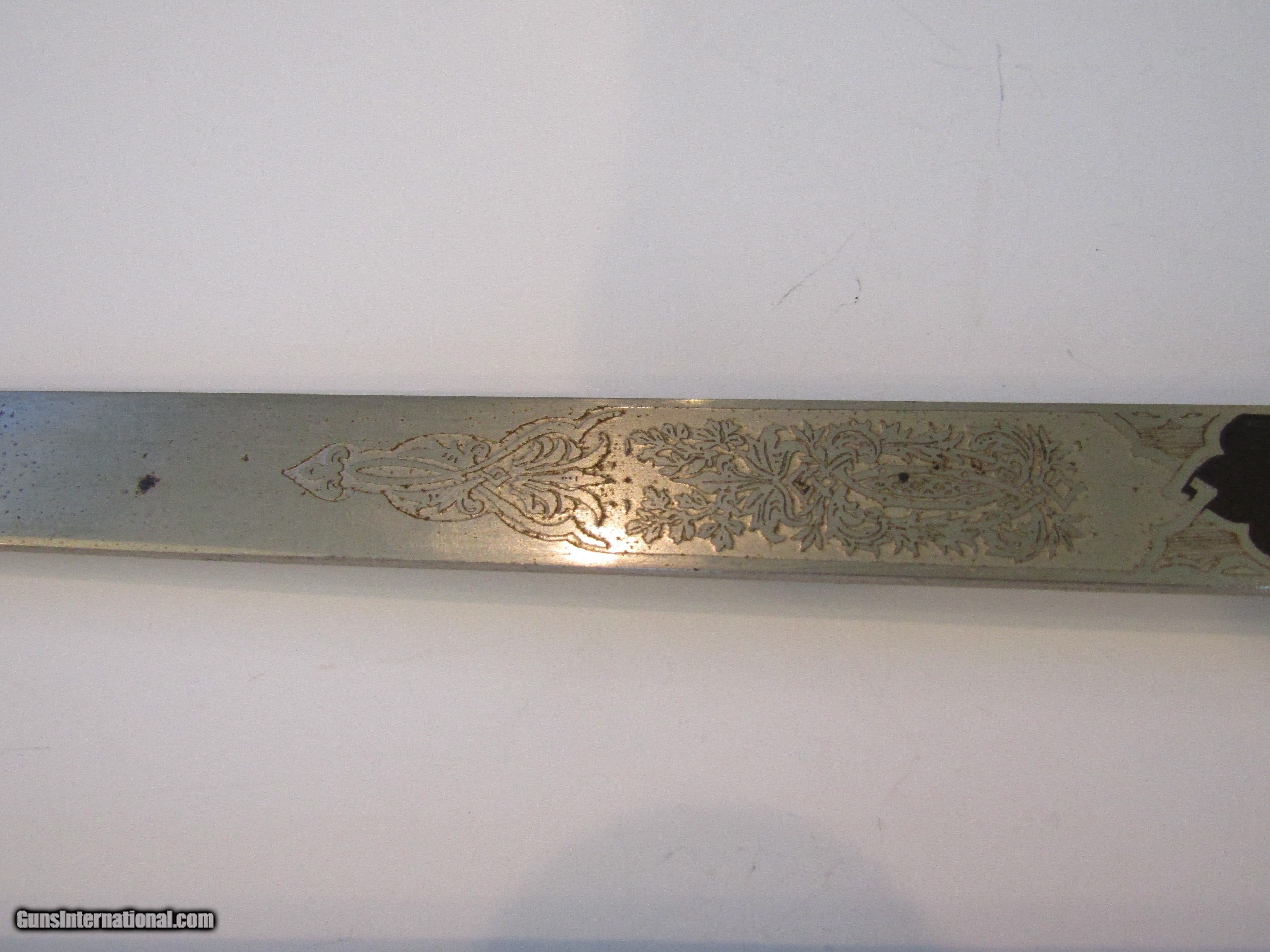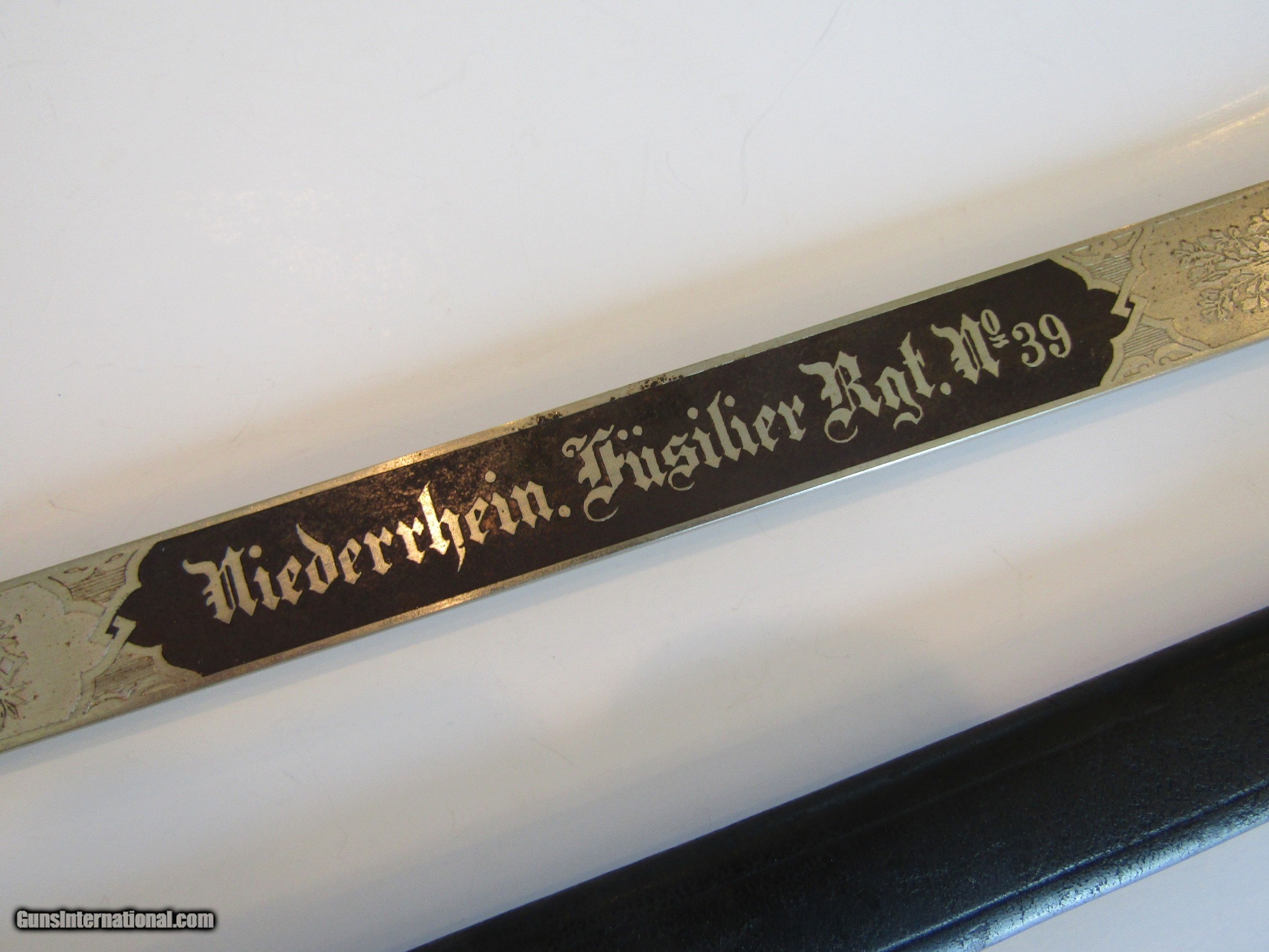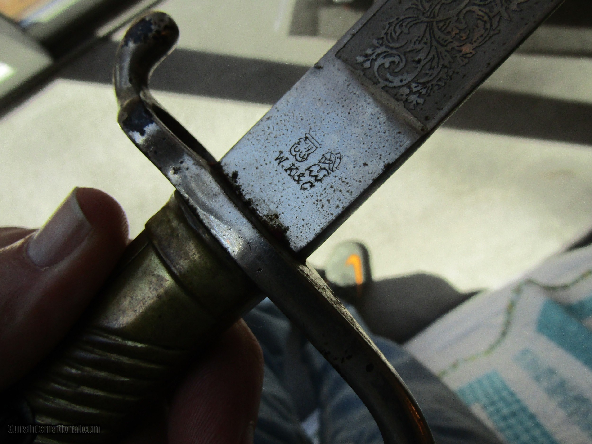 Description: This is one of the rarer models with all the bells and whistles added up grades. The scabbard is in above good conditionwithe the leather being in above good condition, thecollar and tip have been up graded with a gold wash. The blade has been doubled etched,with designs of swords , shield, flags,pikes,crossed cannons, all with a floral design running nearly the lenght of the blade on both sides. This model 1871 has a strip giving the NIEDERRHEIN.FUSILIERS, REG. NO. 39 high lighted with a black back ground to set it off. The blade is factory perfect , with the W.K.& C. KNIGHTS HEAD LOGO AND KINGS HEAD LOGO. You can see the tinest bit of red scabbard buffer,felt. , a tiny bit of platin on the hand guard both side , gone effects nothing. This regiment was formed in 1818, fought in the Austro- PRUSSIAN WAR, and in the franco -prussian war of 1870-71 where this may have was sevice, this regiment fought at the Battle of GRAVEL-ST.PRIVAT . The ARCHDUCK RAINER FEDINAND OF AUSTRIA , A GRAND SON OF EMPEROR LEOPARD 11 , AUSTRIAN GENERAL AND PRIME MINISTER COLONEL IN CHIF WAS IN CHARGE OF THIS REGIMENT. In WW1 this regiment saw service and was garrisoned in Dusseldorf, as part of the 7th army corp. During the first world war they served on the SIEGE OF LIEGE, ANF THE BATTLEOF VERDUN AND THE SPRING OFFENSIVE. The bayonet/sword which is over 2 feet long, is in amzing shape for being 139, years old, this one stands out, this was carried by a FUSILIER,WHO WAS A CUT ABOVE. 859-533-5445 SOLD |
