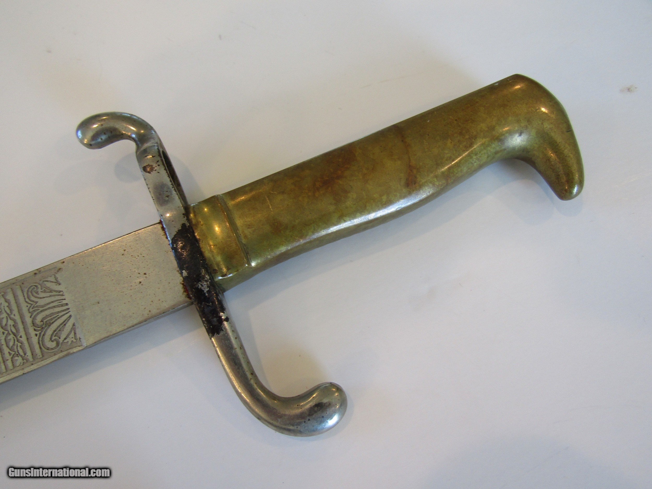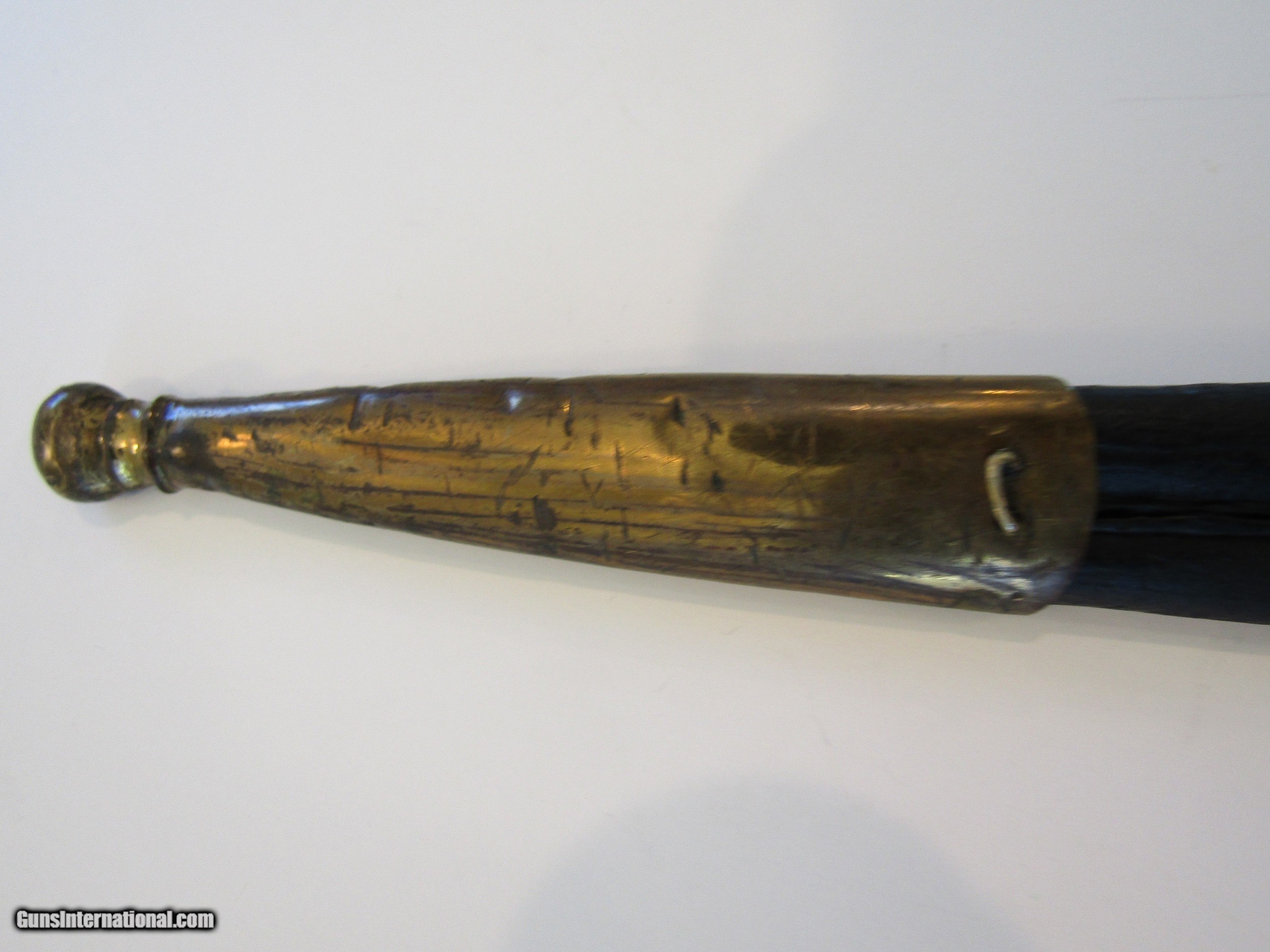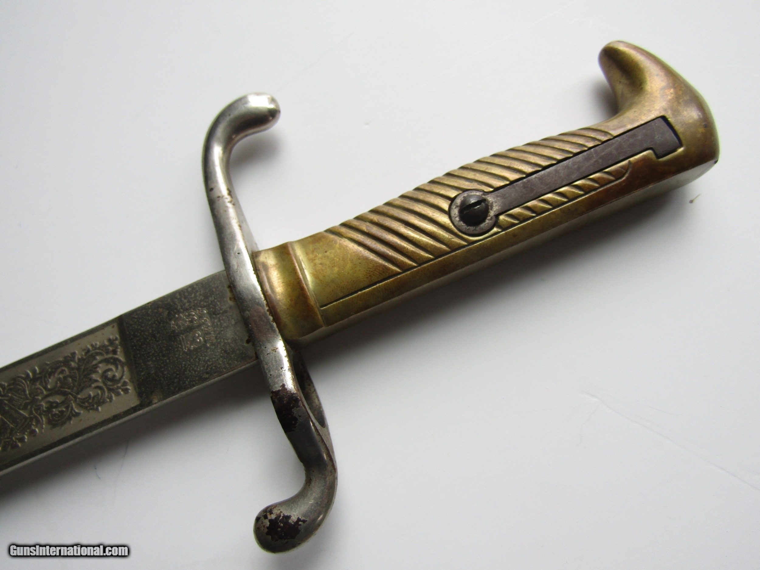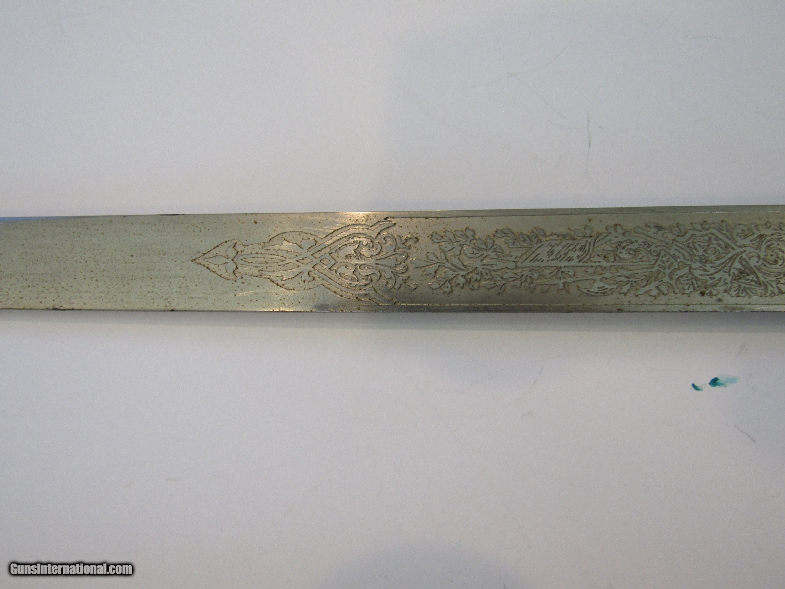 Description: This is one of the rarer models with all the bells and whistles added up grades. The scabbard is in above good conditionwithe the leather being in above good condition, thecollar and tip have been up graded with a gold wash. The blade has been doubled etched,with designs of swords , shield, flags,pikes,crossed cannons, all with a floral design running nearly the lenght of the blade on both sides. This model 1871 has a strip giving the NIEDERRHEIN.FUSILIERS, REG. NO. 39 high lighted with a black back ground to set it off. The blade is factory perfect , with the W.K.& C. KNIGHTS HEAD LOGO AND KINGS HEAD LOGO. You can see the tinest bit of red scabbard buffer,felt. , a tiny bit of platin on the hand guard both side , gone effects nothing. This regiment was formed in 1818, fought in the Austro- PRUSSIAN WAR, and in the franco -prussian war of 1870-71 where this may have was sevice, this regiment fought at the Battle of GRAVEL-ST.PRIVAT . The ARCHDUCK RAINER FEDINAND OF AUSTRIA , A GRAND SON OF EMPEROR LEOPARD 11 , AUSTRIAN GENERAL AND PRIME MINISTER COLONEL IN CHIF WAS IN CHARGE OF THIS REGIMENT. In WW1 this regiment saw service and was garrisoned in Dusseldorf, as part of the 7th army corp. During the first world war they served on the SIEGE OF LIEGE, ANF THE BATTLEOF VERDUN AND THE SPRING OFFENSIVE. The bayonet/sword which is over 2 feet long, is in amzing shape for being 139, years old, this one stands out, this was carried by a FUSILIER,WHO WAS A CUT ABOVE. 859-533-5445 SOLD |