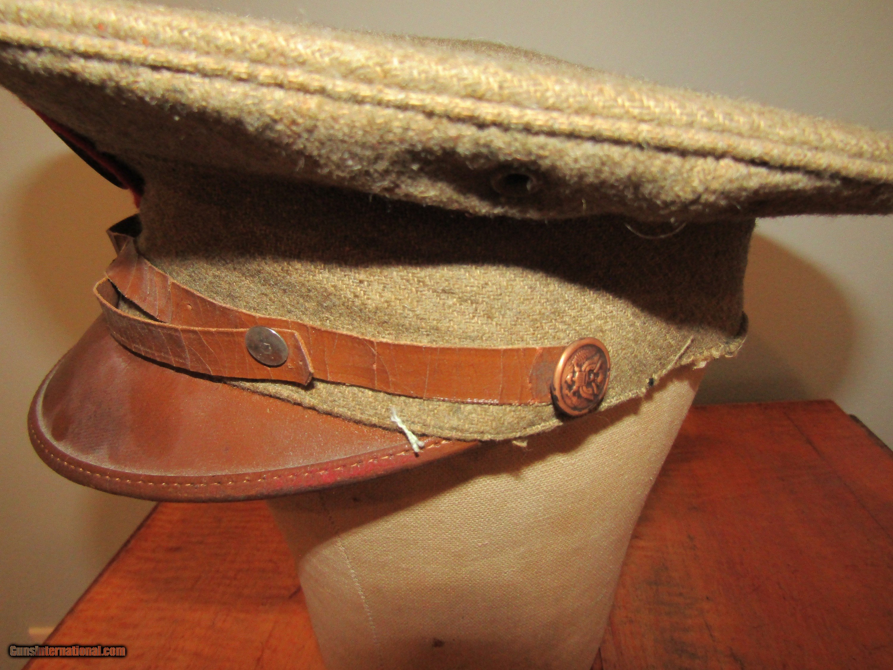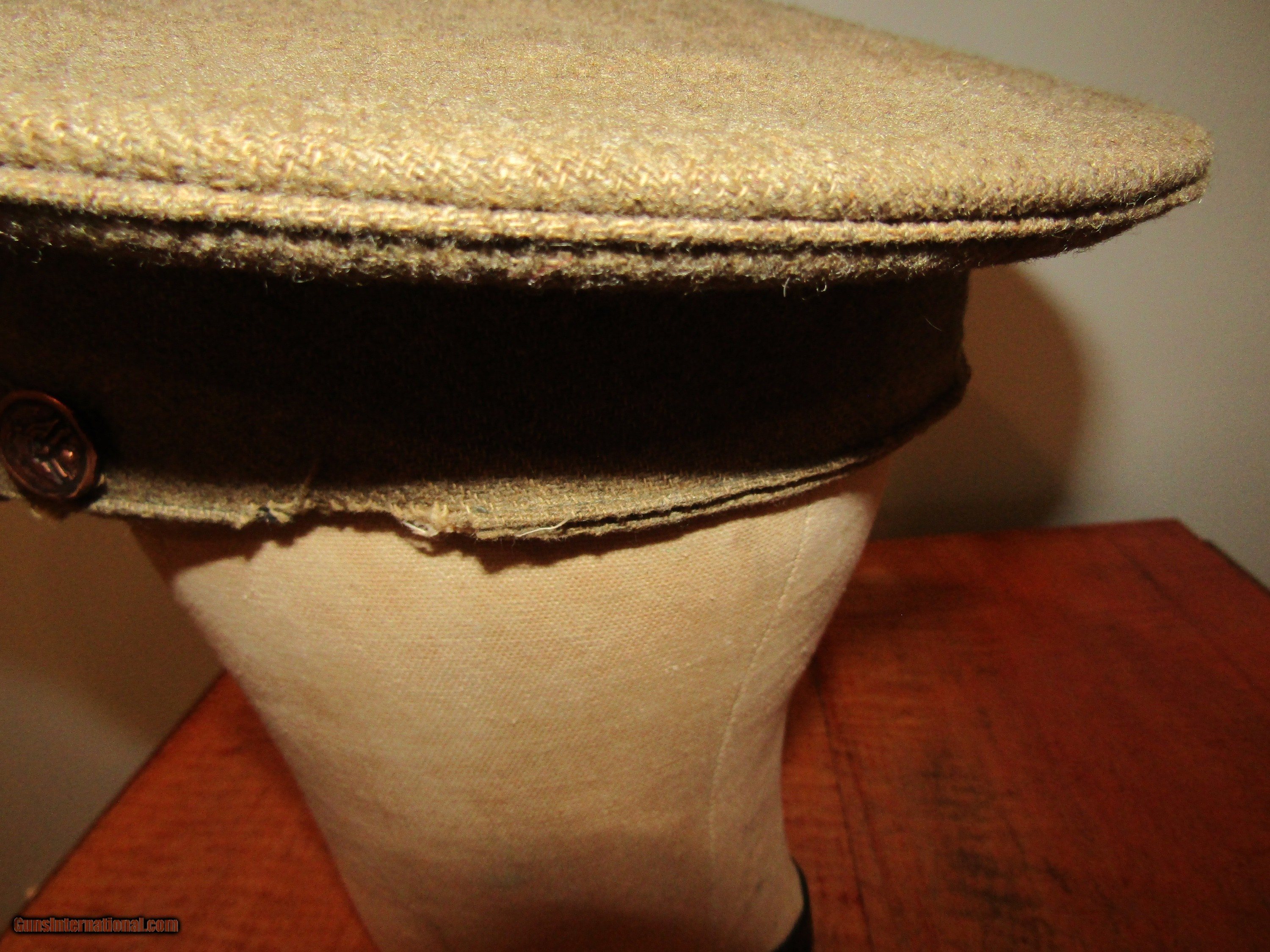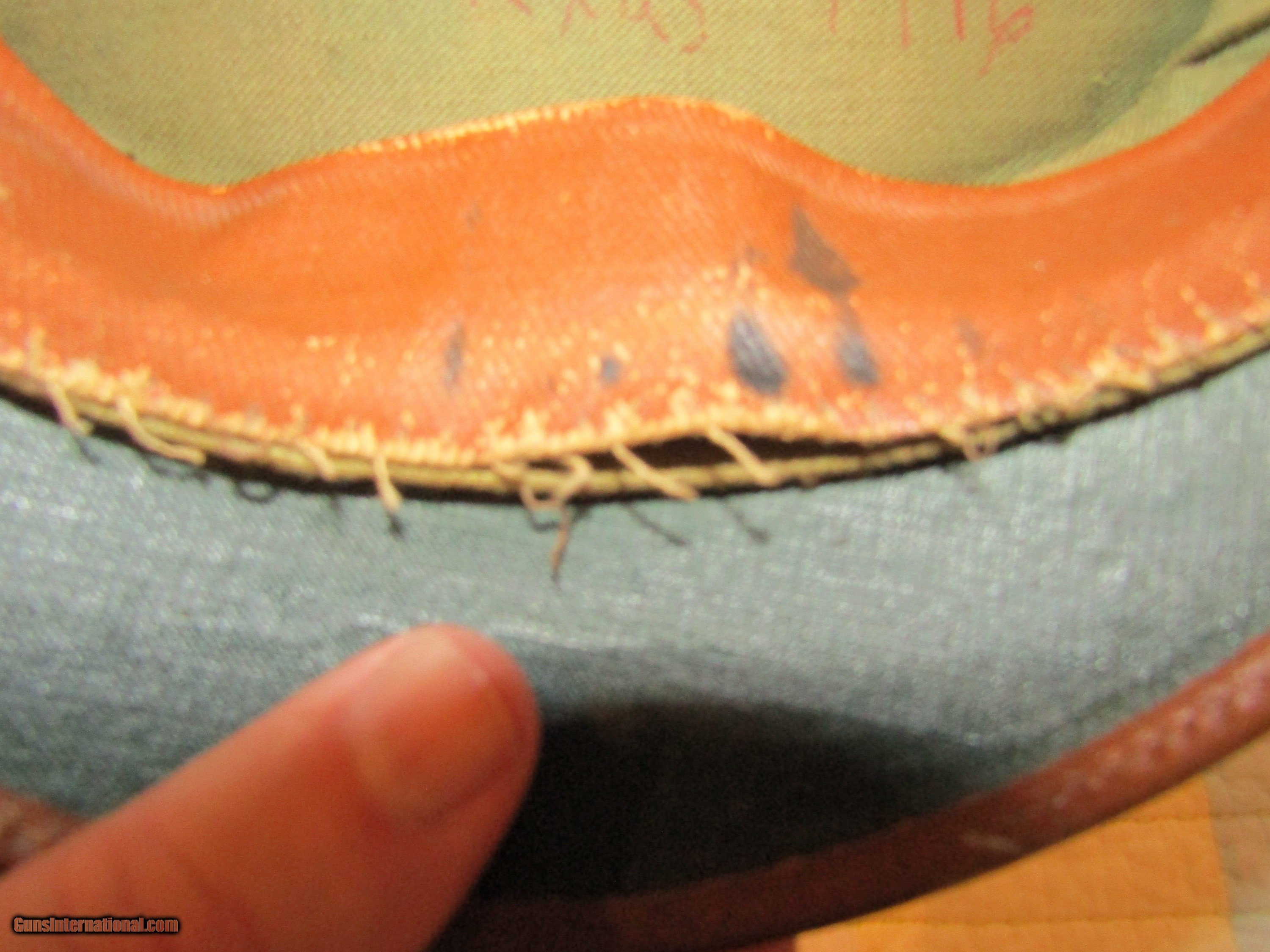 Description: This is an original period Ameriican & MEXICAN period boder war hat ,ID to E.ARNOLD ,1ST CALVARY N.Y. ,TEXAS 1916 WRITTEN ON THE INSIDE,THE HAT IS IN GOOD CONDITION ,WITH SOME LOSE SEWING ON THE SWEAT BAND. THE EDGE IN ONE SPOT SHOWS SOME WEAR , and the fron band on the hat needsto be reajusted, but a good strong hat. SOLD |