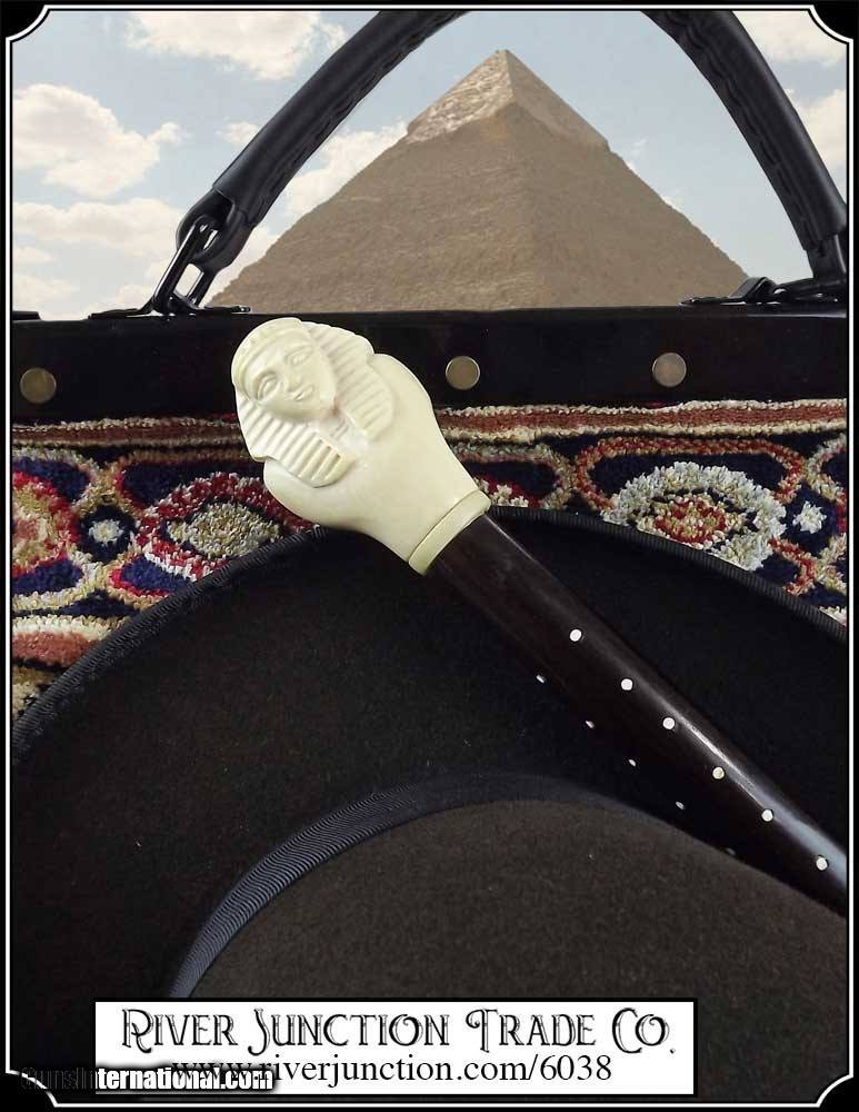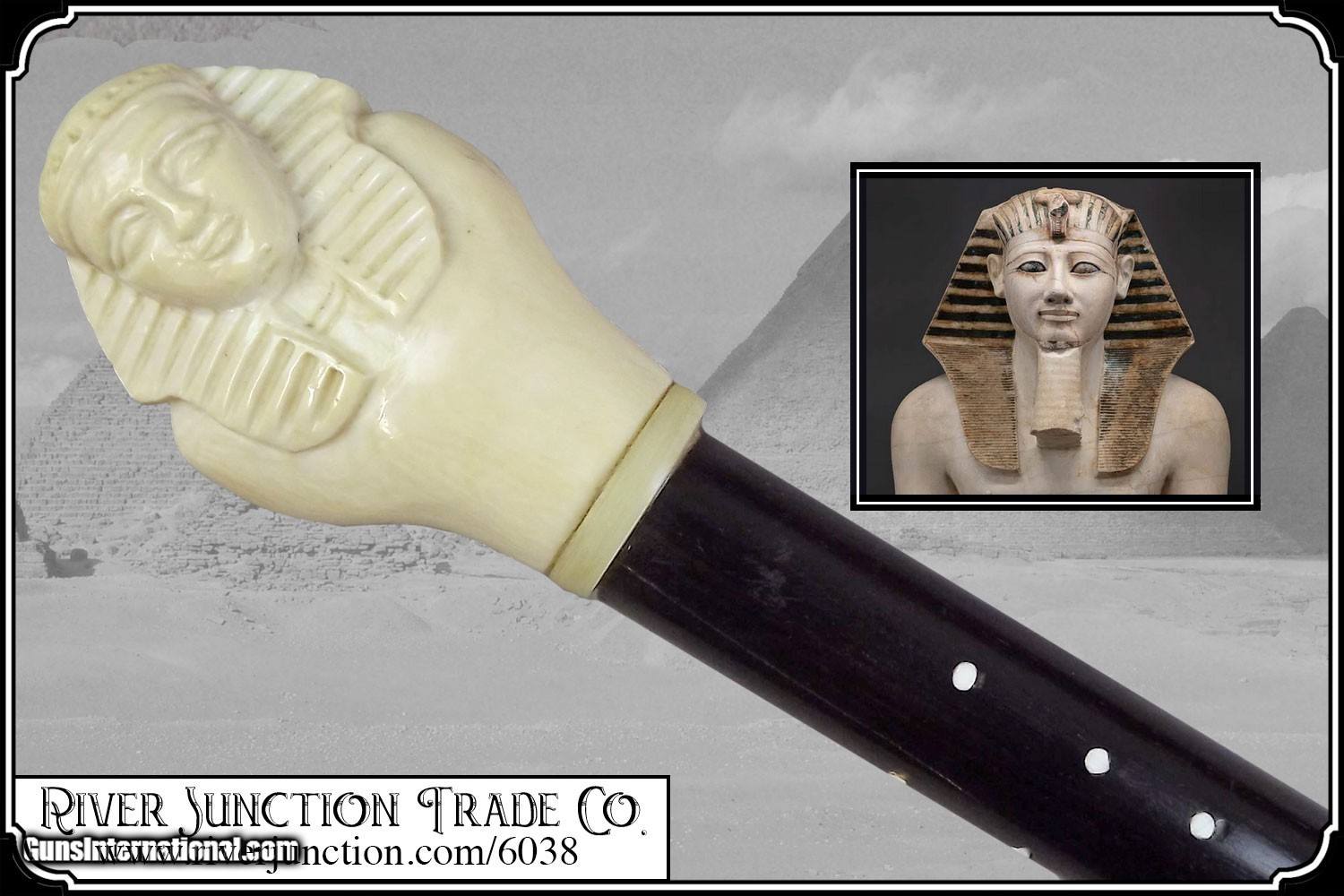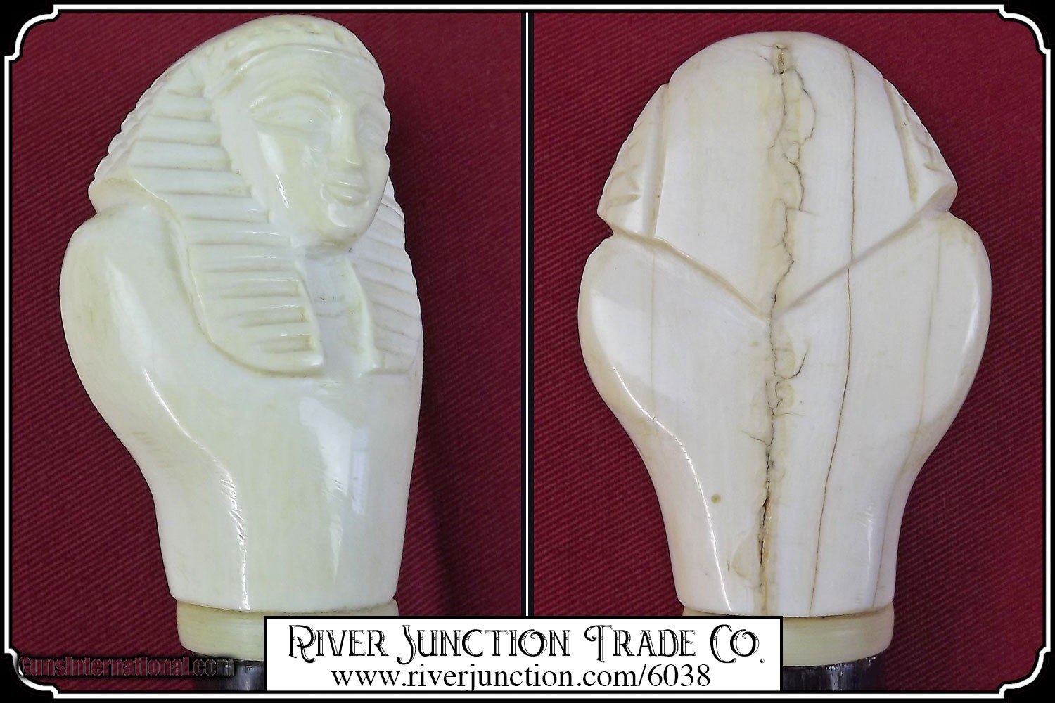 Description: Egyptian pre band 1920 Ivory cane head. What a great piece from the Egyptian revival era. This sager/walking stick measure 36 1/2 inches over all. The Ivory head is a very close likeness of Thutmose III an Egyptian Pharaoh. Thutmose III, was one of the greatest military kings that ever ruled Egypt. He engaged relentlessly in military campaigns. His campaigns yielded slaves, booty and even tribute over the long run. This stick is more of a show piece than a walking aid. The Pharaohs head is of coarse the crowning feature, but over all the entire stick speaks of a great deal of vanity and was likely a commishioned . The shaft is of finely finished Ebony with an Ivory finial. The 24 Ivory dots on the upper stick represent the years of Thutmose's reign. The photo of the bust of Thutmose III is shown here to compare to the stick head. Payment: Item, can be ordered on line with a credit card or paypal on our sight. Just Google (riverjunction) and type in the River Junction Trade Co. item number (6038) in the search box. Before you checkout you will see shipping cost and total. OR If you prefer: Pay by cash, postal money order, cashiers check, personal & business checks. We wait for checks to clear. We always answer questions and entertain offers. Have questions? Call me 563-880-4588. Jim SOLD |
