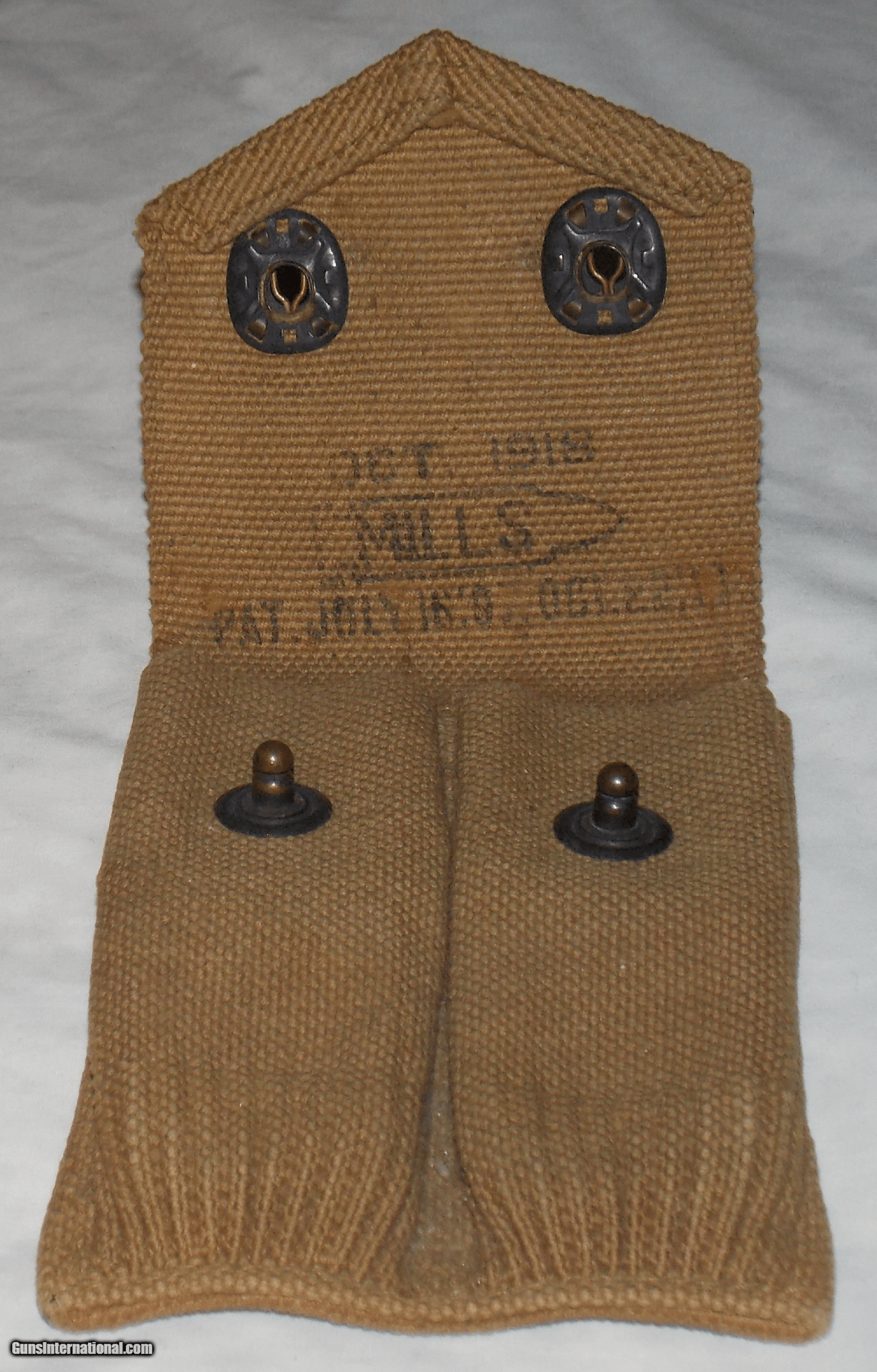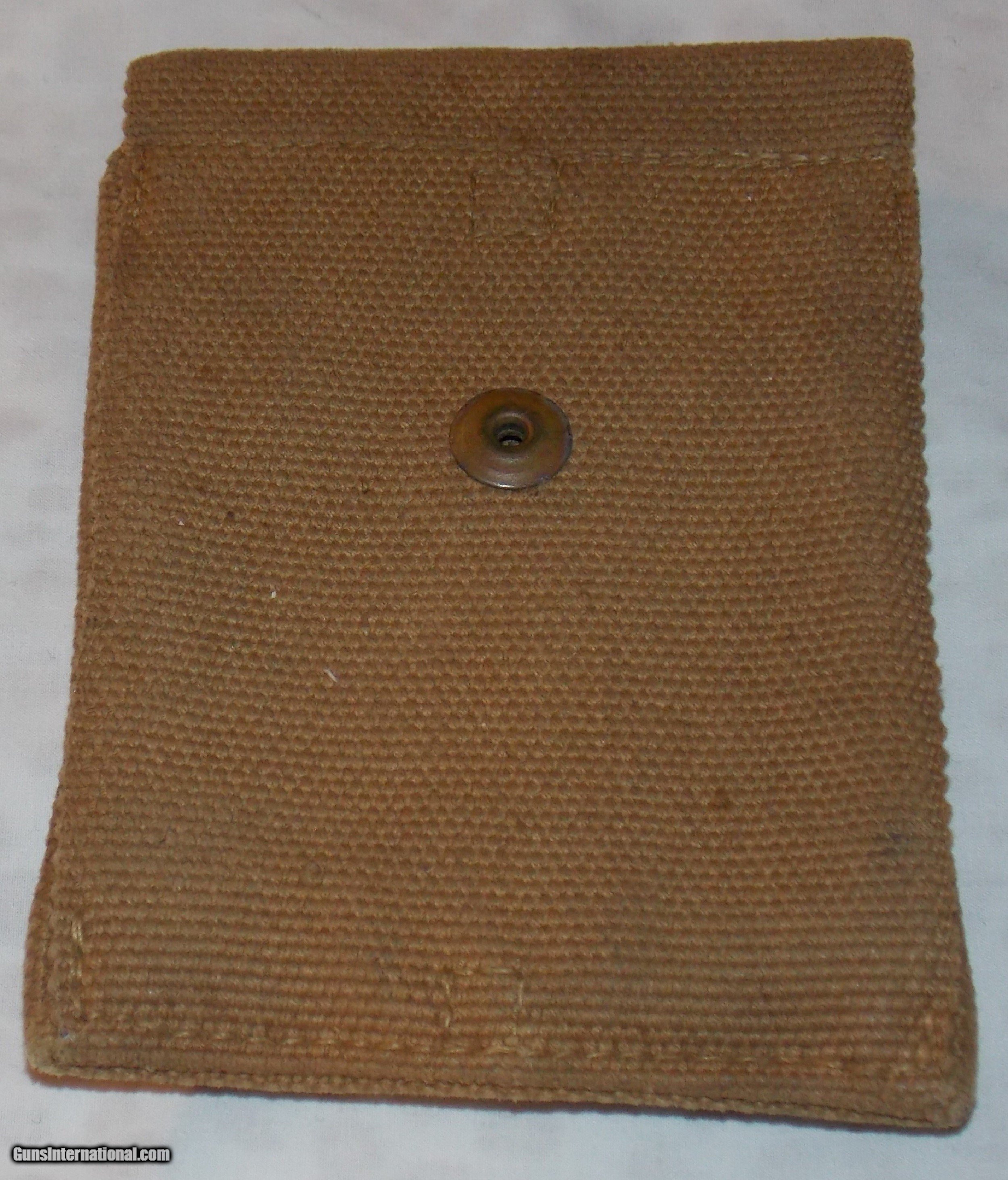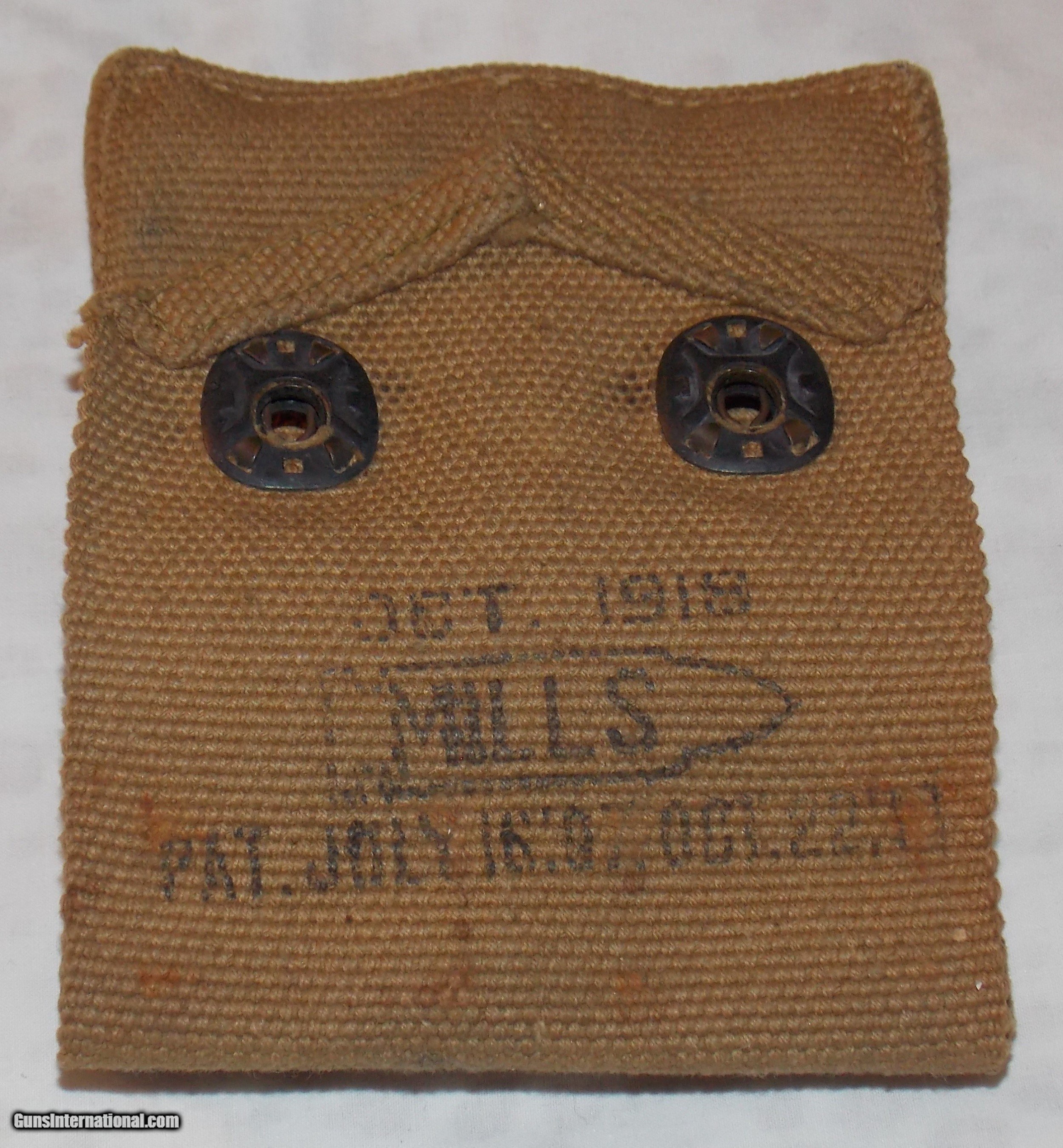 Description: Made of khaki colored canvas and marked inside the flap “OCT 1918", then the name “MILLS” inside the outline of a .45 caliber cartridge and followed by two patent dates. (unreadable) It also has a female metal button facing inward in the center of the backside so that it can be snapped on to a matching belt. The back side has a wide loop however, so that is can be slipped on to a any wide belt. It is in excellent condition and was obviously new when sold as surplus by the government. This is an genuine WW1 collectors item and a very usable magazine pouch for most large caliber pistols using single stack magazines. Buy this well made pouch for only $55 plus $5 for shipping. *************************** SALE PENDING ************************** SOLD |