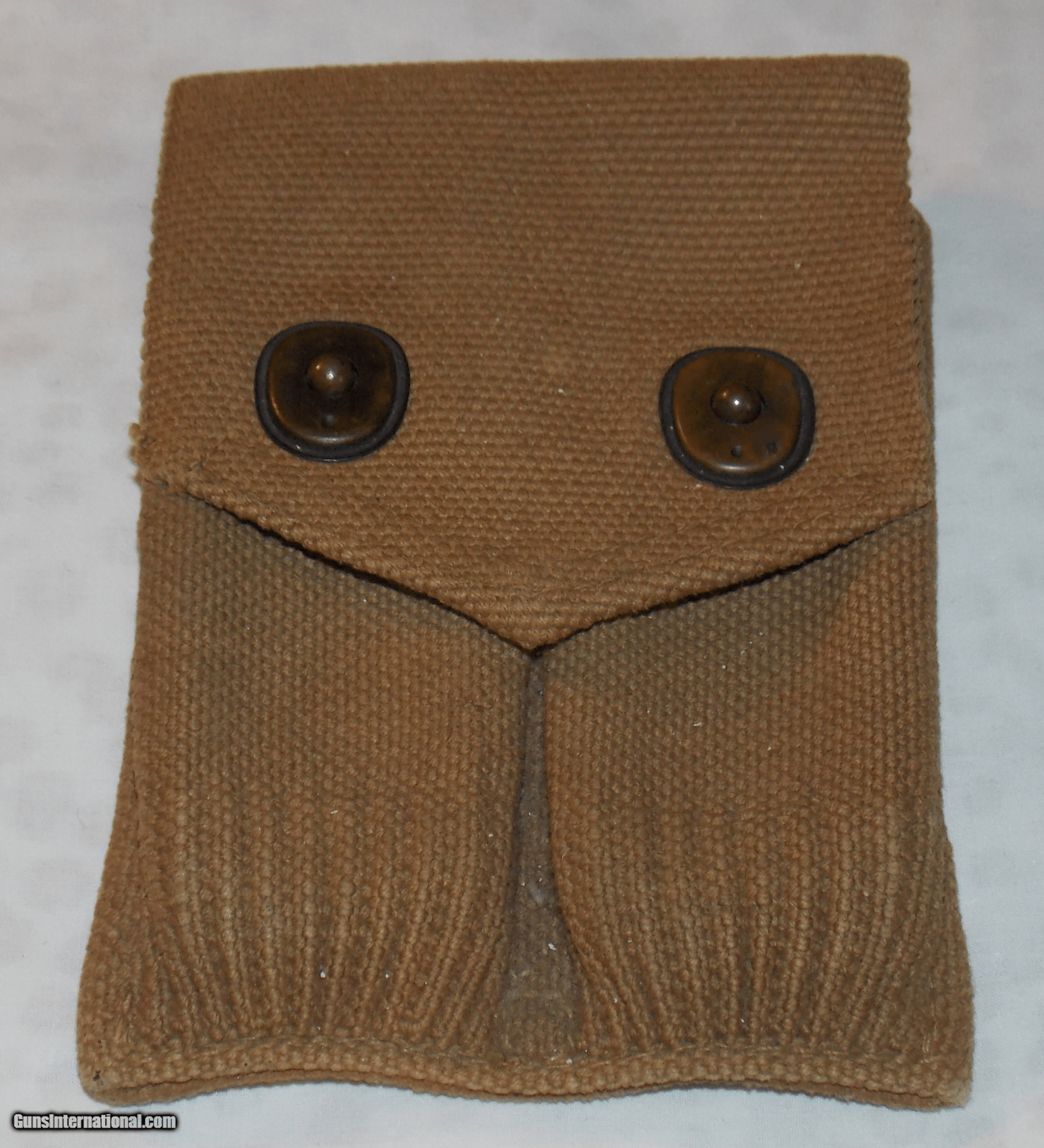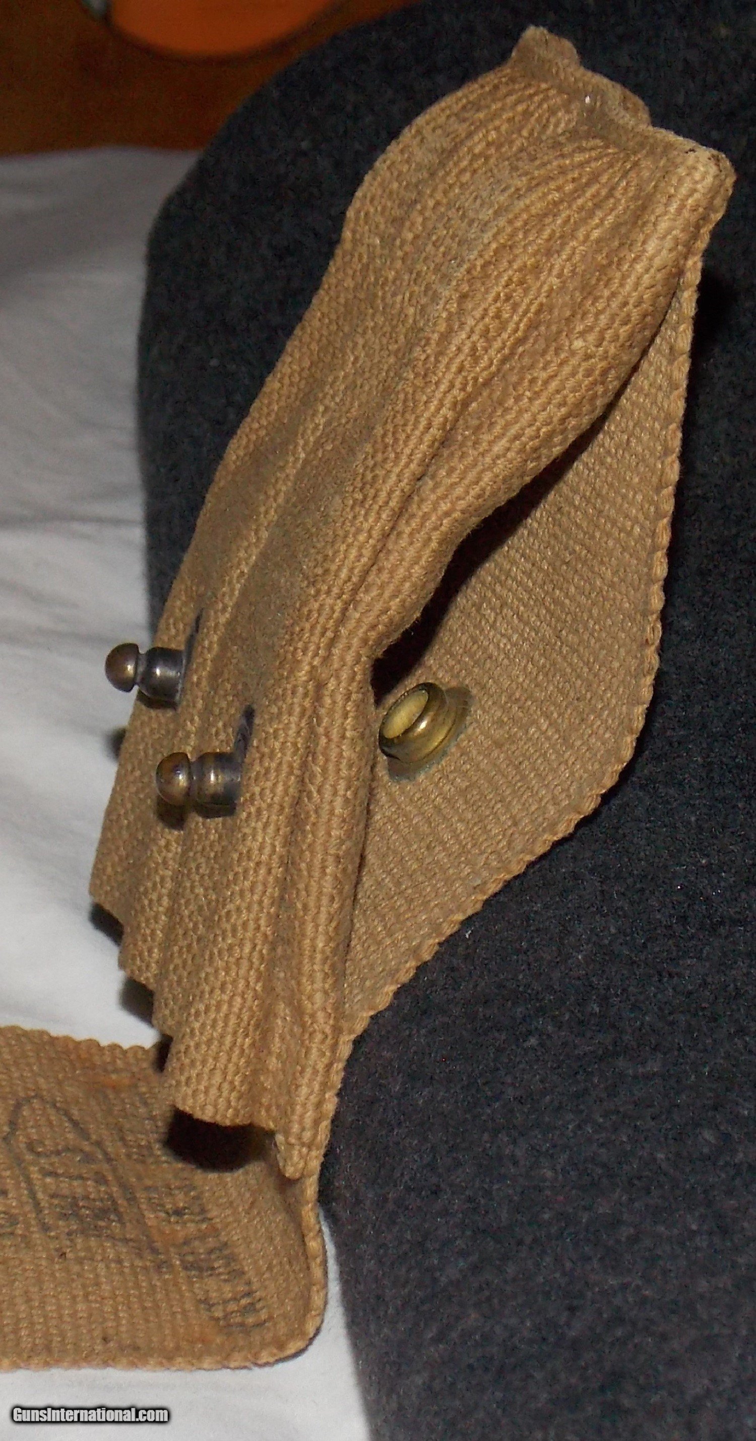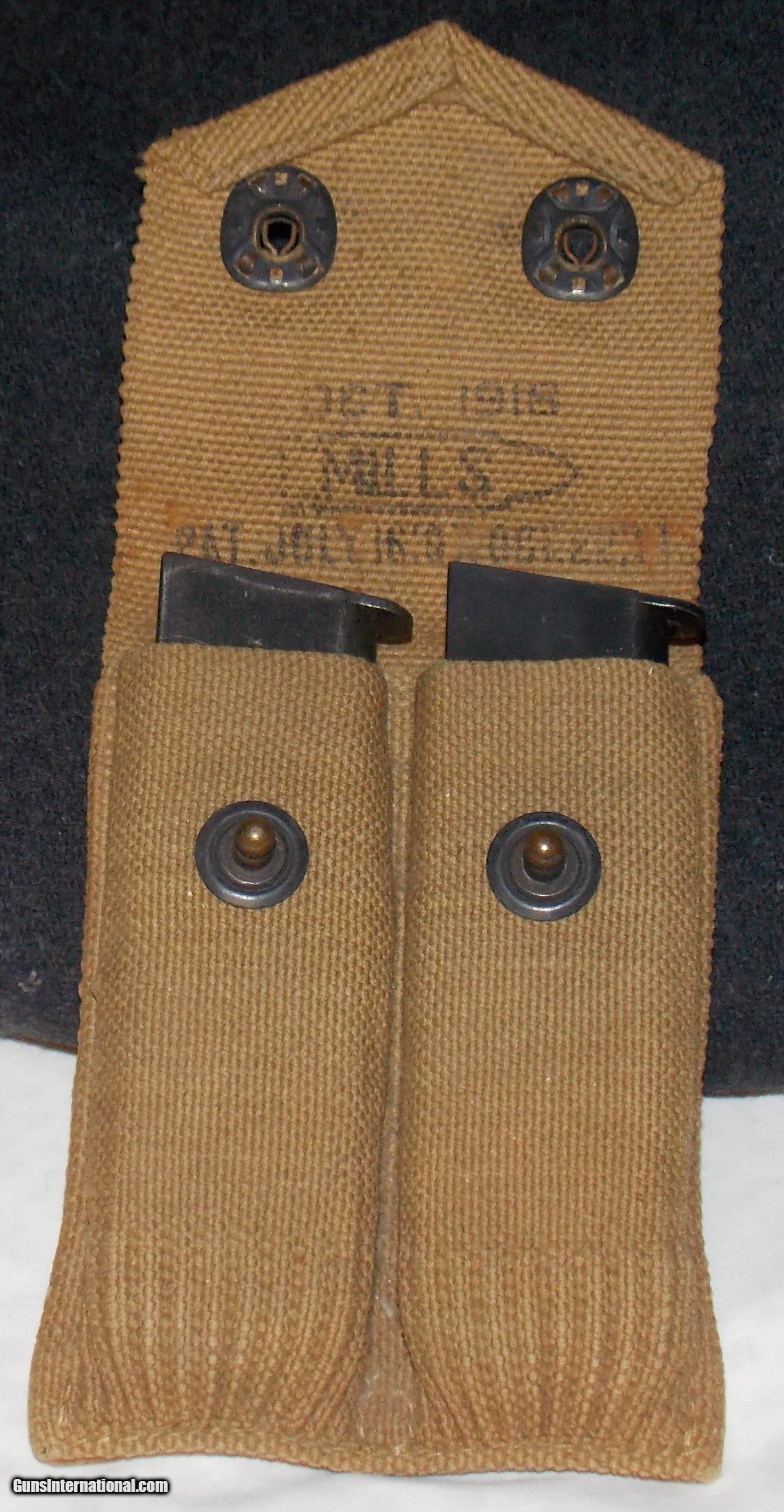 Description: Made of khaki colored canvas and marked inside the flap “OCT 1918", then the name “MILLS” inside the outline of a .45 caliber cartridge and followed by two patent dates. (unreadable) It also has a female metal button facing inward in the center of the backside so that it can be snapped on to a matching belt. The back side has a wide loop however, so that is can be slipped on to a any wide belt. It is in excellent condition and was obviously new when sold as surplus by the government. This is an genuine WW1 collectors item and a very usable magazine pouch for most large caliber pistols using single stack magazines. Buy this well made pouch for only $55 plus $5 for shipping. *************************** SALE PENDING ************************** SOLD |
