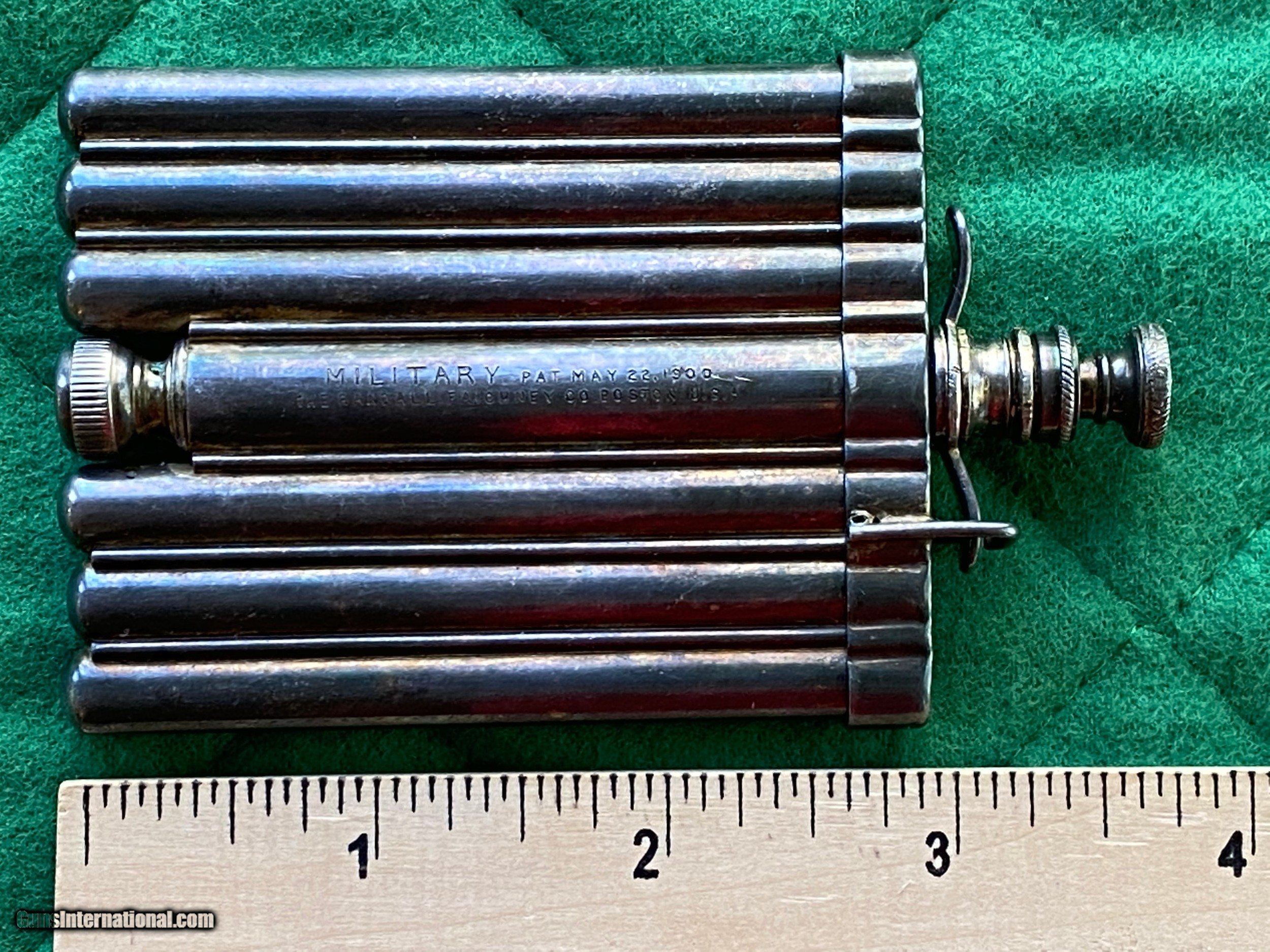 Description: Nickel silver metal kit is made up of seven fused hollow tube shapes. Markings on top of the central tube state "MILITARY PAT MAY 22, 1900" and "THE RANDALL FAICHNEY CO BOSTON U.S.A." The center tube contains a hypodermic syringe, one cylinder containing an open metal tube and 2 needles contained within, one with an empty glass tube marked " Morphine Sulfate". Other tubes in this kit are empty. Wonderful silver patina overall, Syringe is functional. Reference: ://patents.google/patent/US1275270A/en $10 S/H Check or M.O. Please. SOLD |
