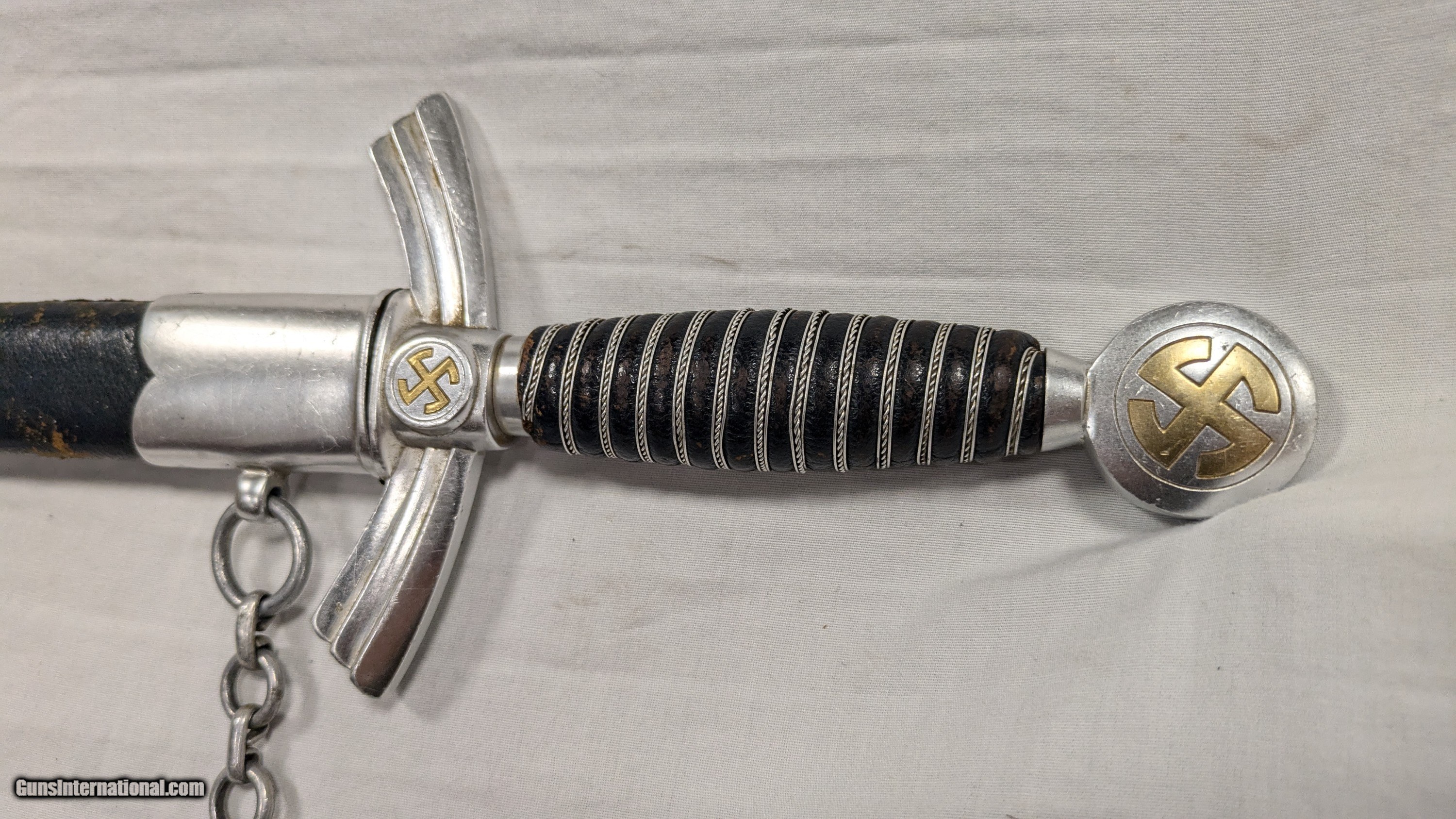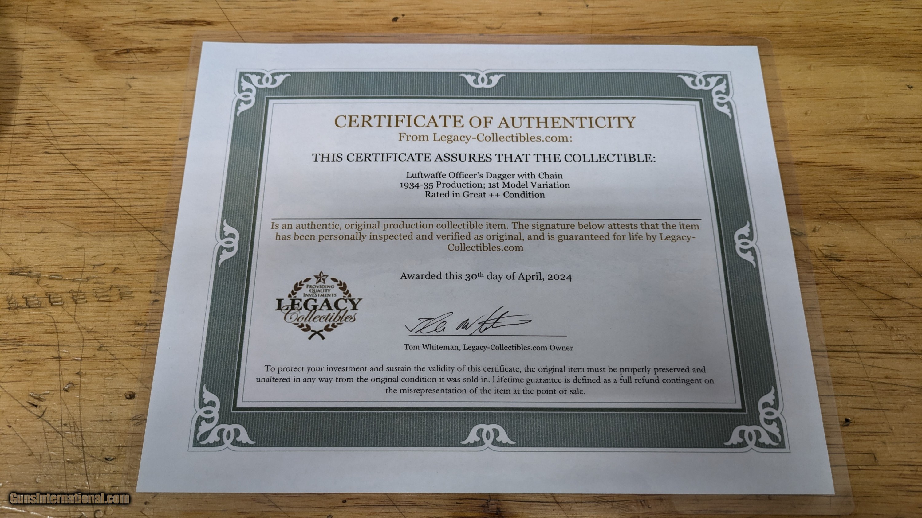 1ST MODEL LUFTWAFFE OFFICER'S DAGGER WITH CHAIN W/ LETTER OF AUTH.
