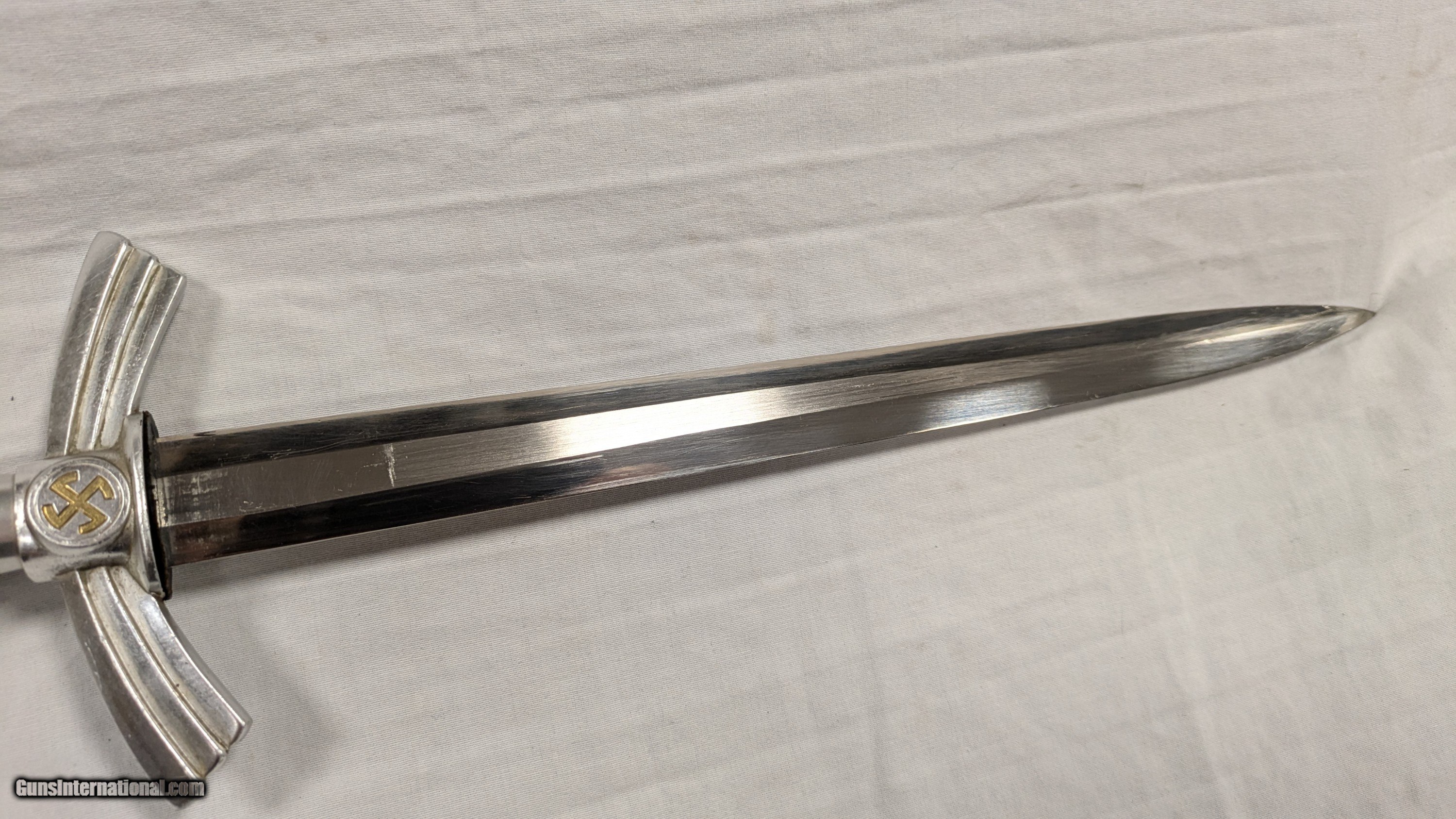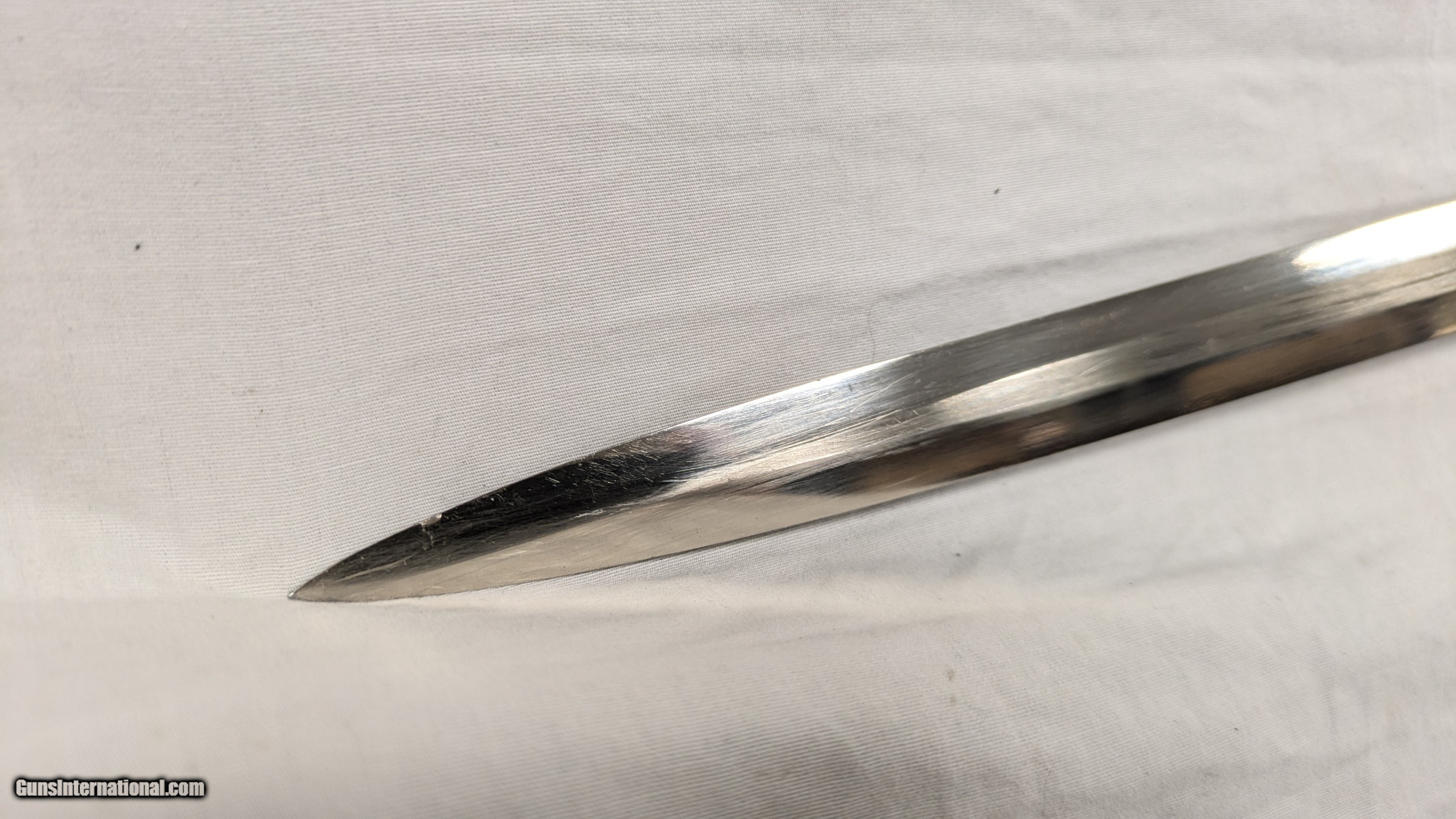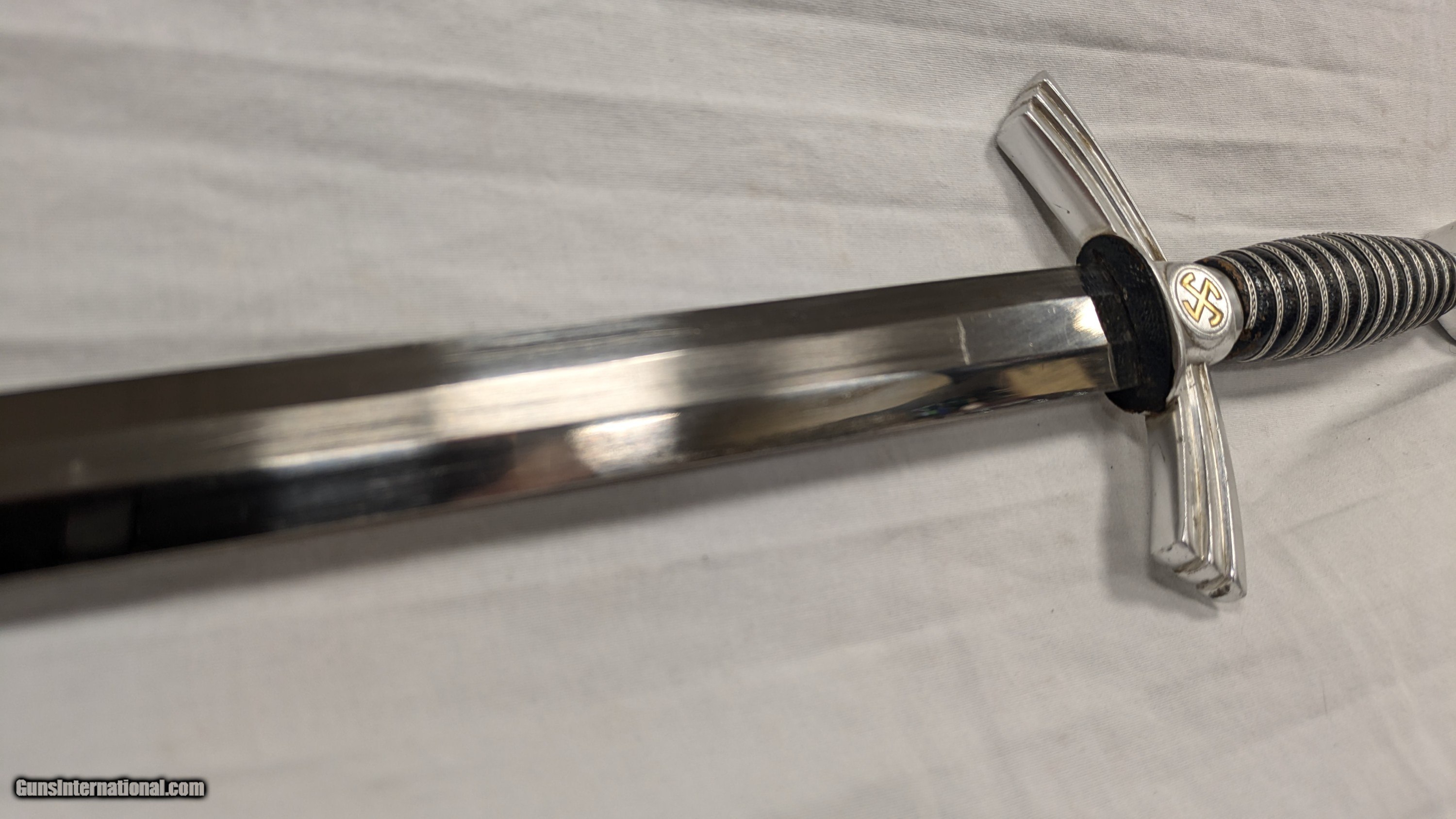 Description: This is a consignment item from a local collector. This is an early (1934/1935) example of a 1st Model Luftwaffe Officer Dagger. It is in overall excellent with an unmarked blade (a few light scratches and scabbard rub and small ding near the tip). The original leather stopper is still present at the base of the blade. The pommel and hand guard retain a nice gold original finish on the logos. There is some wear present on the handle, but no major imperfections and the chord is wrapped tightly. The scabbard is in great overall condition as is the chain. OLC maker stamped on the clip. Includes Letter of Authenticity from Legacy Collectibles. SOLD |