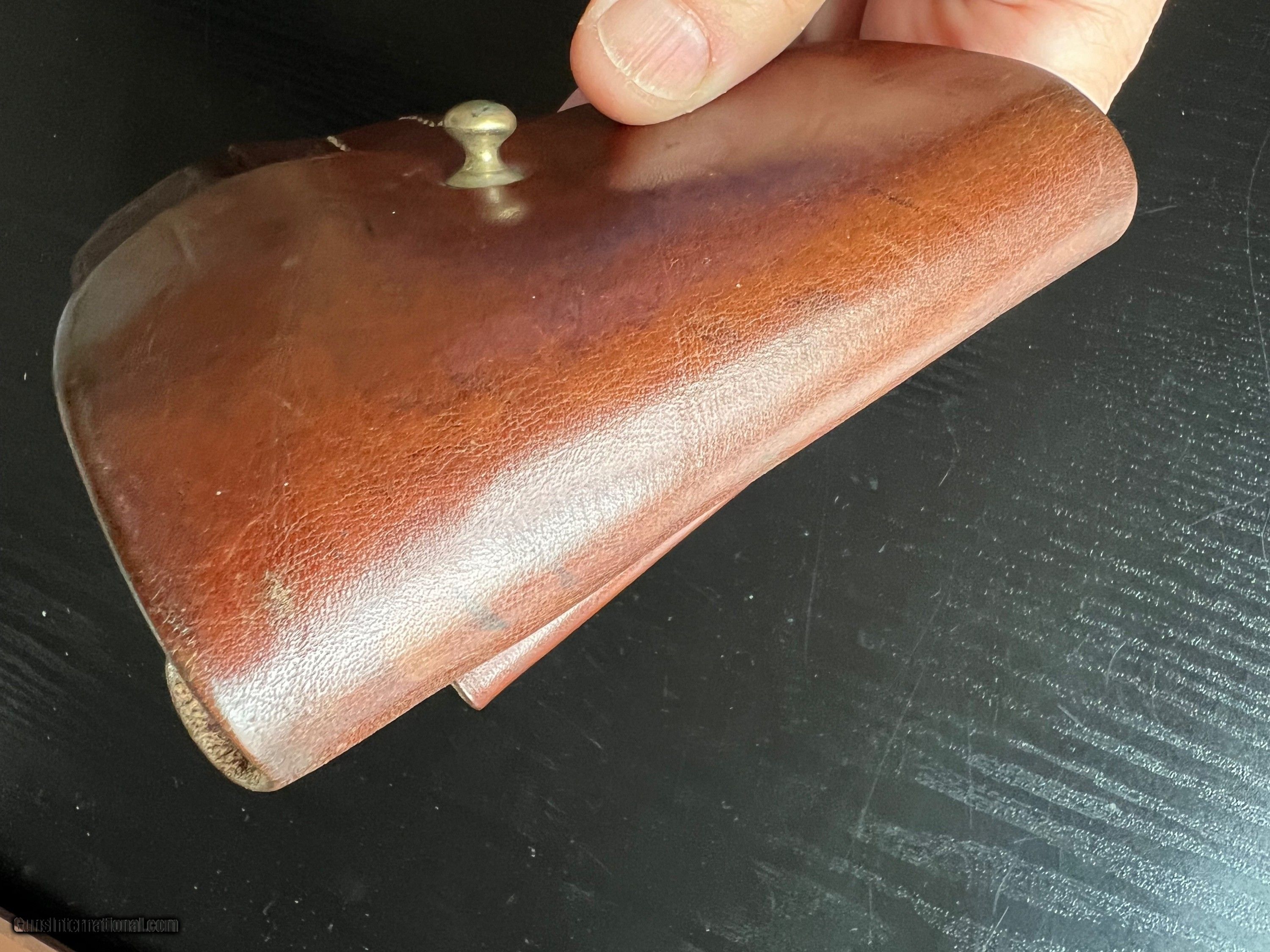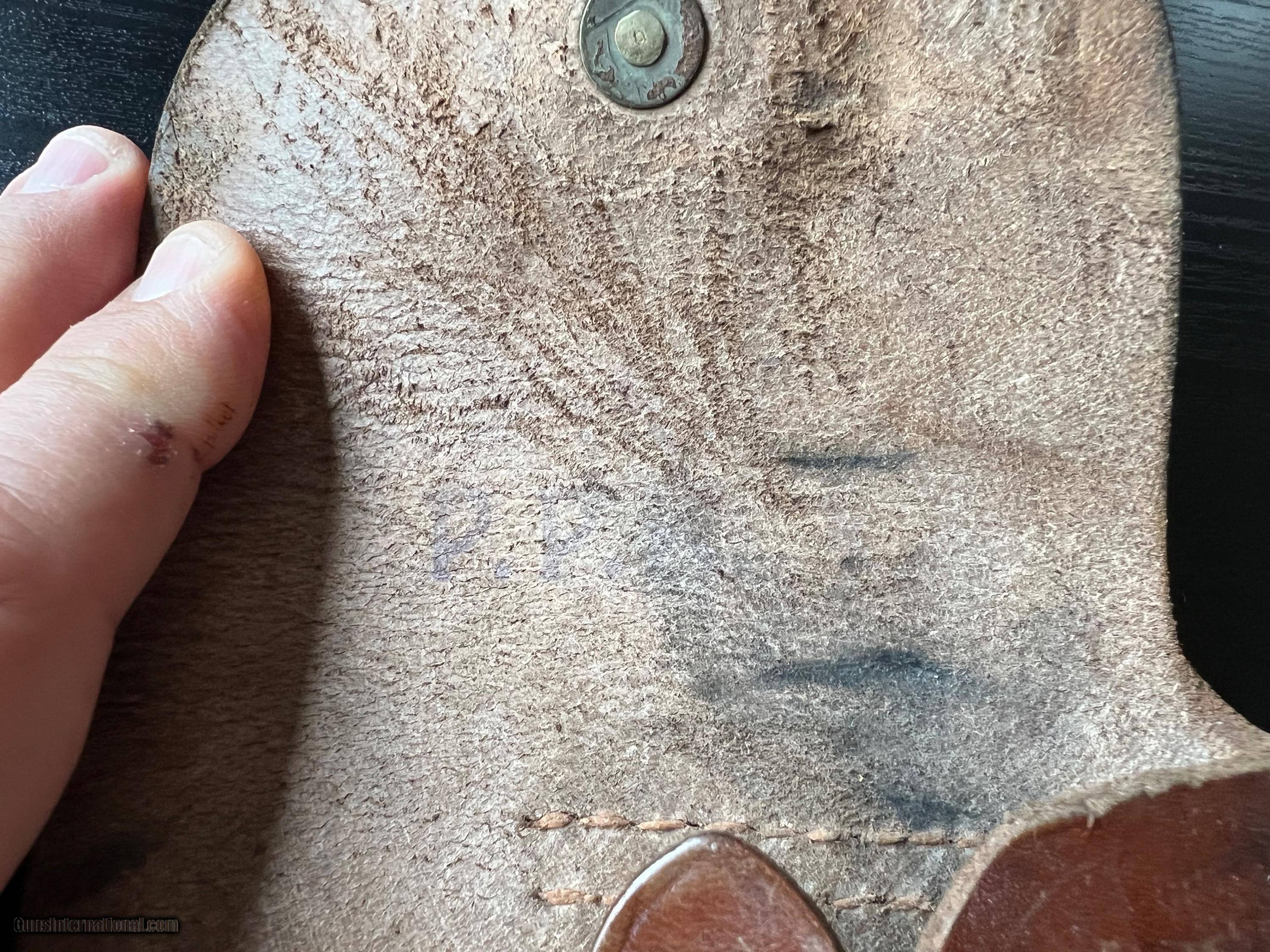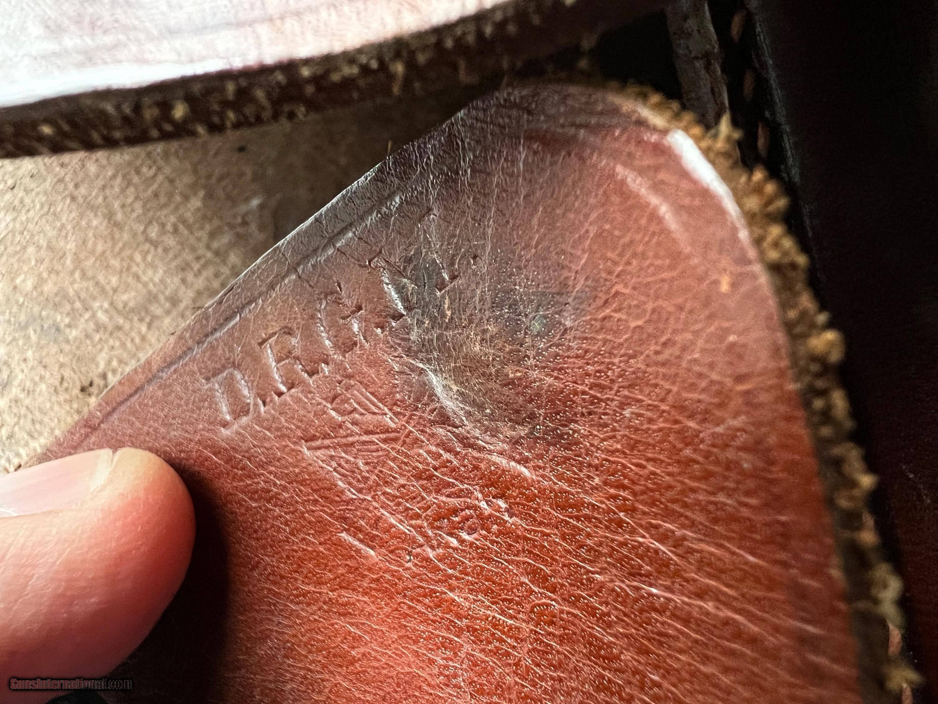 Description: SOLD! Excellent original condition pre war Walther PPK AKAH holster with brass stud and orange stitching. No defects. AKAH DRGM marked under the closure strap. PPK ink stamp inside the flap. This one would be near impossible to upgrade. 3-day inspection. $20 shipping in Conus. SOLD |