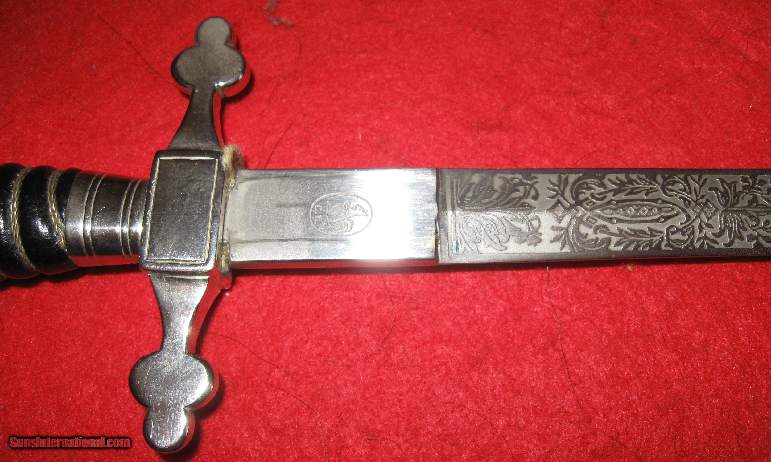 Description: sale pending johnny c-THIS CEREMONIAL DAGGER IS ON CONSIGNMENT FOR A LOCAL GUN DEALER WHO TOOK IT IN TRADE. IT IS STAMPED WITH A CARL ECKHORN TRADEMARK (RESEARCHED ON WARDAGGERS). IT IS 19" OVERALL WITH A 14" BLADE. IT IS A FIREFIGHTER (FEUERSCHUTZ) CEREMONIAL DAGGER. IT HAS A LITTLE PLATING WEAR ON THE CARRY RINGS AND ON THE STAPLES ON THE BACK OF THE SHEATH. THE LEATHER HILT IS WOUND WITH TWISTED BRASS WIRE. THE CUSHONING FELT UNDER THE HANDGUARD IS MISSING ON ONE SIDE OF THE BLADE. IT IS IN EXCELLENT CONDITION. VERY NICE ENGRAVING ON THE BLADE FREE SHIPPING SOLD |