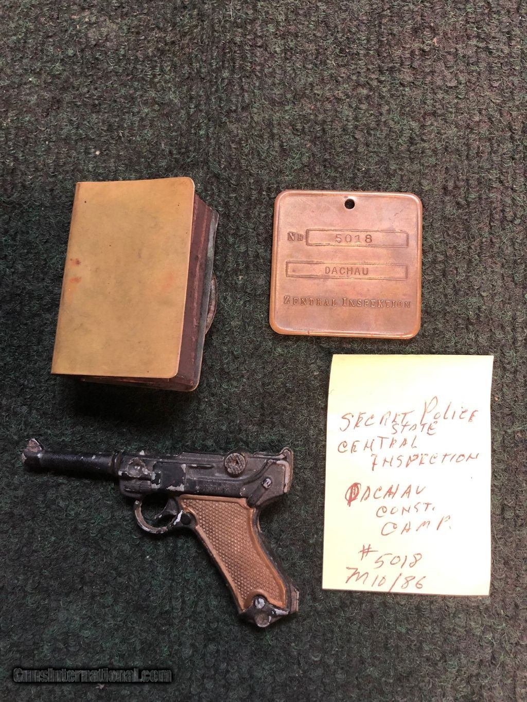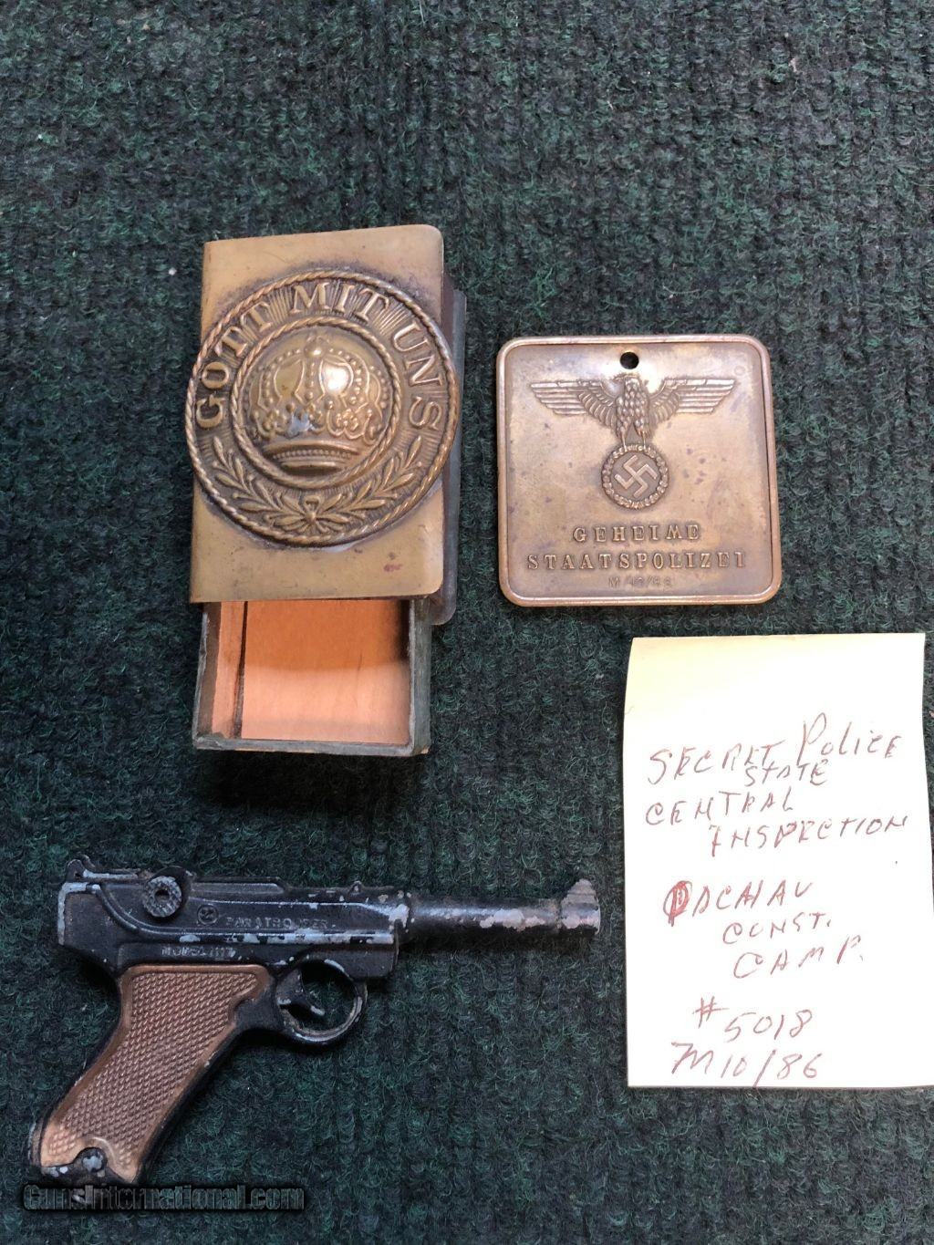 Description: REDUCED I HAVE HAD THESE FOR YEARS ONE IS A PERFECT MATCH BOX INCLUDING INSERT EXCELLENT CONDITION,MINIATURE LUGER REPLICA,AND SECRET POLICE BADGE DACHAU CONCENTRATION CAMP..I AM NOT SURE OF THE VALUE OF THESE ? SO HERE IT GOES OFFERS ARE ENCOIRAGED.SOMEONE KNOWS THE VALUE OF THESE?I HAVE NEVER SEEN ANY BADGES OR MATCH BOXES? PART TRADES WELCOME T.Y. SOLD |