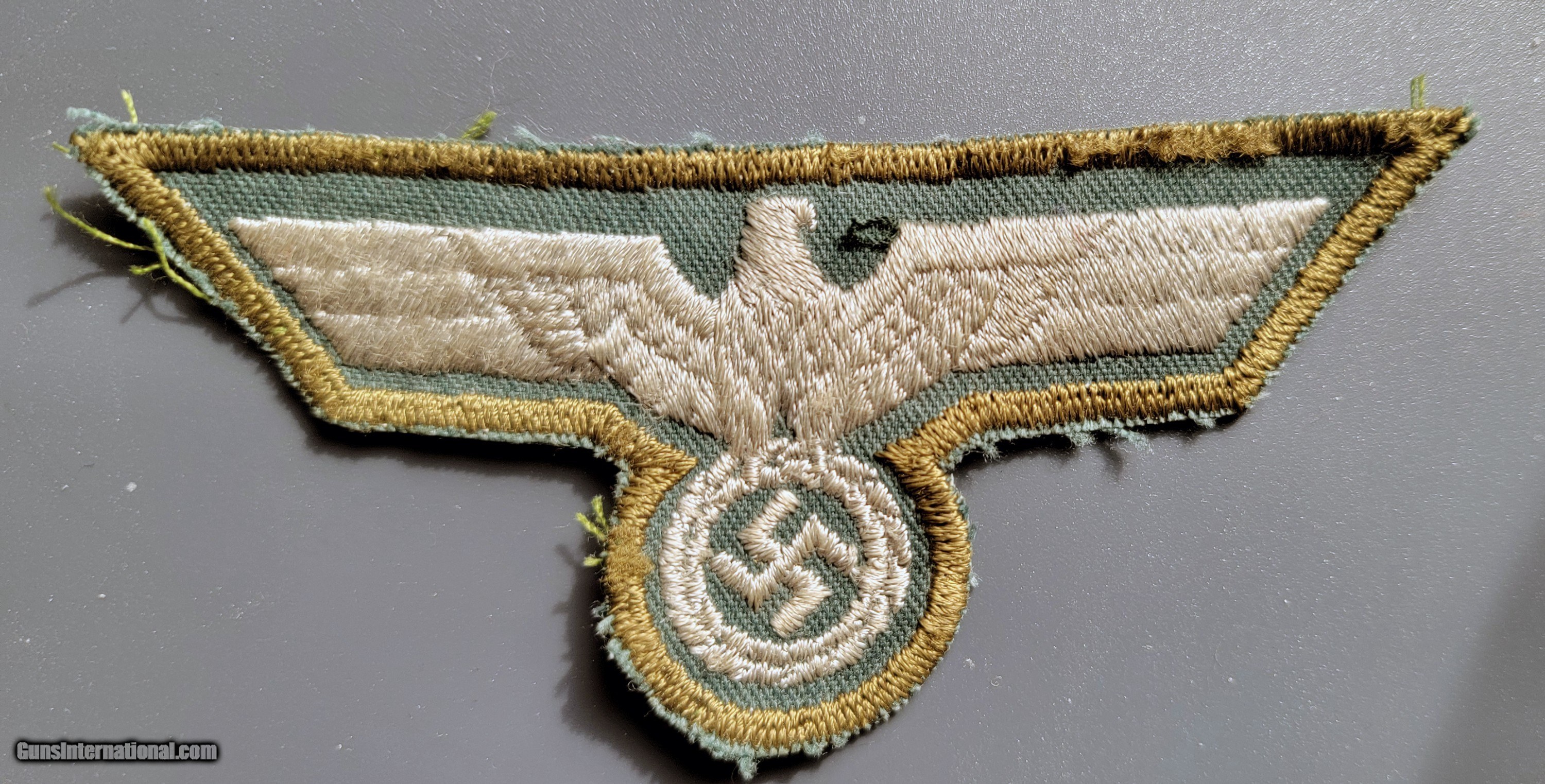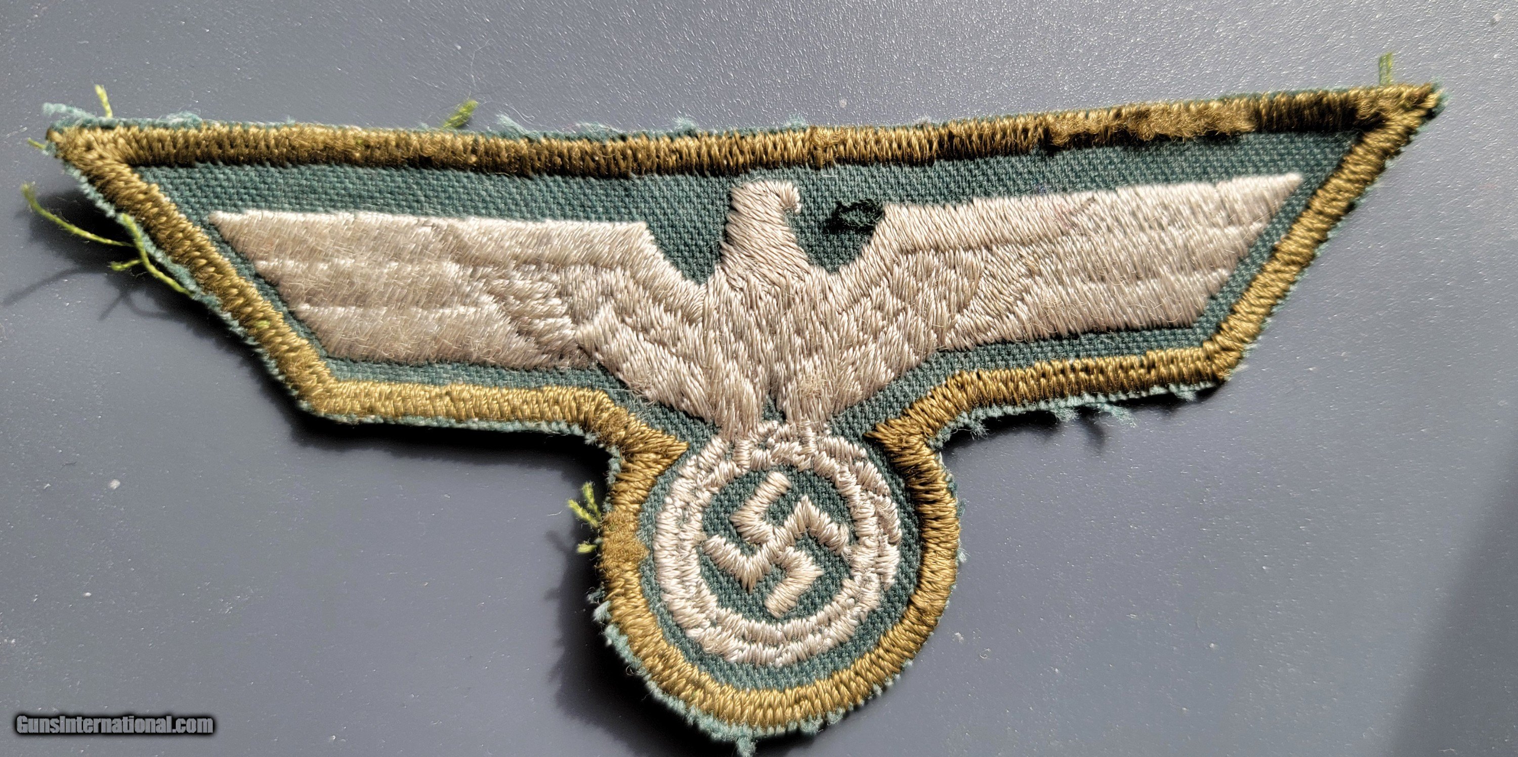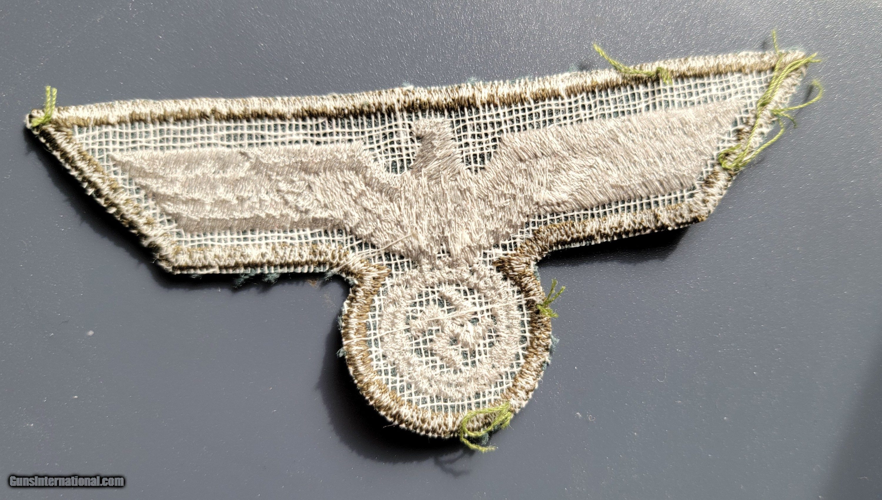 Description: German WW II original EM breast eagle made in France during occupation REAL. German WW II original EM breast eagle made in France during occupation REAL! This unique design was made during the German occupation of France and has the unique French wide weave backing they used. I had this confirmed as original on Wehrmacht Awards as I never saw this type of structure before; they confirmed it as French made during WW II. SOLD |