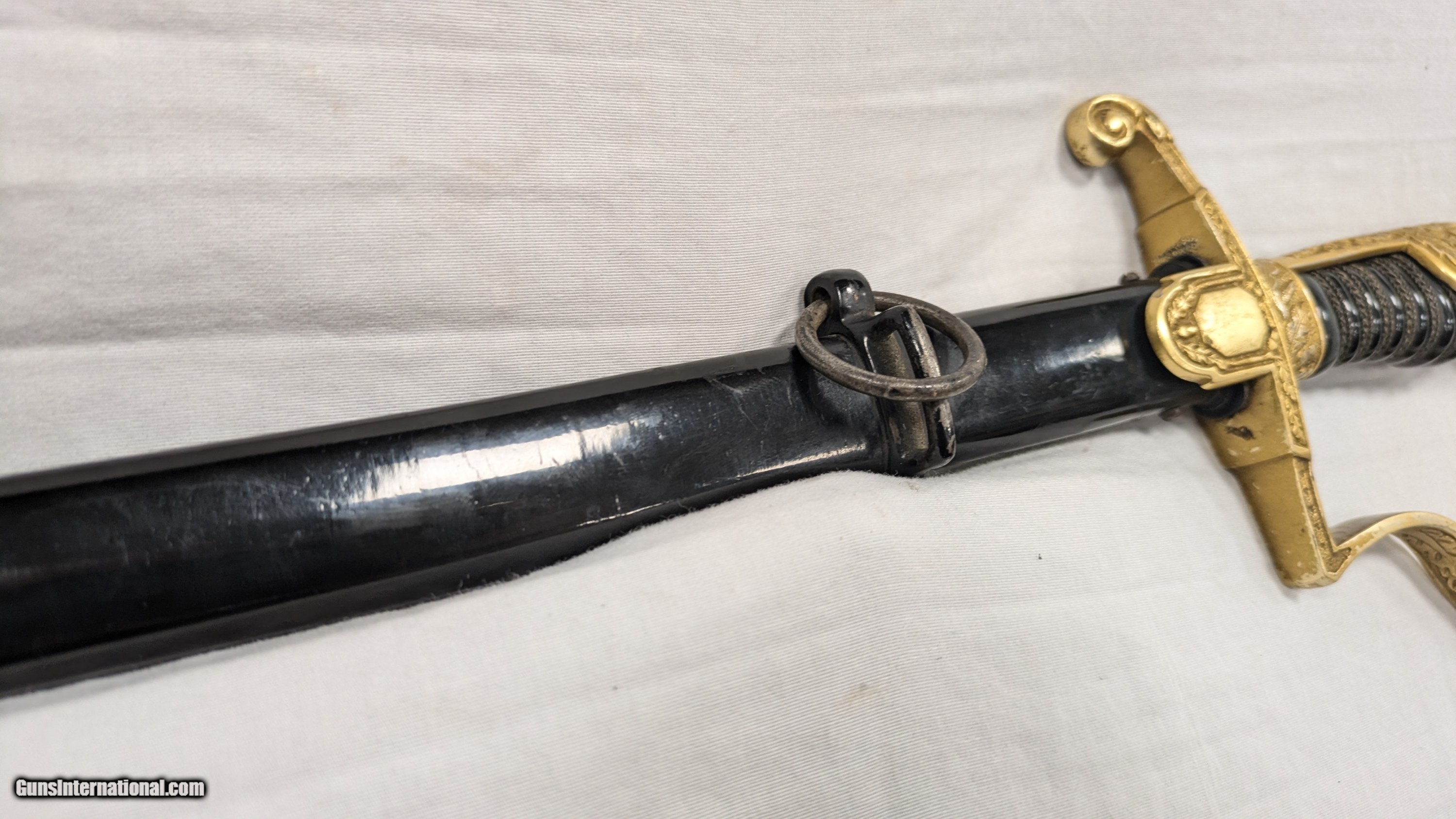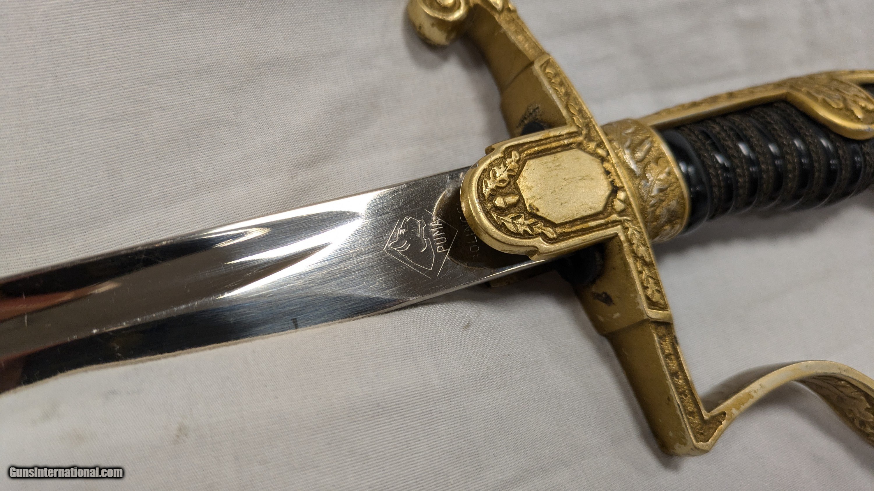 Description: This is a consignment item from a local collector. "If you are looking for an attractive sword, look no further! This army sword is in fantastic condition overall and with nice and tight grip wire. bright gold finish to the aluminum fittings. Maker marked on the reverse of the blade with the Puma logo. Underside of the cross gaurd is Ges. Gesch. marked and the front of the blade has their signature No. 5 stamped in. Impressive design on the cross guard and hilt. Don't miss out on this beautiful peice. Brought back by Kenneth A. Warnes of the 12th Armored Division who served in the 714th Tank Ballation who received both the Purple Heart and Bronze Star." Source: Original Listing from Wehrmacht Militaria. SOLD |