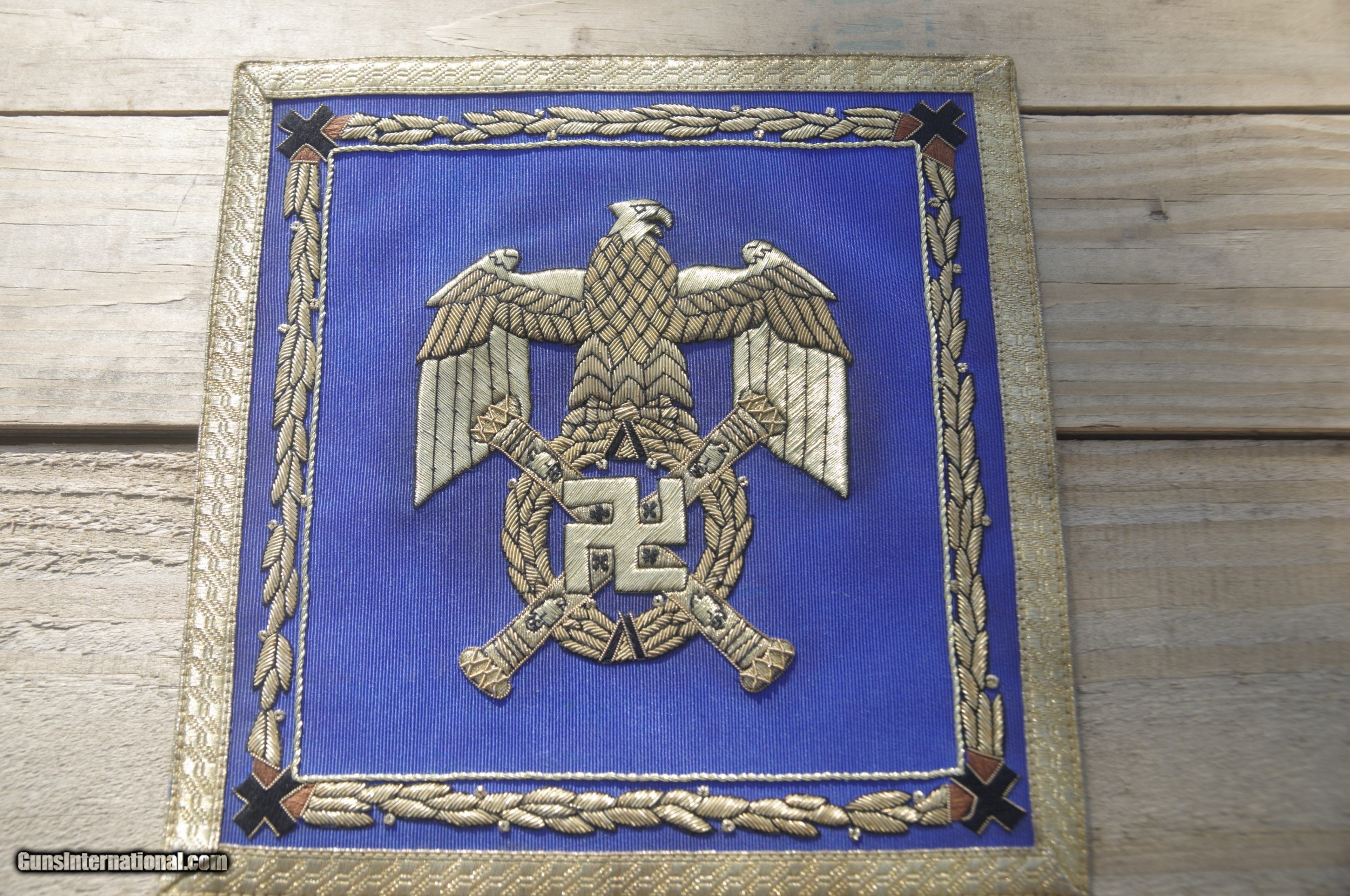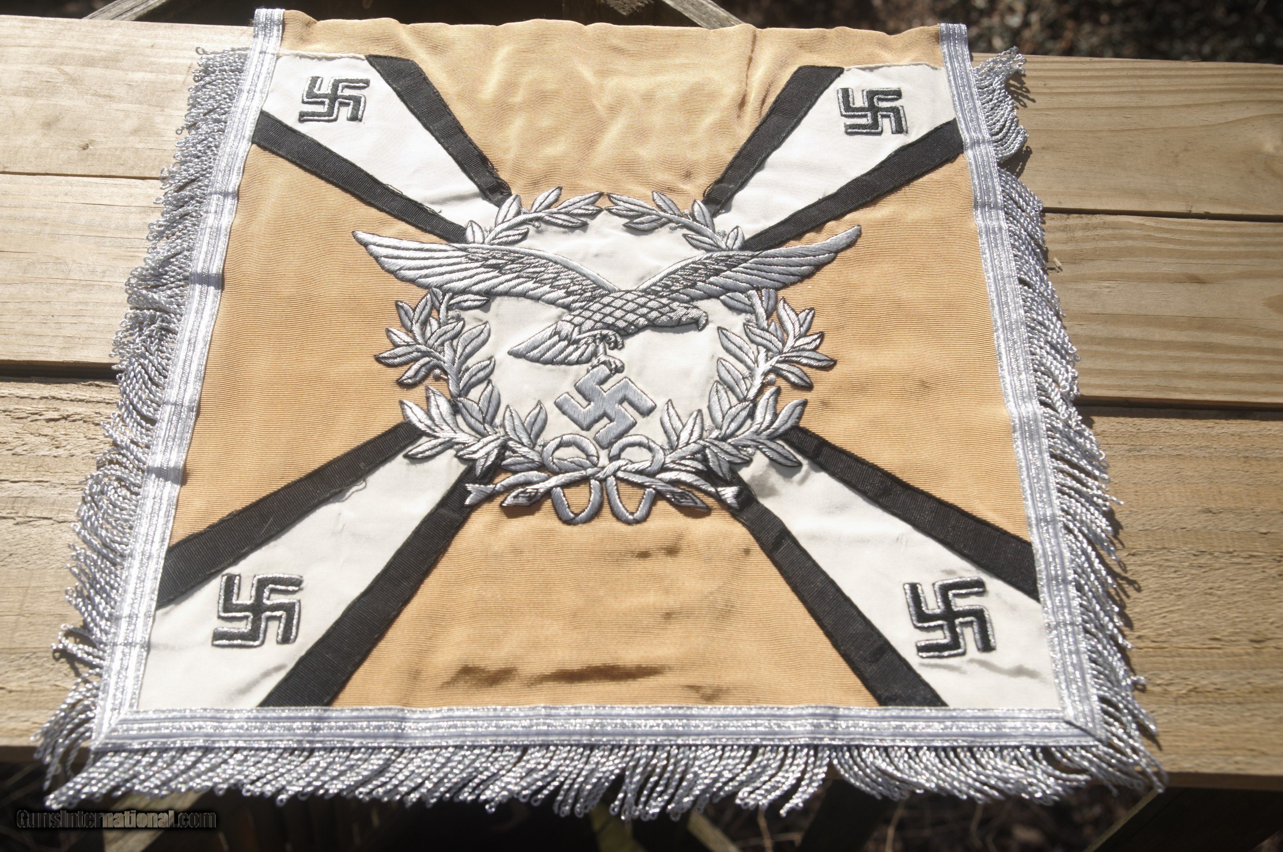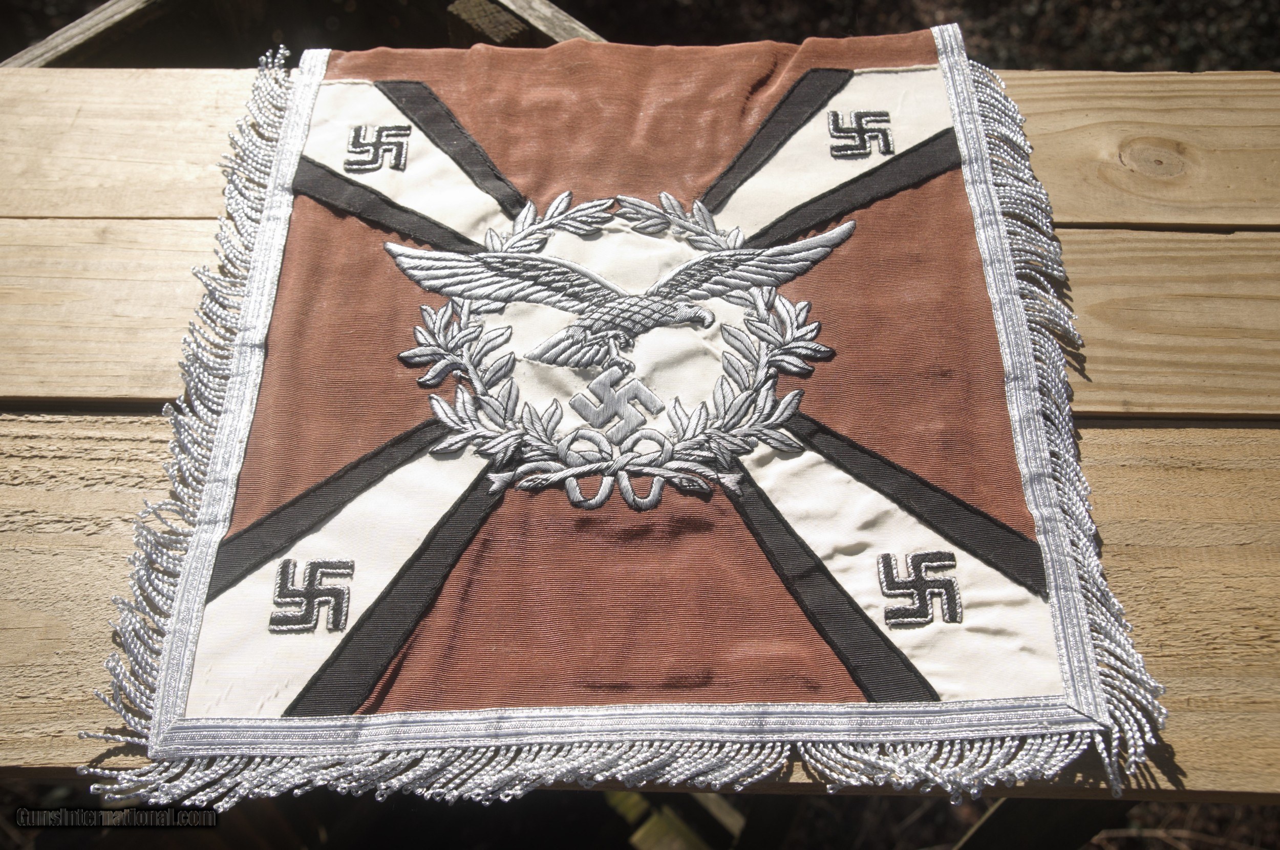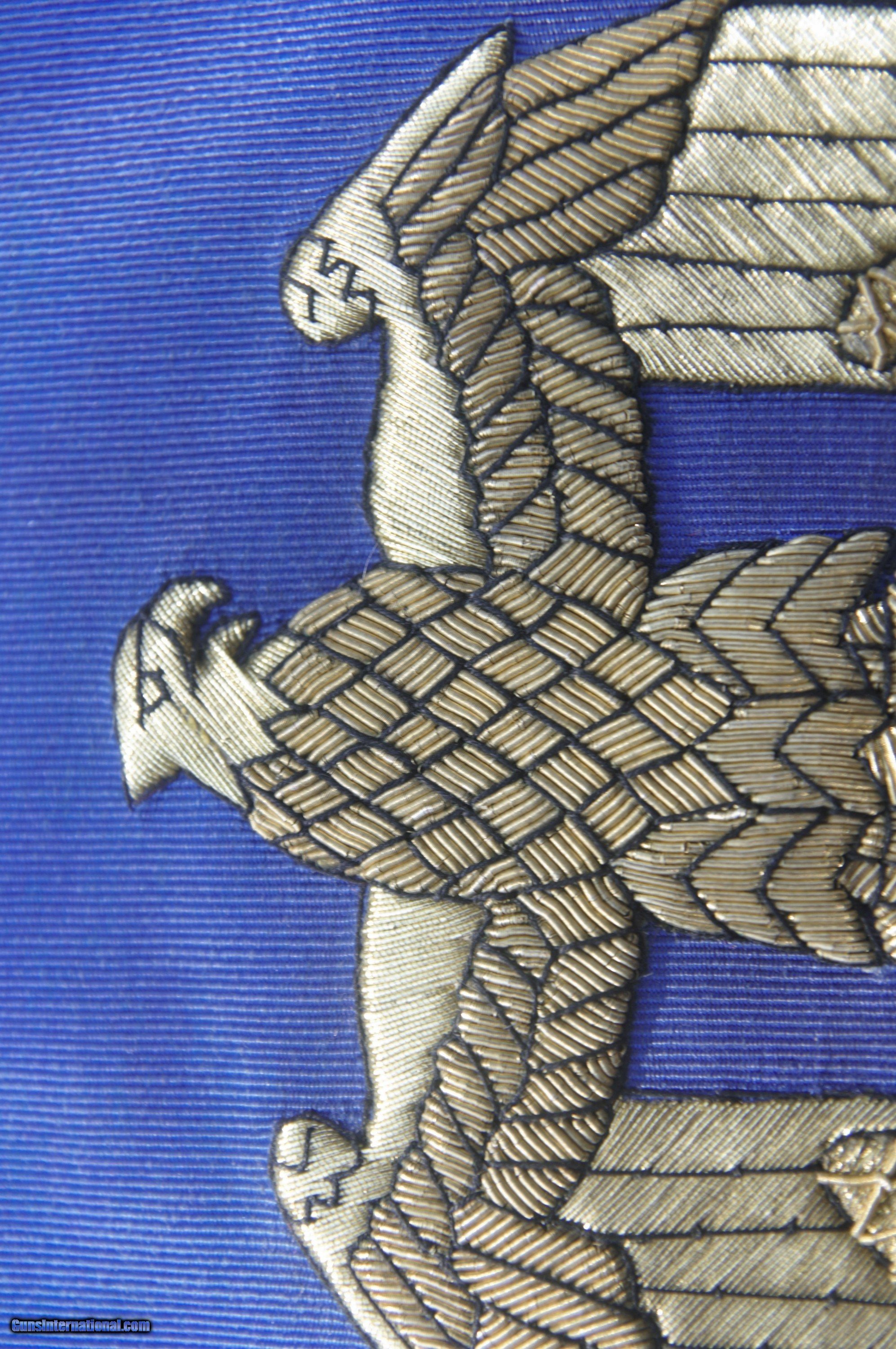 Description: I'm looking for any/allspecific information about these banners. If anyone has seen or knows exactly what these were used for, please contact me with the documentation you have. I have not been able to find any reference or information that shows they could be reproductions, but if that information exists, I very much want to know that too.. These are consigned to me to sell and I'm not sure exactly what these are so I can't sell them until I know. I have never encountered anything exactly like these. I have searched the internet and cannot locate any idintical duplicates of these. These are really well made but there certainly are reproduction Third Reich copies of swallowtail flags and schellenbalm banners that are also well made and hand embroidered. The base material is ribbed silk. The white rays and black borders are hand stitched with the bullion embroidery hand done over what appears to be an unterlagen pattern. The black detail stitching appears to also be hand done as is all bullion embroidery. These pictures don't do these justice, collors and details are more vibrant viewed in person.. More detailed pictures are available of these, just ask. Thanks, Mark SOLD |