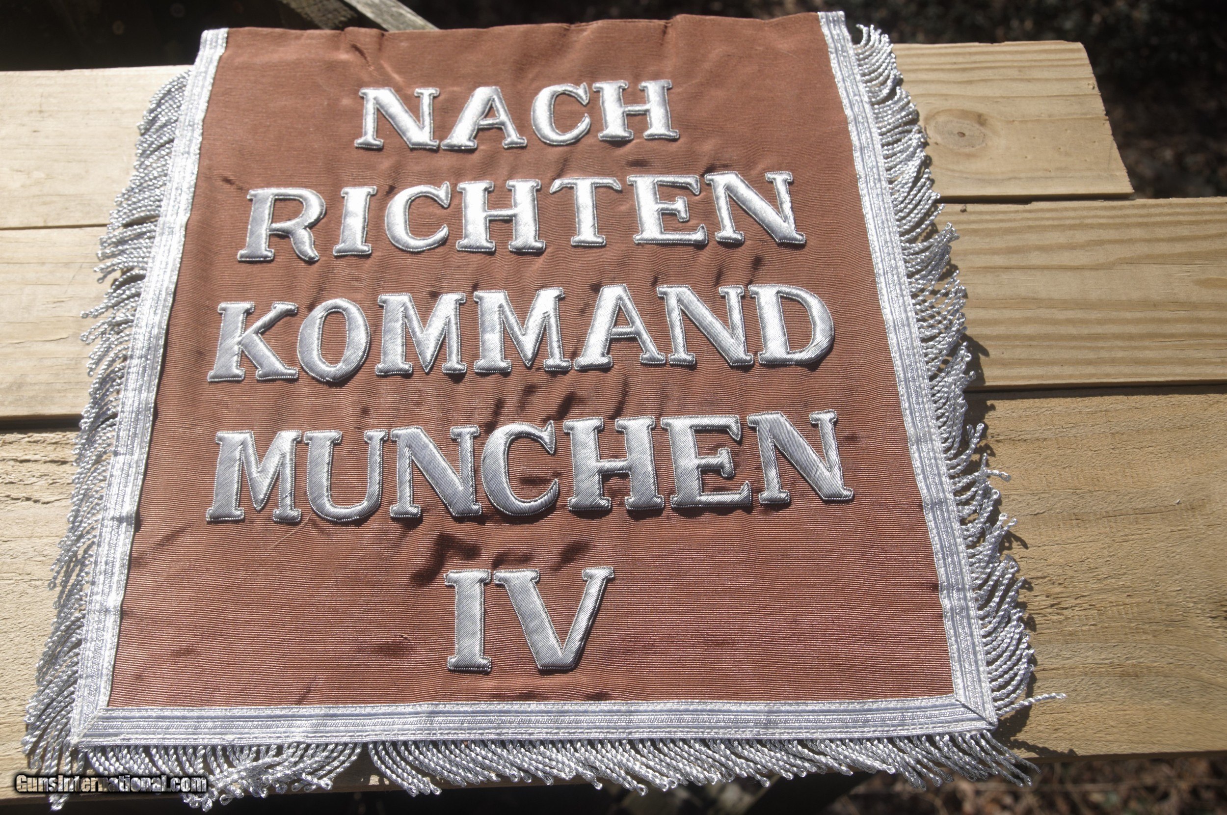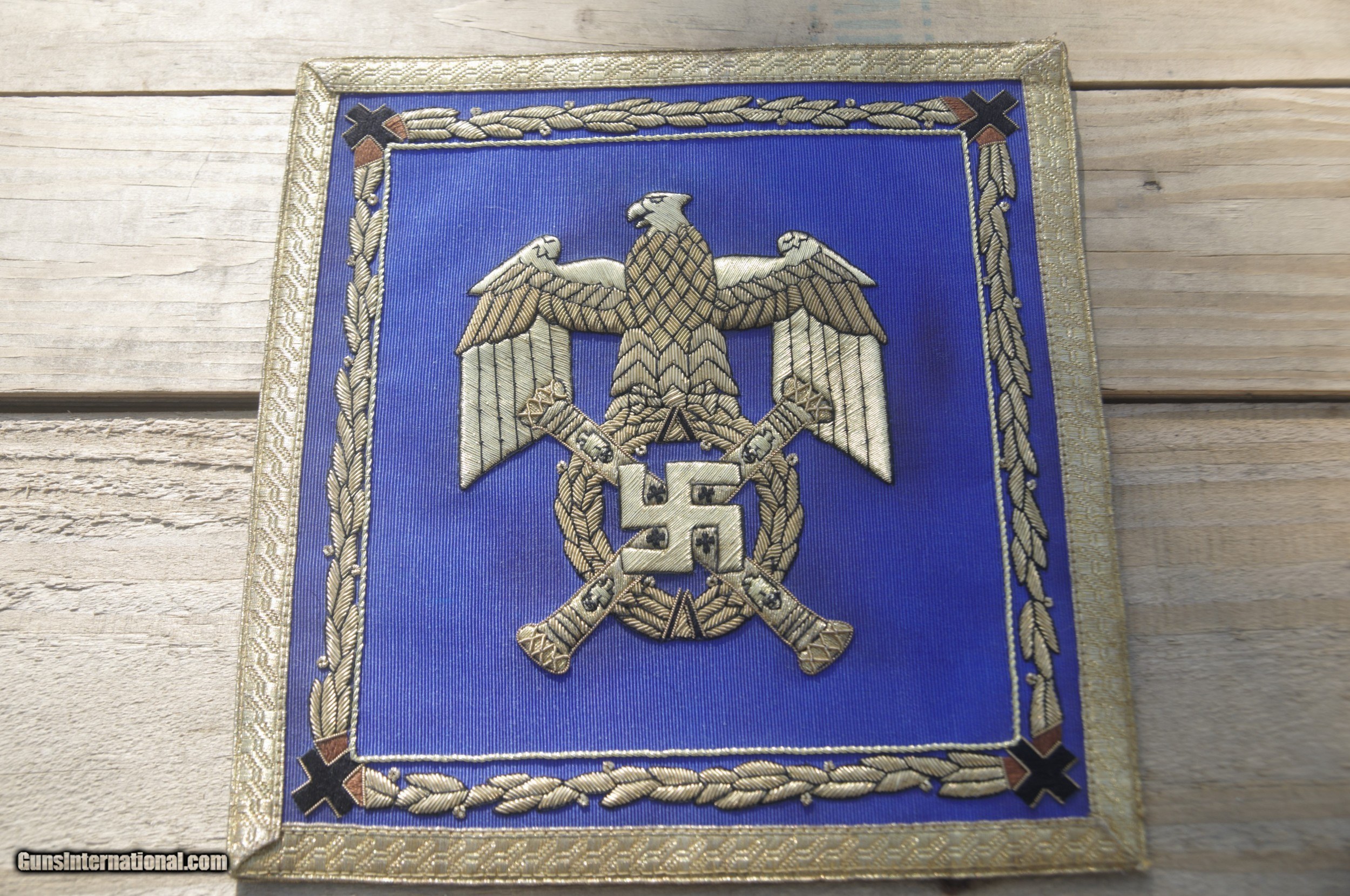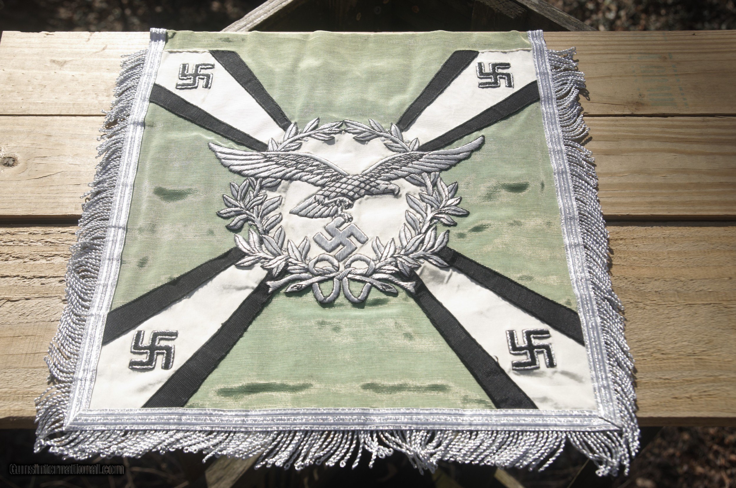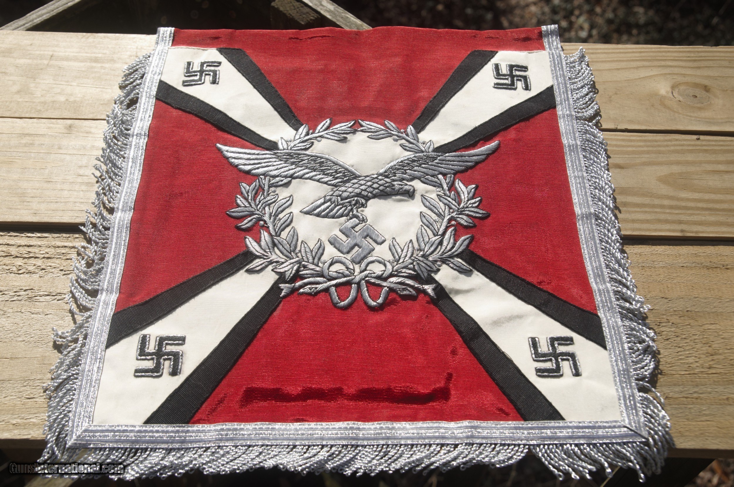 Description: I'm looking for any/allspecific information about these banners. If anyone has seen or knows exactly what these were used for, please contact me with the documentation you have. I have not been able to find any reference or information that shows they could be reproductions, but if that information exists, I very much want to know that too.. These are consigned to me to sell and I'm not sure exactly what these are so I can't sell them until I know. I have never encountered anything exactly like these. I have searched the internet and cannot locate any idintical duplicates of these. These are really well made but there certainly are reproduction Third Reich copies of swallowtail flags and schellenbalm banners that are also well made and hand embroidered. The base material is ribbed silk. The white rays and black borders are hand stitched with the bullion embroidery hand done over what appears to be an unterlagen pattern. The black detail stitching appears to also be hand done as is all bullion embroidery. These pictures don't do these justice, collors and details are more vibrant viewed in person.. More detailed pictures are available of these, just ask. Thanks, Mark SOLD |