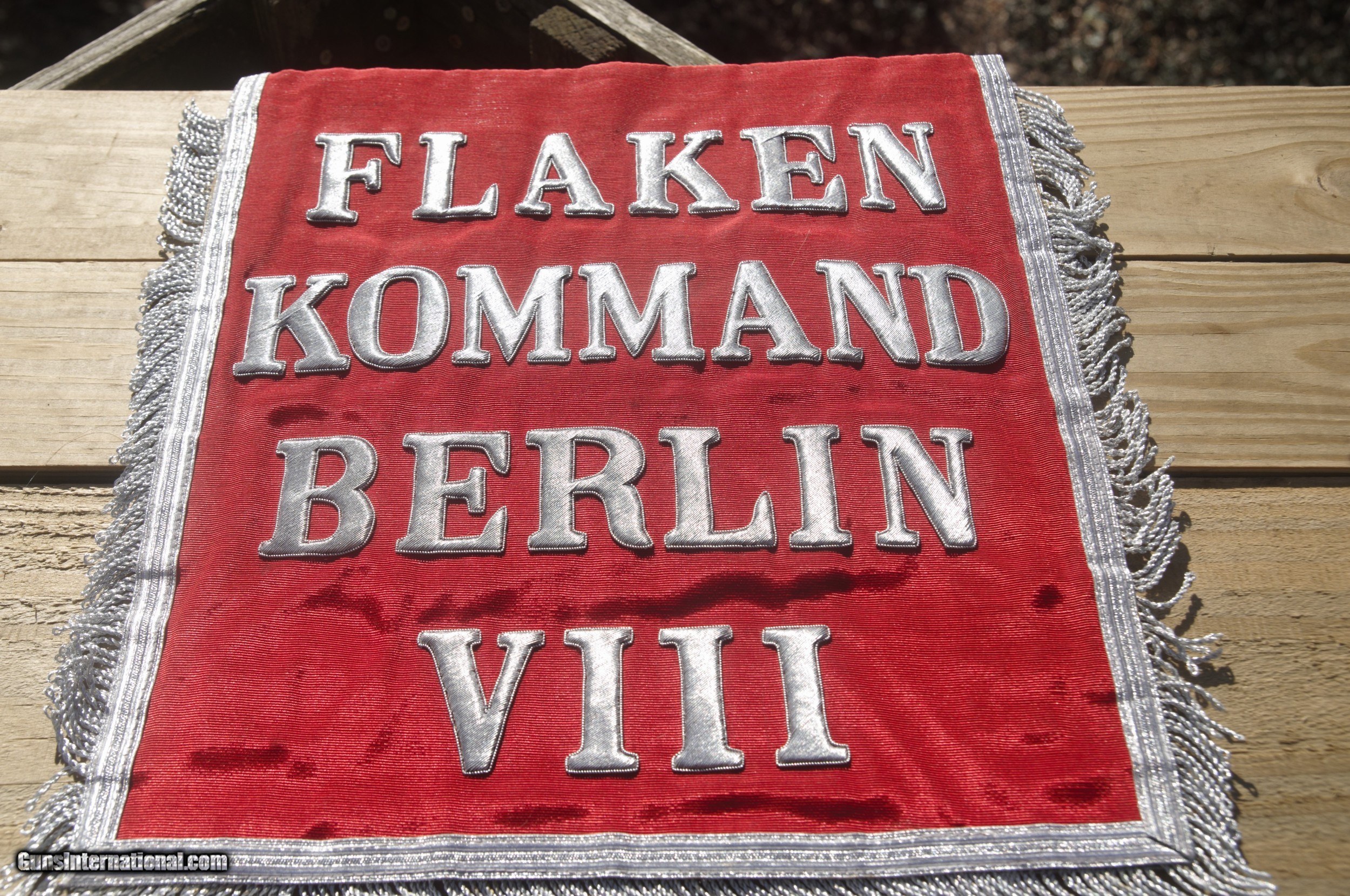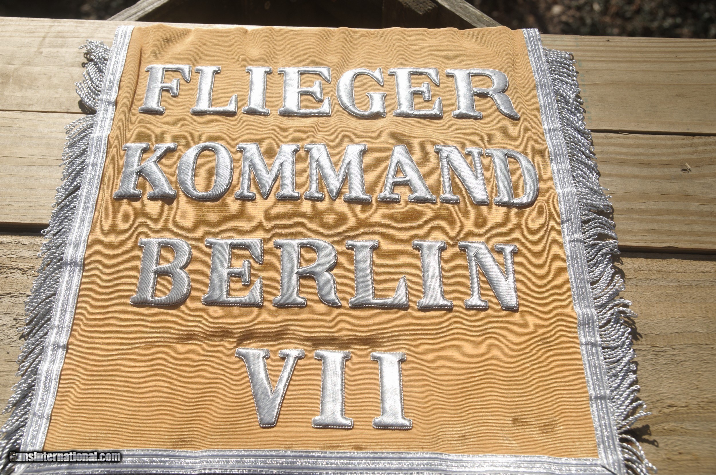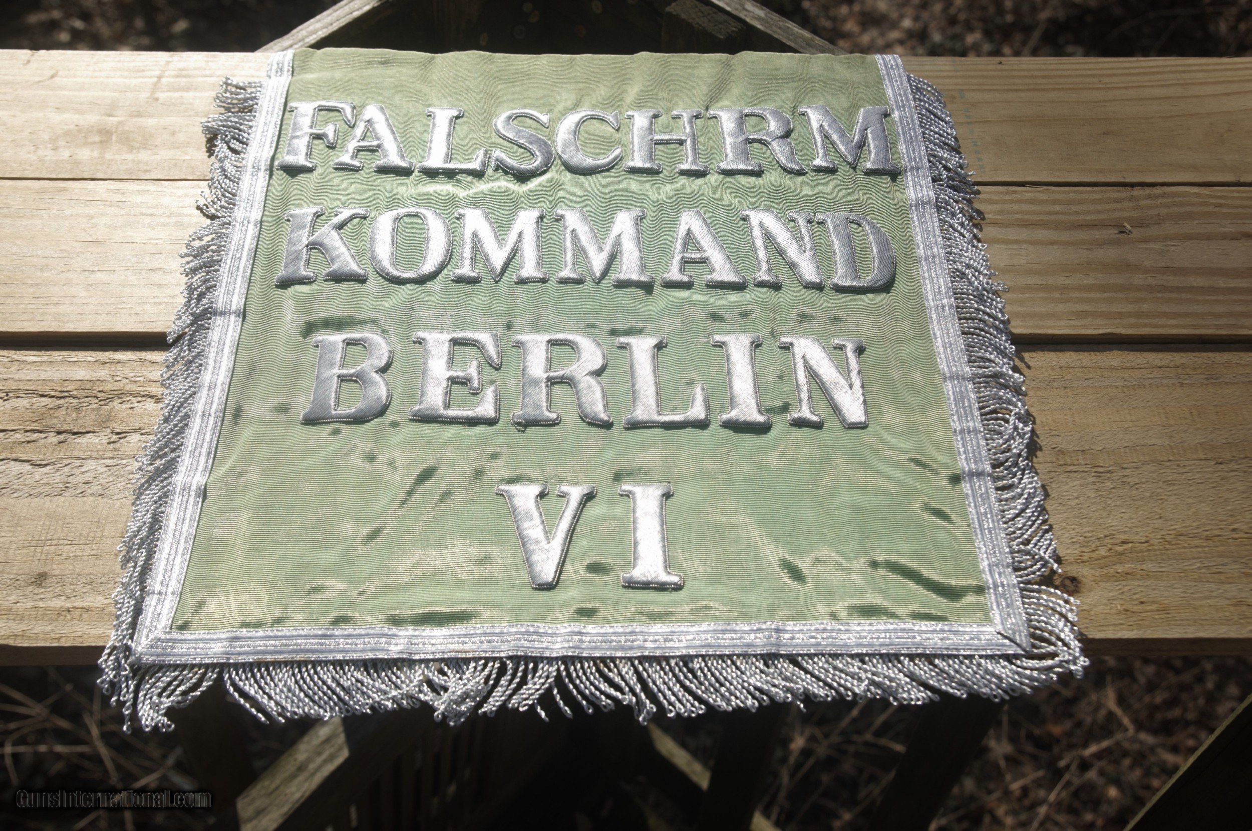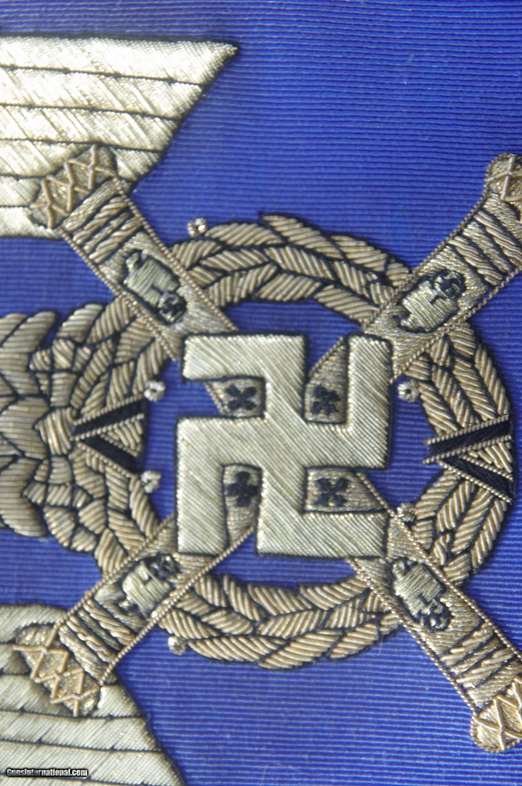 Description: I'm looking for any/allspecific information about these banners. If anyone has seen or knows exactly what these were used for, please contact me with the documentation you have. I have not been able to find any reference or information that shows they could be reproductions, but if that information exists, I very much want to know that too.. These are consigned to me to sell and I'm not sure exactly what these are so I can't sell them until I know. I have never encountered anything exactly like these. I have searched the internet and cannot locate any idintical duplicates of these. These are really well made but there certainly are reproduction Third Reich copies of swallowtail flags and schellenbalm banners that are also well made and hand embroidered. The base material is ribbed silk. The white rays and black borders are hand stitched with the bullion embroidery hand done over what appears to be an unterlagen pattern. The black detail stitching appears to also be hand done as is all bullion embroidery. These pictures don't do these justice, collors and details are more vibrant viewed in person.. More detailed pictures are available of these, just ask. Thanks, Mark SOLD |