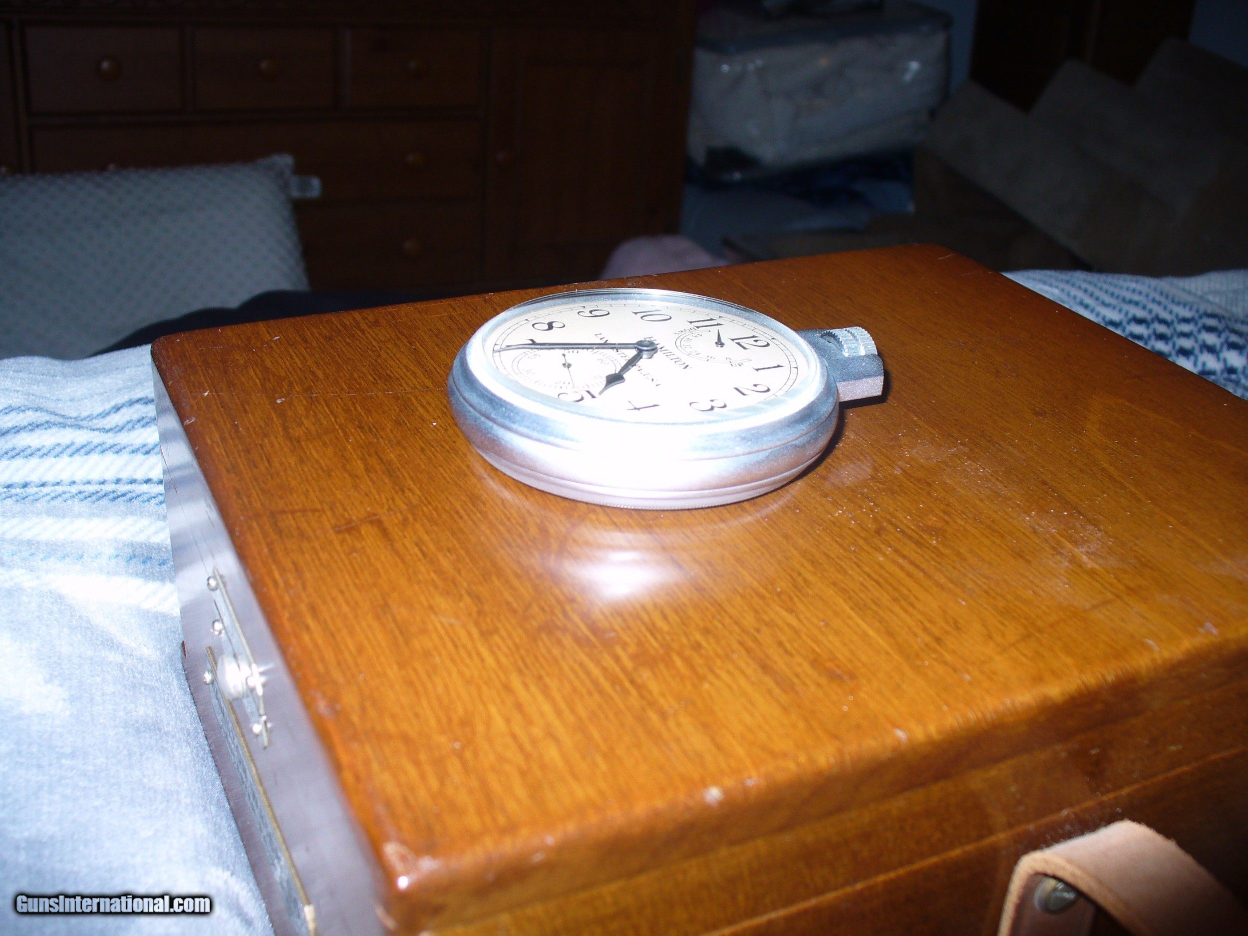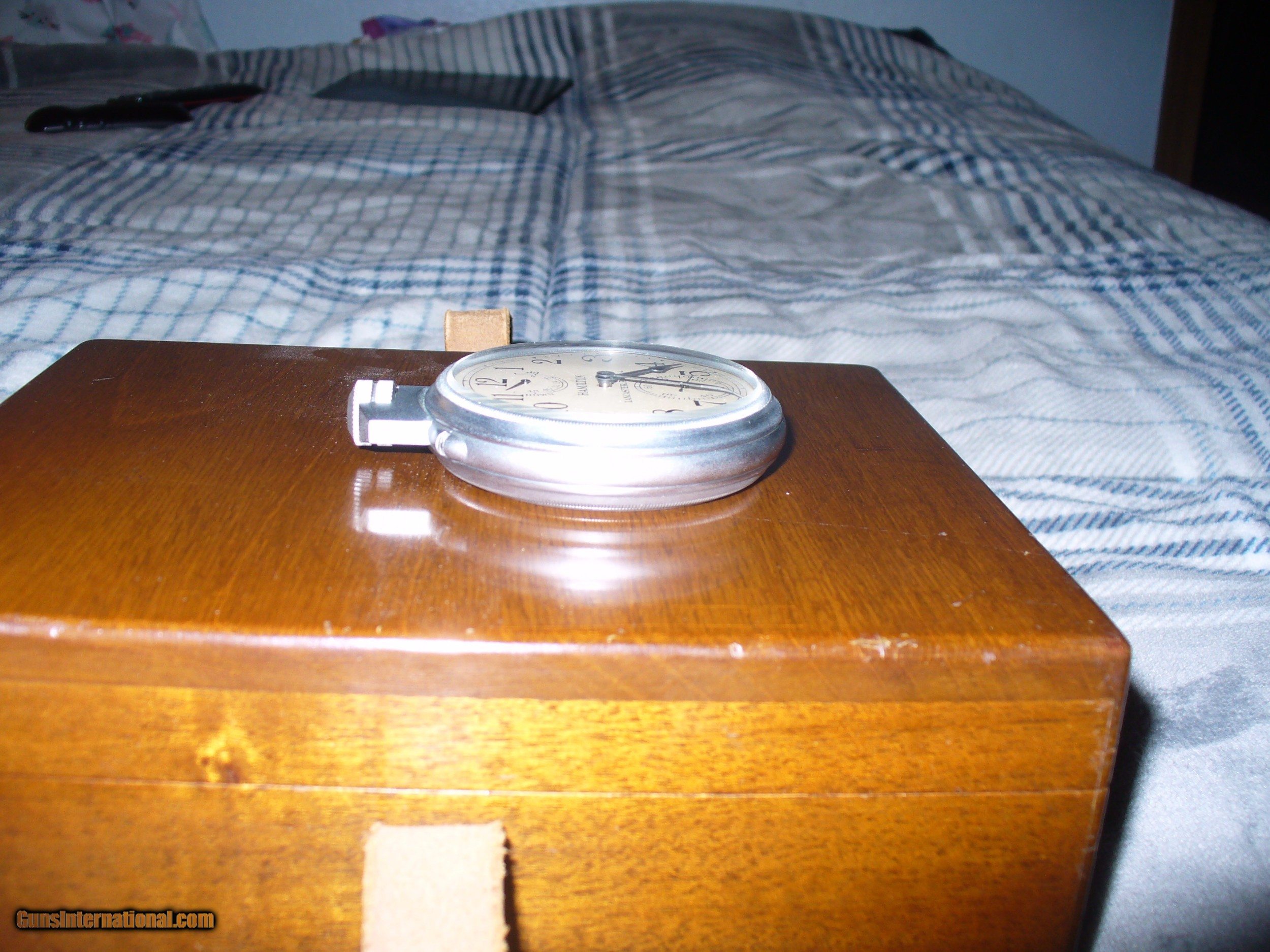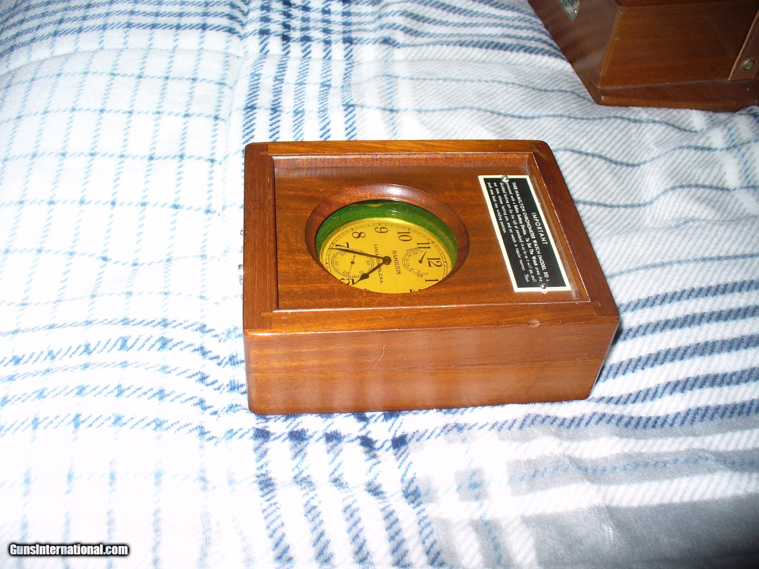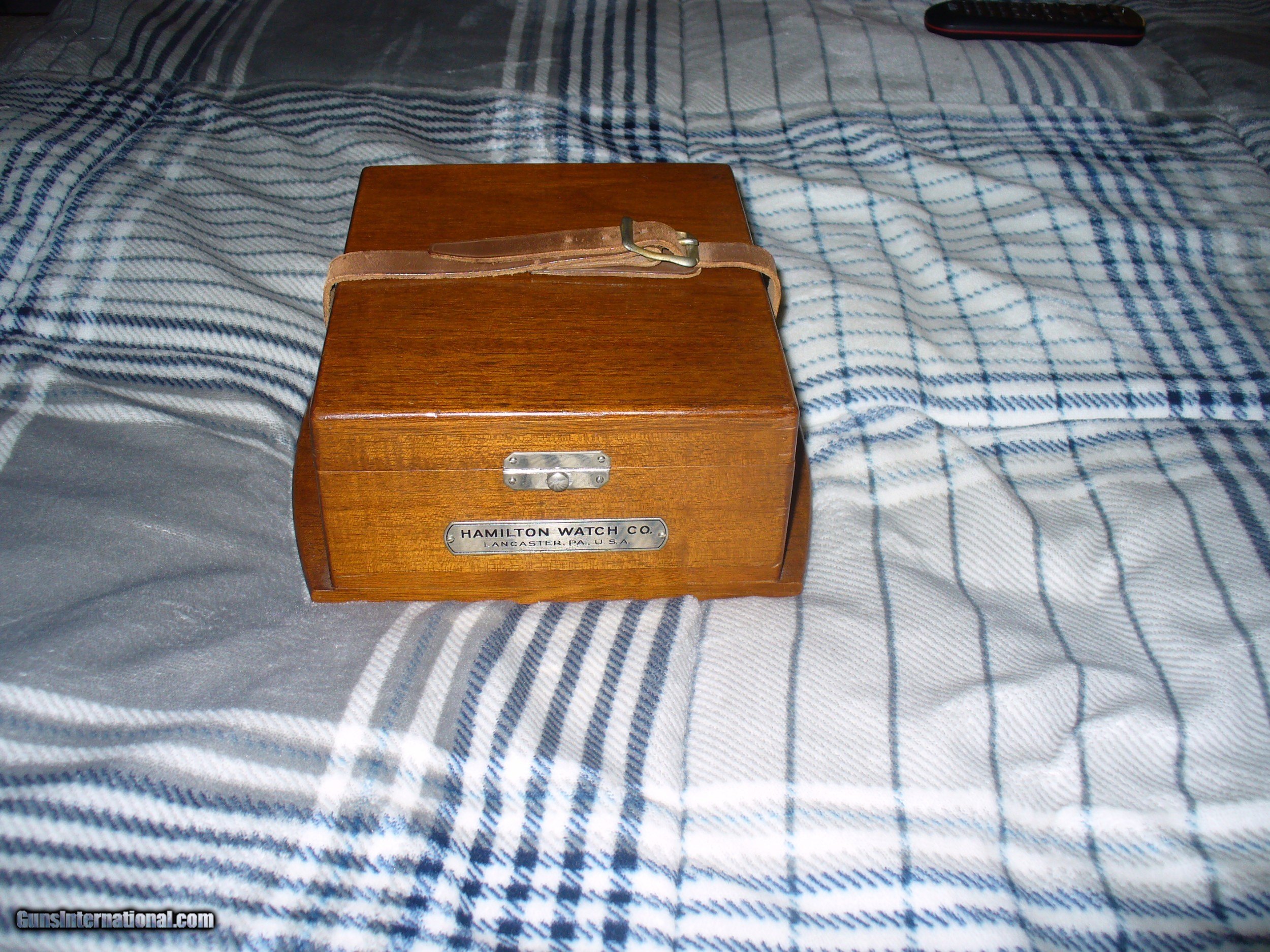 Description: This is a rare opportunity to purchase one of the finest timepieces ever produced in America! This Hamilton Model 22 comes complete with BOTH of its original wood cases in better than excellent condition, the movement is nearly flawless, the case has no scratches or wear of any kind, the crystal is scratch and wear free, the dial and hands are perfect, and the case is marked 'H.S. 2' for the British Hydrogaphical Service and the number '2' which denotes this watch as chronometer grade, meaning that it is suitable for use as a primary navigation aid for longitude. This watch is complete as originally issued given that the serial number on the case and movement are a match. This timepiece runs and keeps excellent time. The US Navy examples were not marked with the serial number of the movement on the case and most examples are not original movement/case pairs; this one is, and it is in such fine condition that it will require a complete NOS example to improve upon it! These Model 22's with Admiralty markings are hard to find in any condition! Don't let this one slip by. Shipping to USA addresses only. SOLD |