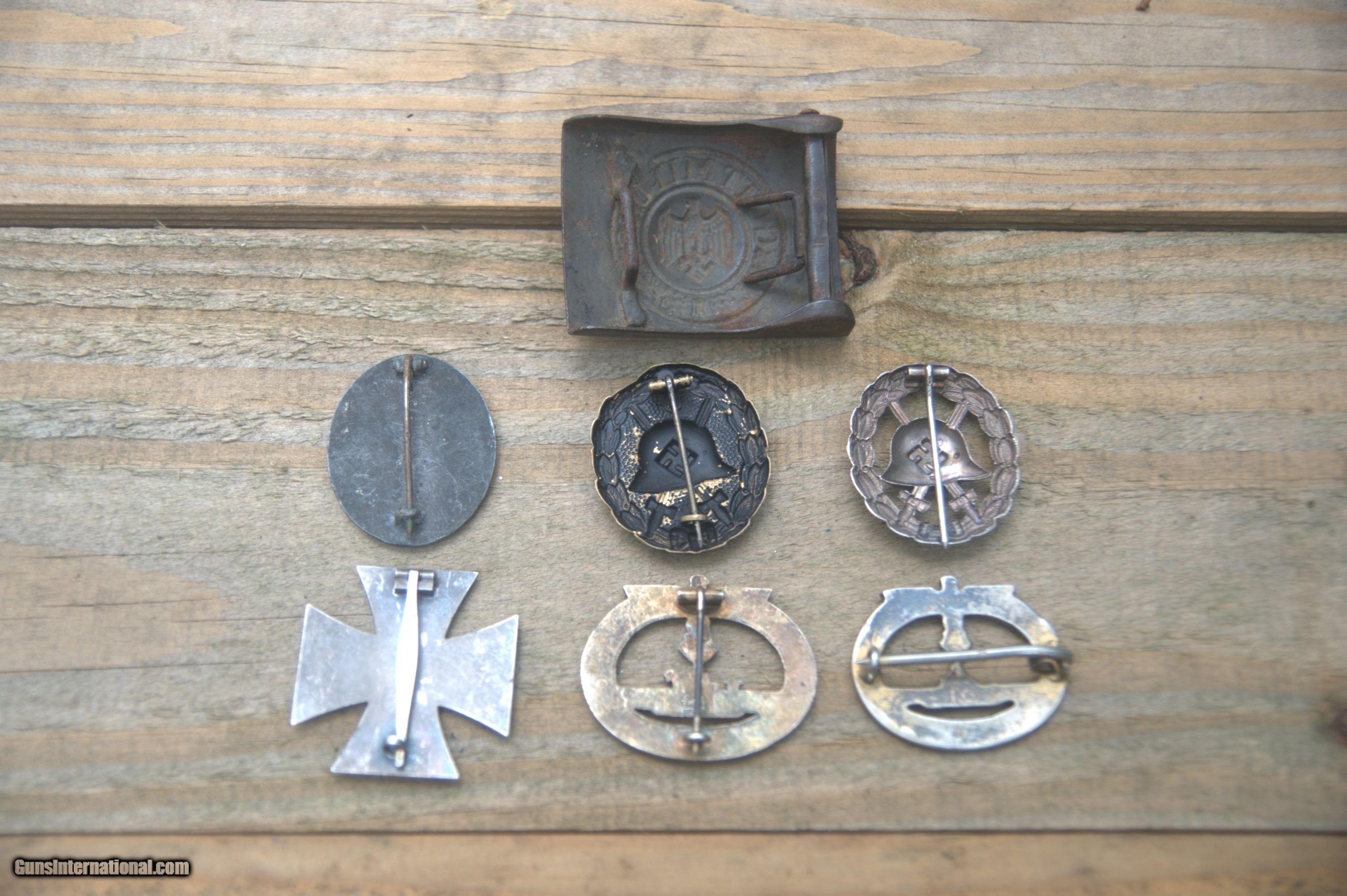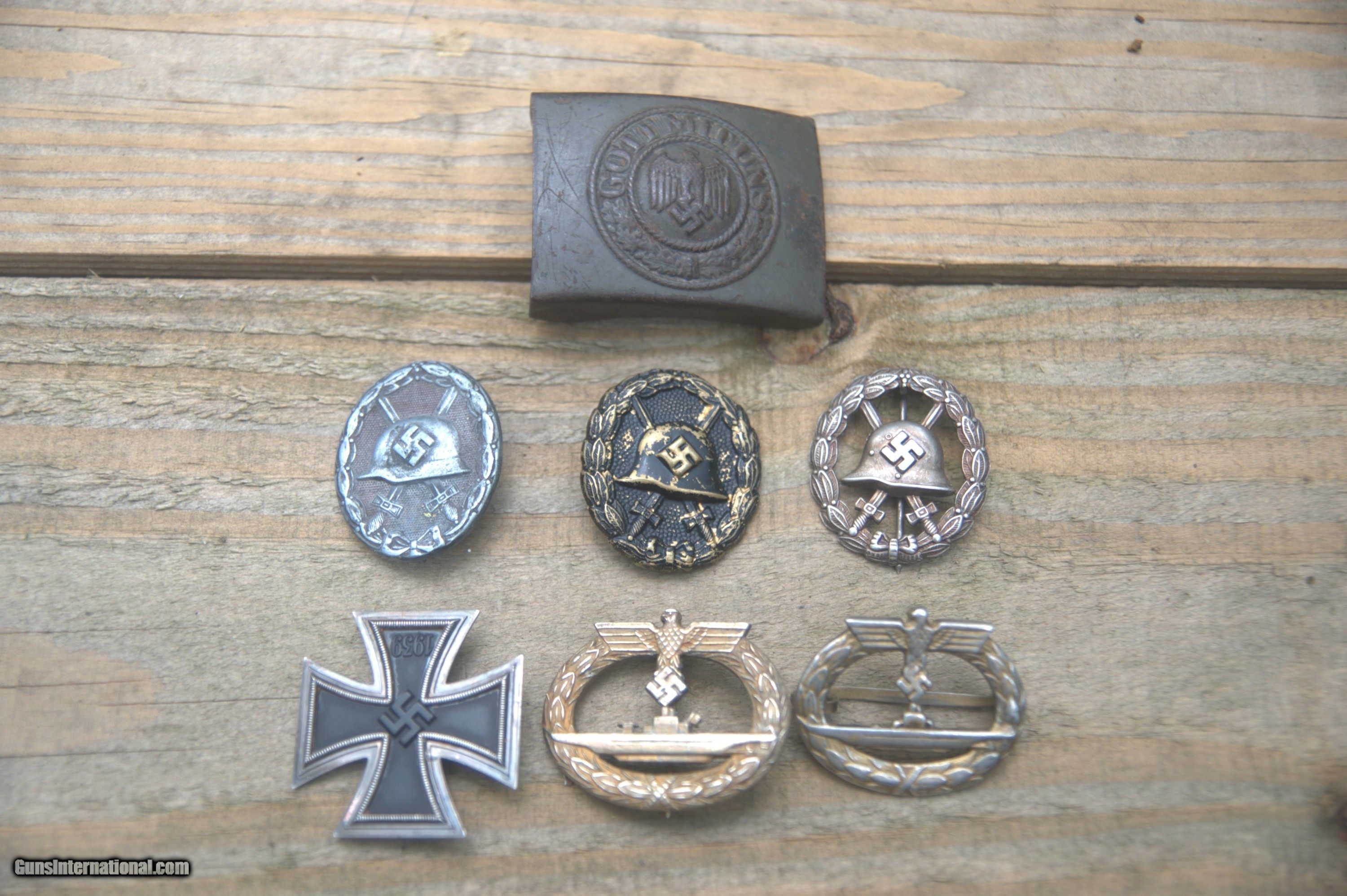 Description: An interesting group of original German WW 2 badges and awards including, IC 1st class marked on pin #7 excellent condition magnetic core, second pattern Silver Wound Badge marked 4 on the pin, two first pattern 'Condor' Wound Badges as shown one missing catch both unmarked, original U-Boat Badge by f.o. with a Jeweler copy of that badge marked 925 on pin with pics showing the pin and catch assemb;y on the copy, German Army EM belt plate maker marked difficult to read from corrosion. These are from an estate sale and are being offered together as they came together. Contact me for views not offered here. SH&I Priority Mail with tracking in the lower 48 is $15.00. I will ship internationally, contact me for that cost. Thanks, Mark SOLD |