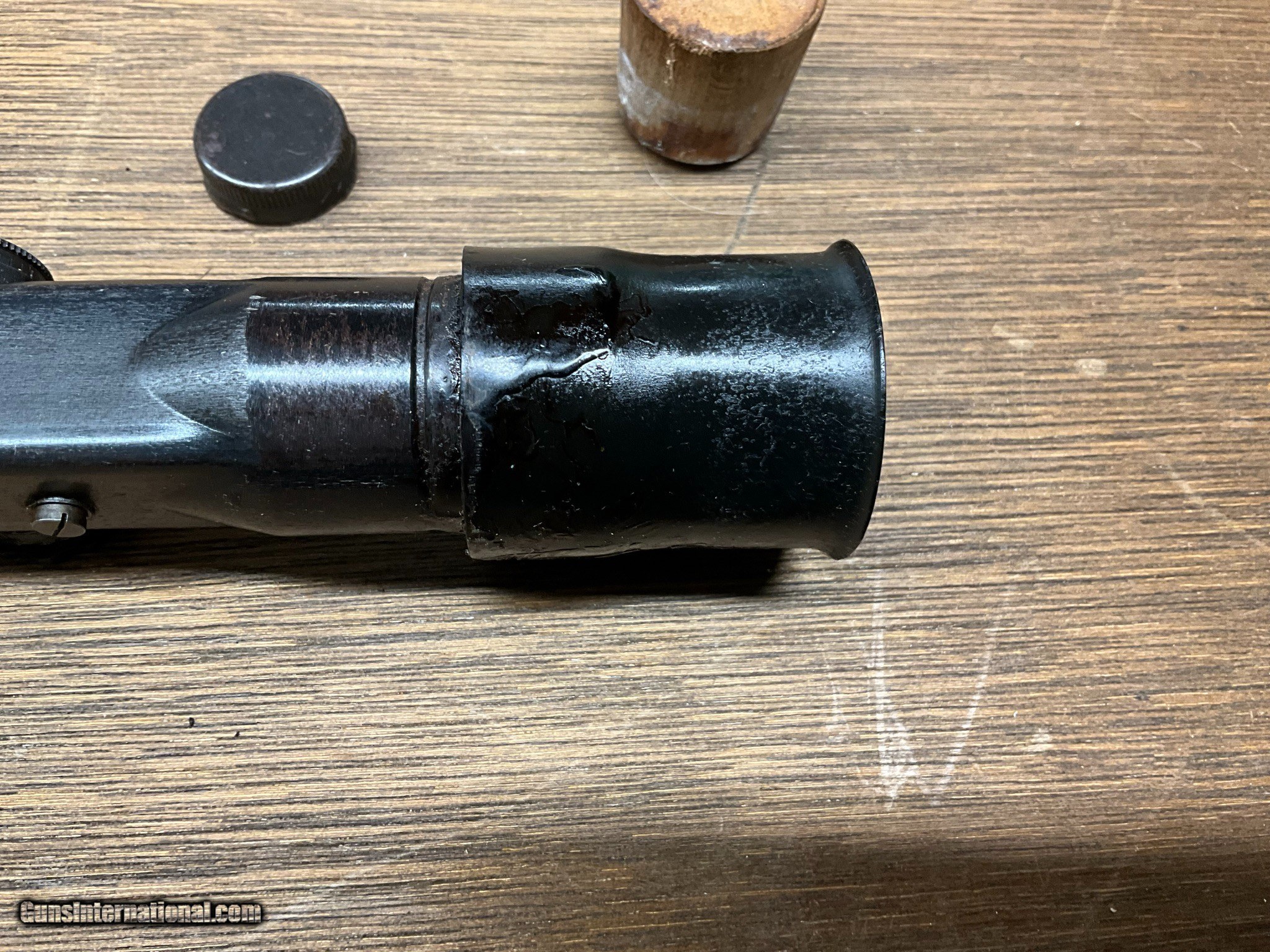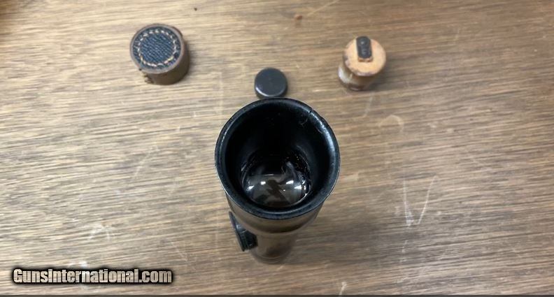 Description: *** Sold Pending Funds *** This Germany K43 scope was brought home by a WW2 vet as a war trophy. Scope includes wooden plug on one end and leather cap on the other. The connecting strap is missing. The rubber eye shield is in good shape. Standard 3 Post Reticle is intact. Windage and elevation adjustments appear to be working. Scope is getting cloudy. Open to a reasonable offer by a knowledgeable individual. Shipping $25. Buyer is intitled to a 5-day inspection period. All postage and insurance will be incurred by purchaser. Sales Tax charged only to PA residents (6% sales tax on item price plus shipping or supply resale certification). Sorry, Credit Card are no longer accepted (monthly fees are too high for a small volume dealer). Money Order or Check. US Postal MO prefered. We have been in business for 40 years and have 100% positive feedback on GA. SOLD |